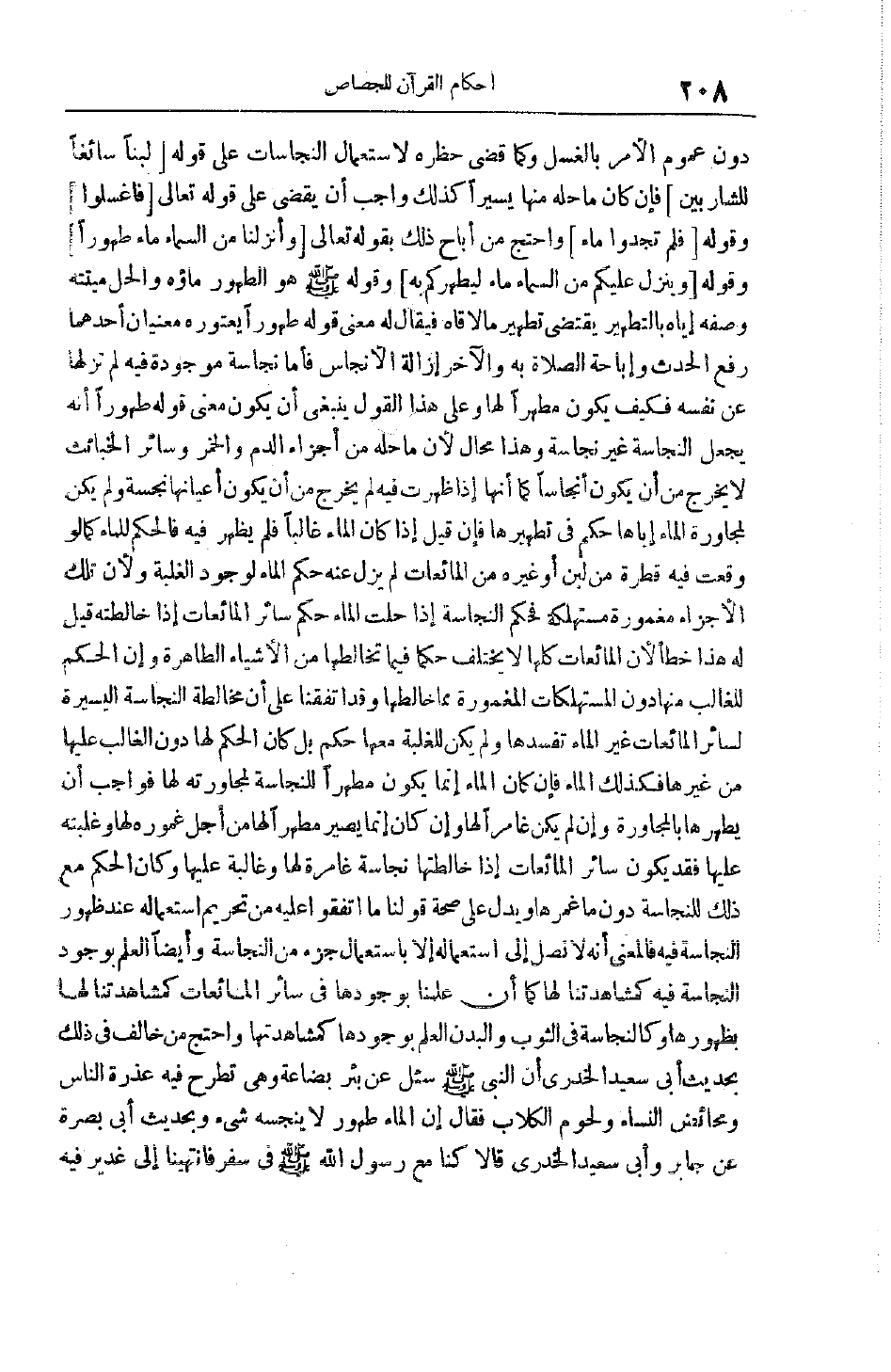 دُونَ عُمُومِ الْأَمْرِ بِالْغُسْلِ وَكَمَا قَضَى حَظْرَهُ لِاسْتِعْمَالِ النَّجَاسَاتِ عَلَى قَوْلِهِ لَبَناً خالِصاً سائِغاً لِلشَّارِبِينَ فإن كان ماحله مِنْهَا يَسِيرًا كَذَلِكَ وَاجِبٌ أَنْ يُقْضَى عَلَى قوله تعالى فَاغْسِلُوا وقوله فَلَمْ تَجِدُوا ماءً وَاحْتَجَّ مَنْ أَبَاحَ ذَلِكَ بِقَوْلِهِ تَعَالَى وَأَنْزَلْنا مِنَ السَّماءِ ماءً طَهُوراً وَقَوْلِهِ وَيُنَزِّلُ عَلَيْكُمْ مِنَ السَّماءِ مَاءً لِيُطَهِّرَكُمْ بِهِ