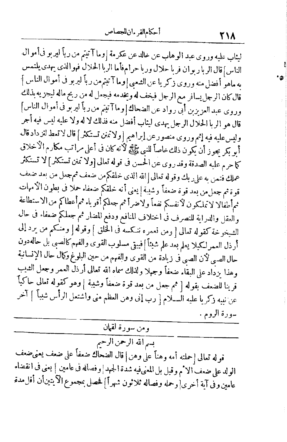 لِيُثَابَ عَلَيْهِ وَرَوَى عَبْدُ الْوَهَّابِ عَنْ خَالِدٍ عن عكرمة وَما آتَيْتُمْ مِنْ رِباً لِيَرْبُوَا فِي أَمْوالِ النَّاسِ قَالَ الرِّبَا ربوان فَرِبَا حَلَالٌ وَرِبًا حَرَامٌ فَأَمَّا الرِّبَا الْحَلَالُ فَهُوَ الَّذِي يُهْدَى يُلْتَمَسُ بِهِ مَا هُوَ أَفْضَلُ مِنْهُ وَرَوَى زَكَرِيَّا عن الشعبي وَما آتَيْتُمْ مِنْ رِباً لِيَرْبُوَا فِي أَمْوالِ النَّاسِ قَالَ كَانَ الرَّجُلُ يُسَافِرُ مَعَ الرَّجُلِ فَيَخِفُّ لَهُ وَيَخْدُمُهُ فَيَجْعَلُ لَهُ مِنْ رِبْحِ مَالِهِ لِيَجْزِيَهُ بِذَلِكَ وَرَوَى عَبْدُ الْعَزِيزِ بْنُ أَبِي رَوَّادٍ عَنْ الضَّحَّاكِ وَما آتَيْتُمْ مِنْ رِباً لِيَرْبُوَا فِي أَمْوالِ النَّاسِ قَالَ هُوَ الرِّبَا الْحَلَالُ الرَّجُلُ يُهْدِي لِيُثَابَ أَفْضَلَ مِنْهُ فَذَلِكَ لَا لَهُ وَلَا عَلَيْهِ لَيْسَ فِيهِ أَجْرٌ وَلَيْسَ عَلَيْهِ فِيهِ إثْمٌ وَرَوَى مَنْصُورٌ عَنْ إبْرَاهِيمَ وَلا تَمْنُنْ تَسْتَكْثِرُ قال لا تعط التزداد قال أبو بكر أن يَجُوزُ أَنْ يَكُونَ ذَلِكَ خَاصًّا لِلنَّبِيِّ صَلَّى اللَّه عَلَيْهِ وَسَلَّمَ لِأَنَّهُ كَانَ فِي أَعْلَى مَرَاتِبِ مَكَارِمِ الْأَخْلَاقِ كَمَا حَرَّمَ عَلَيْهِ الصَّدَقَةَ وَقَدْ رُوِيَ عَنْ الْحَسَنِ فِي قَوْله تَعَالَى وَلا تَمْنُنْ تَسْتَكْثِرُ لَا تَسْتَكْثِرْ عَمَلَك فَتَمُنَّ بِهِ عَلَى رَبِّك وقَوْله تَعَالَى اللَّهُ الَّذِي خَلَقَكُمْ مِنْ ضَعْفٍ ثُمَّ جَعَلَ مِنْ بَعْدِ ضَعْفٍ قُوَّةً ثُمَّ جَعَلَ مِنْ بَعْدِ قُوَّةٍ ضَعْفاً وَشَيْبَةً يَعْنِي أَنَّهُ خَلَقَكُمْ ضُعَفَاءَ حَمْلًا فِي بُطُونِ الْأُمَّهَاتِ ثُمَّ أَطْفَالًا لَا تَمْلِكُونَ لِأَنْفُسِكُمْ نَفْعًا وَلَا ضَرًّا ثُمَّ جَعَلَكُمْ أَقْوِيَاءَ ثُمَّ أَعْطَاكُمْ مِنْ الِاسْتِطَاعَةِ وَالْعَقْلِ وَالدِّرَايَةِ لِلتَّصَرُّفِ فِي اخْتِلَافِ الْمَنَافِعِ وَدَفْعِ الْمَضَارِّ ثُمَّ جَعَلَكُمْ ضُعَفَاءَ فِي حَالِ الشَّيْخُوخَةِ كَقَوْلِهِ تَعَالَى وَمَنْ نُعَمِّرْهُ نُنَكِّسْهُ فِي الْخَلْقِ وَقَوْلِهِ وَمِنْكُمْ مَنْ يُرَدُّ إِلى أَرْذَلِ الْعُمُرِ لِكَيْ لا يَعْلَمَ بَعْدَ عِلْمٍ شَيْئاً فَيَبْقَى مَسْلُوبُ الْقُوَى وَالْفَهْمِ كَالصَّبِيِّ بَلْ حَالُهُ دُونَ حَالِ الصَّبِيِّ لِأَنَّ الصَّبِيَّ فِي زِيَادَةٍ مِنْ الْقُوَى وَالْفَهْمِ مِنْ حِينِ الْبُلُوغِ وَكَمَالِ حَالِ الْإِنْسَانِيَّةِ وَهَذَا يَزْدَادُ عَلَى الْبَقَاءِ ضَعْفًا وَجَهْلًا وَلِذَلِكَ سَمَّاهُ اللَّهُ تَعَالَى أَرْذَلَ الْعُمُرِ وَجَعَلَ الشَّيْبَ قَرِينًا لِلضَّعْفِ بِقَوْلِهِ ثُمَّ جَعَلَ مِنْ بَعْدِ قُوَّةٍ ضَعْفاً وَشَيْبَةً وَهُوَ كَقَوْلِهِ تَعَالَى حَاكِيًا عَنْ نَبِيِّهِ زَكَرِيَّا عَلَيْهِ السَّلَامُ رَبِّ إِنِّي وَهَنَ الْعَظْمُ مِنِّي وَاشْتَعَلَ الرَّأْسُ شَيْباً آخر سورة الروم.