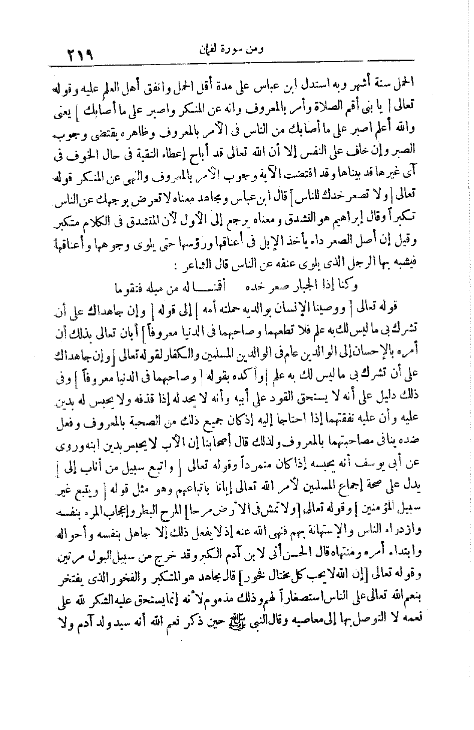 قَوْله تَعَالَى وَلا تُصَعِّرْ خَدَّكَ لِلنَّاسِ قَالَ ابْنُ عَبَّاسٍ وَمُجَاهِدٌ مَعْنَاهُ لَا تُعْرِضْ بِوَجْهِك عَنْ النَّاسِ تَكَبُّرًا وَقَالَ إبْرَاهِيمُ هُوَ التشدق ومعناه يرجع إلى الأول لأن المتشدق فِي الْكَلَامِ مُتَكَبِّرٌ وَقِيلَ إنَّ أَصْلَ الصَّعَرِ داء يأخذ الإبل في أعناقها ورؤسها حَتَّى يَلْوِيَ وُجُوهَهَا وَأَعْنَاقَهَا فَيُشَبِّهُ بِهَا الرَّجُلَ الَّذِي يَلْوِي عُنُقَهُ عَنْ النَّاسِ قَالَ الشَّاعِرُ: