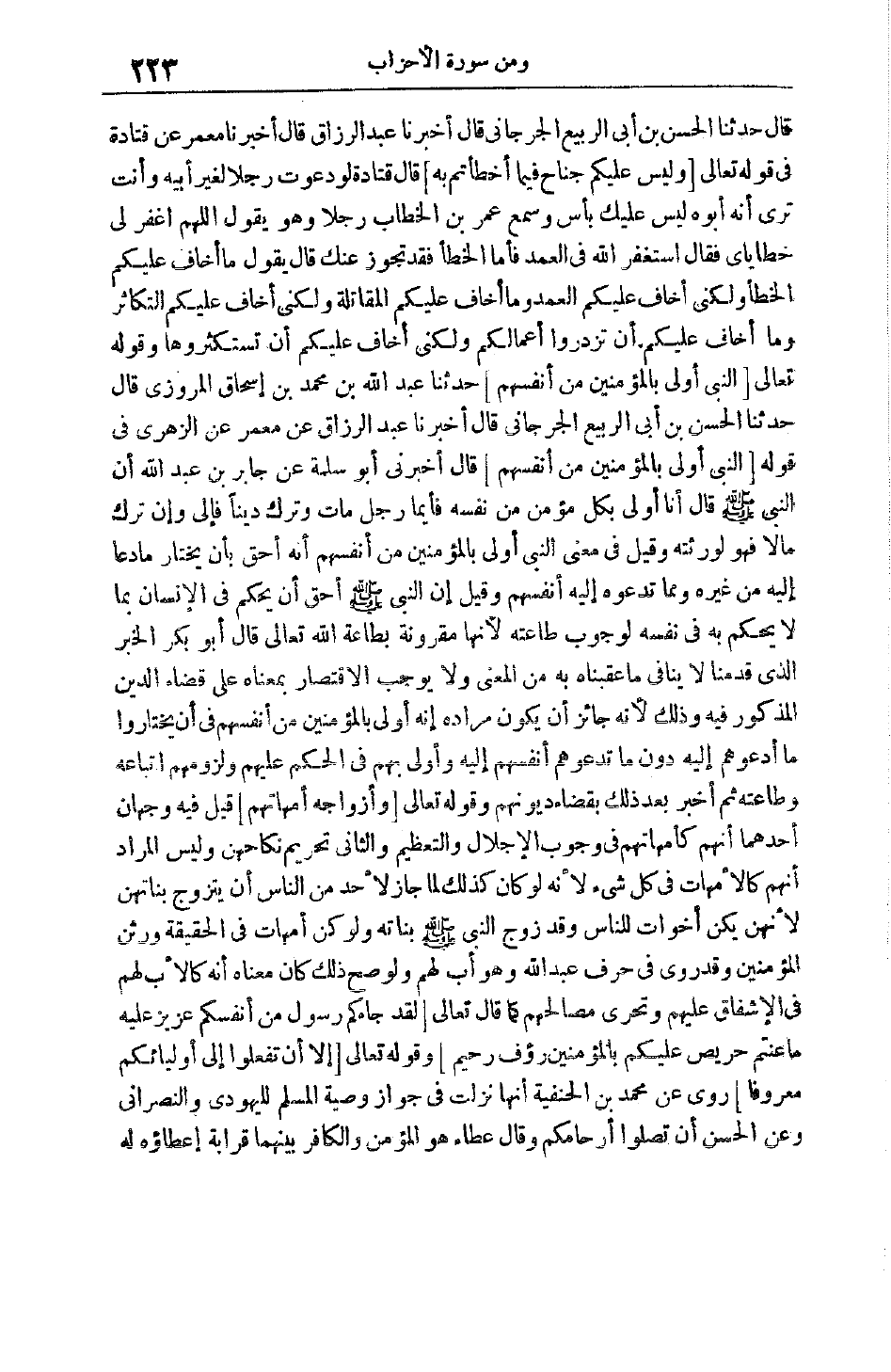 قَالَ حَدَّثَنَا الْحَسَنُ بْنُ أَبِي الرَّبِيعِ الْجُرْجَانِيُّ قَالَ أَخْبَرَنَا عَبْدُ الرَّزَّاقِ قَالَ أَخْبَرَنَا مَعْمَرٌ عَنْ قَتَادَةَ فِي قَوْله تَعَالَى وَلَيْسَ عَلَيْكُمْ جُناحٌ فِيما أَخْطَأْتُمْ بِهِ قَالَ قَتَادَةُ لَوْ دَعَوْت رَجُلًا لِغَيْرِ أَبِيهِ وَأَنْتَ تَرَى أَنَّهُ أَبُوهُ لَيْسَ عَلَيْك بَأْسٌ وَسَمِعَ عُمَرُ بْنُ الْخَطَّابِ رَجُلًا وَهُوَ يَقُولُ اللَّهُمَّ اغْفِرْ لِي خَطَايَايَ فَقَالَ اسْتَغْفِرْ اللَّهَ فِي الْعَمْدِ فَأَمَّا الْخَطَأُ فَقَدْ تَجَوَّزَ عَنْك قال يَقُولُ مَا أَخَافُ عَلَيْكُمْ الْخَطَأَ وَلَكِنِّي أَخَافُ عَلَيْكُمْ الْعَمْدَ وَمَا أَخَافُ عَلَيْكُمْ الْمُقَاتَلَةَ وَلَكِنِّي أَخَافُ عَلَيْكُمْ التَّكَاثُرَ وَمَا أَخَافُ عَلَيْكُمْ. أَنْ تَزْدَرُوا أَعْمَالَكُمْ وَلَكِنِّي أَخَافُ عَلَيْكُمْ أَنْ تَسْتَكْثِرُوهَا