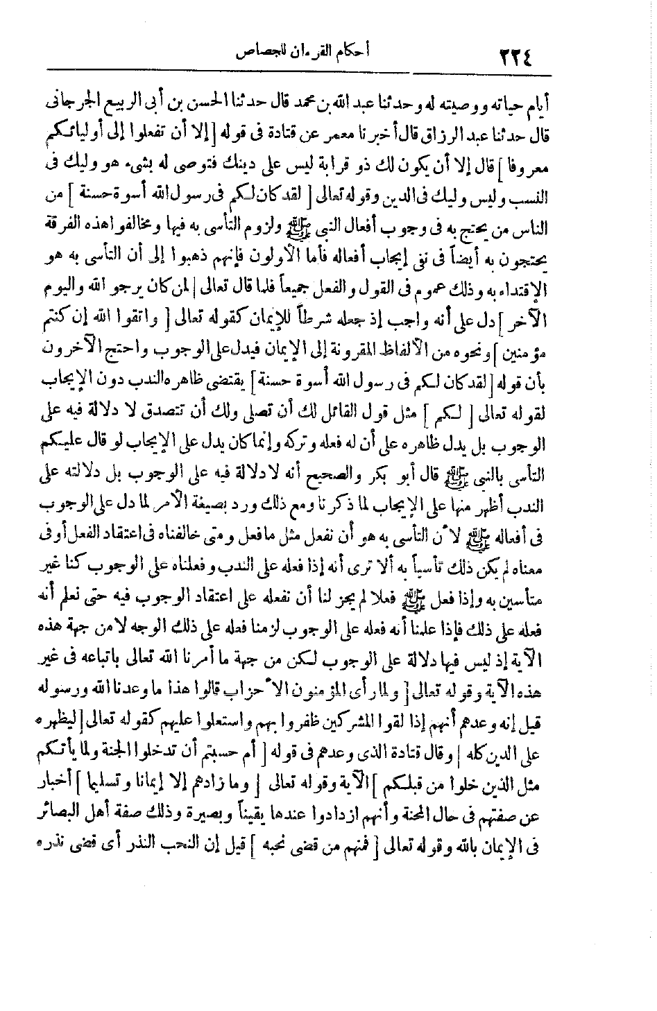وقَوْله تَعَالَى لَقَدْ كانَ لَكُمْ فِي رَسُولِ اللَّهِ أُسْوَةٌ حَسَنَةٌ مِنْ النَّاسِ مَنْ يَحْتَجُّ بِهِ فِي وُجُوبِ أَفْعَالِ النَّبِيِّ صَلَّى اللَّهُ عَلَيْهِ وَسَلَّمَ وَلُزُومِ التَّأَسِّي بِهِ فِيهَا وَمُخَالِفُو هَذِهِ الْفِرْقَةِ يَحْتَجُّونَ بِهِ أَيْضًا فِي نَفْيِ إيجَابِ أَفْعَالِهِ فَأَمَّا الْأَوَّلُونَ فَإِنَّهُمْ ذَهَبُوا إلَى أَنَّ التَّأَسِّي بِهِ هُوَ الِاقْتِدَاءُ بِهِ وَذَلِكَ عُمُومٌ فِي الْقَوْلِ وَالْفِعْلِ جَمِيعًا فَلَمَّا قَالَ تَعَالَى لِمَنْ كانَ يَرْجُوا اللَّهَ وَالْيَوْمَ الْآخِرَ دَلَّ عَلَى أَنَّهُ وَاجِبٌ إذْ جَعَلَهُ شَرْطًا لِلْإِيمَانِ كَقَوْلِهِ تَعَالَى وَاتَّقُوا اللَّهَ إِنْ كُنْتُمْ مُؤْمِنِينَ وَنَحْوَهُ مِنْ الْأَلْفَاظِ الْمَقْرُونَةِ إلَى الْإِيمَانِ فَيَدُلُّ عَلَى الْوُجُوبِ وَاحْتَجَّ الْآخَرُونَ بِأَنَّ قَوْلَهُ لَقَدْ كانَ لَكُمْ فِي رَسُولِ اللَّهِ أُسْوَةٌ حَسَنَةٌ يَقْتَضِي ظَاهِرُهُ النَّدْبَ دُونَ الْإِيجَابِ لِقَوْلِهِ تَعَالَى لَكُمْ مِثْلَ قَوْلِ الْقَائِلِ لَك أَنْ تُصَلِّيَ وَلَك أَنْ تَتَصَدَّقَ لَا دَلَالَةَ فِيهِ عَلَى الْوُجُوبِ بَلْ يَدُلُّ ظَاهِرُهُ عَلَى أَنَّ لَهُ فِعْلَهُ وَتَرْكَهُ وَإِنَّمَا كَانَ يَدُلُّ عَلَى الْإِيجَابِ لَوْ قَالَ عَلَيْكُمْ التَّأَسِّي بِالنَّبِيِّ صَلَّى اللَّهُ عَلَيْهِ وَسَلَّمَ قَالَ أَبُو بَكْرٍ وَالصَّحِيحُ أَنَّهُ لَا دَلَالَةَ فِيهِ عَلَى الْوُجُوبِ بَلْ دَلَالَتُهُ عَلَى النَّدْبِ أَظْهَرُ مِنْهَا عَلَى الْإِيجَابِ لِمَا ذَكَرْنَا ومع ذلك وَرَدَ بِصِيغَةِ الْأَمْرِ لَمَا دَلَّ عَلَى الْوُجُوبِ فِي أَفْعَالِهِ صَلَّى اللَّهُ عَلَيْهِ وَسَلَّمَ لِأَنَّ التَّأَسِّي بِهِ هُوَ أَنْ نَفْعَلَ مِثْلَ مَا فَعَلَ وَمَتَى خَالَفْنَاهُ فِي اعْتِقَادِ الْفِعْلِ أَوْ فِي مَعْنَاهُ لَمْ يَكُنْ ذَلِكَ تَأَسِّيًا بِهِ أَلَا تَرَى أَنَّهُ إذَا فَعَلَهُ عَلَى النَّدْبِ وَفَعَلْنَاهُ عَلَى الْوُجُوبِ كُنَّا غَيْرَ مُتَأَسِّينَ بِهِ وَإِذَا فَعَلَ صَلَّى اللَّهُ عَلَيْهِ وَسَلَّمَ فِعْلًا لَمْ يَجُزْ لَنَا أَنْ نَفْعَلَهُ عَلَى اعْتِقَادِ الْوُجُوبِ فِيهِ حَتَّى نَعْلَمَ أَنَّهُ فَعَلَهُ عَلَى ذَلِكَ فَإِذَا عَلِمْنَا أَنَّهُ فَعَلَهُ عَلَى الْوُجُوبِ لَزَمَنَا فِعْلُهُ عَلَى ذَلِكَ الْوَجْهِ لَا مِنْ جِهَةِ هَذِهِ الْآيَةِ إذْ لَيْسَ فِيهَا دَلَالَةٌ عَلَى الْوُجُوبِ لَكِنْ مِنْ جِهَةِ مَا أَمَرَنَا اللَّهُ تَعَالَى بِاتِّبَاعِهِ فِي غَيْرِ هَذِهِ الْآيَةِ