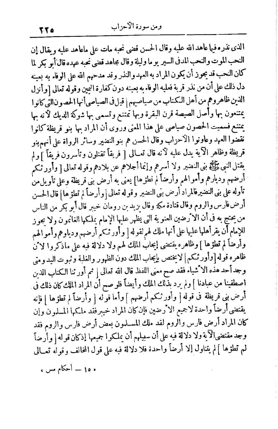 وقَوْله تَعَالَى وَأَوْرَثَكُمْ أَرْضَهُمْ وَدِيارَهُمْ وَأَمْوالَهُمْ وَأَرْضاً لَمْ تَطَؤُها يَعْنِي بِهِ أَرْضَ بَنِي قُرَيْظَةَ وَعَلَى تَأْوِيلِ مَنْ تَأَوَّلَهُ عَلَى بَنِي النَّضِيرِ فَالْمُرَادُ أَرْضُ بنى النضير وقوله تعالى وَأَرْضاً لَمْ تَطَؤُها قَالَ الْحَسَنُ أَرْضُ فَارِسٍ وَالرُّومِ وَقَالَ قَتَادَةُ مَكَّةُ وَقَالَ يَزِيدُ بْنُ رُومَانٍ خَيْبَرُ قَالَ أَبُو بَكْرٍ مِنْ النَّاسِ مَنْ يَحْتَجُّ بِهِ فِي أَنَّ الْأَرَضِينَ العنوية الَّتِي يَظْهَرُ عَلَيْهَا الْإِمَامُ يَمْلِكُهَا الْغَانِمُونَ وَلَا يَجُوزُ لِلْإِمَامِ أَنْ يُقِرَّ أَهْلَهَا عَلَيْهَا عَلَى أَنَّهَا مِلْكٌ لَهُمْ لِقَوْلِهِ وَأَوْرَثَكُمْ أَرْضَهُمْ وَدِيارَهُمْ وَأَمْوالَهُمْ وَأَرْضاً لَمْ تَطَؤُها وَظَاهِرُهُ يَقْتَضِي إيجَابَ الْمِلْكِ لَهُمْ وَلَا دَلَالَةَ فيه على ما ذكروا لأن ظاهره قوله وَأَوْرَثَكُمْ لَا يَخْتَصُّ بِإِيجَابِ الْمِلْكِ دُونَ الظُّهُورِ وَالْغَلَبَةِ وَثُبُوتِ الْيَدِ وَمَتَى وَجَدَ أَحَدٌ هَذِهِ الْأَشْيَاءَ فَقَدْ صَحَّ مَعْنَى اللَّفْظِ قَالَ اللَّهُ تَعَالَى ثُمَّ أَوْرَثْنَا الْكِتابَ الَّذِينَ اصْطَفَيْنا مِنْ عِبادِنا وَلَمْ يُرِدْ بِذَلِكَ الْمُلْكَ وَأَيْضًا فَلَوْ صَحَّ أَنَّ الْمُرَادَ الْمُلْكُ كَانَ ذَلِكَ فِي أَرْضِ بنى قريظة في قوله وَأَوْرَثَكُمْ أَرْضَهُمْ وأما قوله وَأَرْضاً لَمْ تَطَؤُها فَإِنَّهُ يَقْتَضِي أَرْضًا وَاحِدَةً لَا جَمِيعَ الْأَرْضِينَ فَإِنْ كَانَ الْمُرَادُ خَيْبَرَ فَقَدْ مَلَكَهَا الْمُسْلِمُونَ وَإِنْ كَانَ الْمُرَادُ أَرْضَ فَارِسٍ وَالرُّومِ لَقَدْ مَلَكَ الْمُسْلِمُونَ بَعْضَ أَرْضِ فَارِسٍ وَالرُّومِ فَقَدْ وُجِدَ مُقْتَضَى الْآيَةِ وَلَا دَلَالَةَ فِيهِ عَلَى أَنَّ سَبِيلَهُمْ أَنْ يَمْلِكُوا جَمِيعَهَا إذْ كَانَ قوله وَأَرْضاً لَمْ تَطَؤُها لَمْ يَتَنَاوَلْ إلَّا أَرْضًا وَاحِدَةً فَلَا دَلَالَةَ فيه على قول المخالف