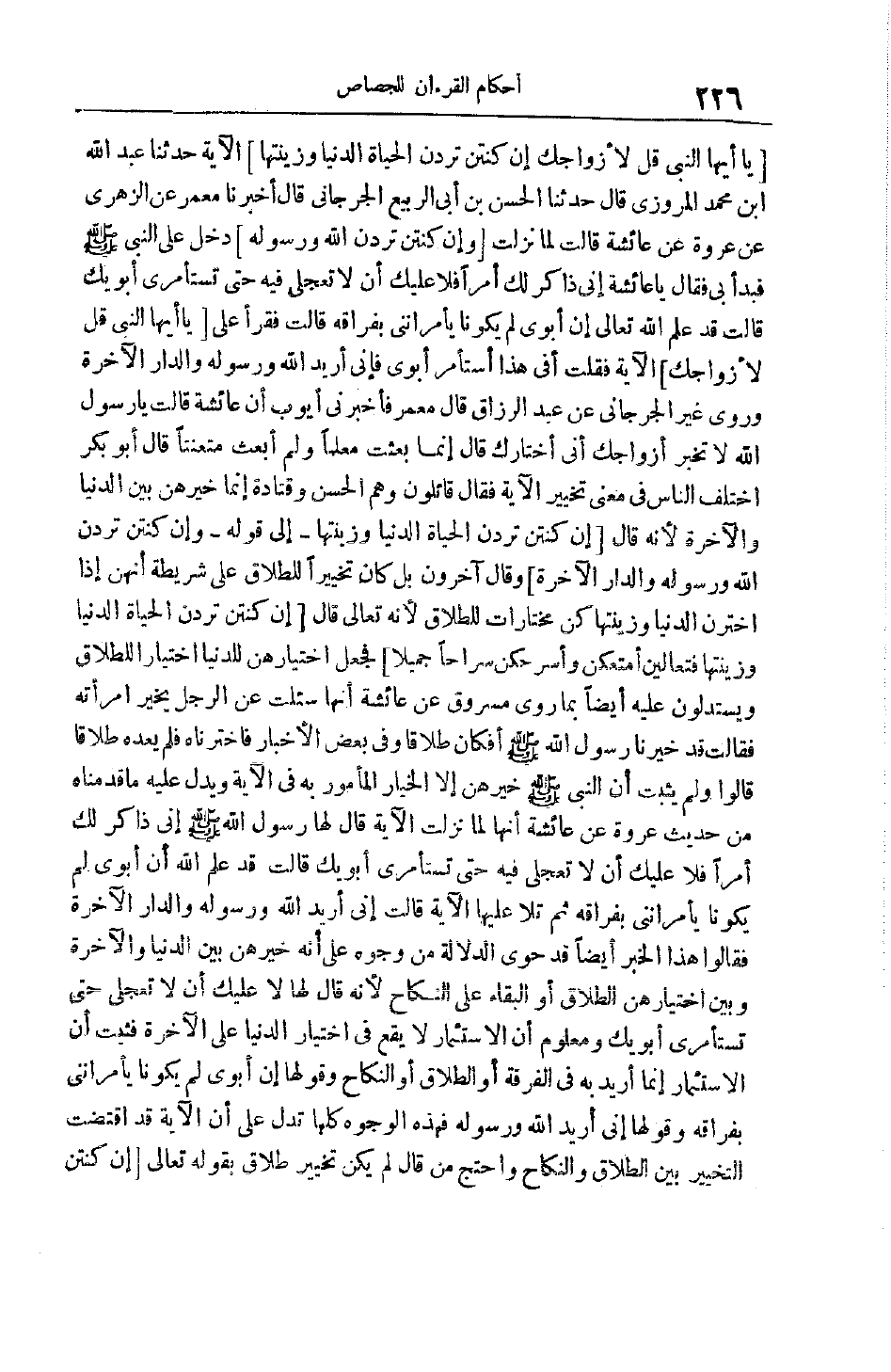 قَالَ أَبُو بَكْرٍ اخْتَلَفَ النَّاسُ فِي مَعْنَى تَخْيِيرِ الْآيَةِ فَقَالَ قَائِلُونَ وَهُمْ الْحَسَنُ وَقَتَادَةُ إنَّمَا خَيَّرَهُنَّ بَيْنَ الدُّنْيَا وَالْآخِرَةِ لِأَنَّهُ قَالَ إِنْ كُنْتُنَّ تُرِدْنَ الْحَياةَ الدُّنْيا وَزِينَتَها- إلَى قَوْلِهِ- وَإِنْ كُنْتُنَّ تُرِدْنَ اللَّهَ وَرَسُولَهُ وَالدَّارَ الْآخِرَةَ وَقَالَ آخَرُونَ بَلْ كَانَ تَخْيِيرًا لِلطَّلَاقِ عَلَى شَرِيطَةِ أَنَّهُنَّ إذَا اخْتَرْنَ الدُّنْيَا وَزِينَتَهَا كُنَّ مُخْتَارَاتٍ لِلطَّلَاقِ لِأَنَّهُ تَعَالَى قَالَ إِنْ كُنْتُنَّ تُرِدْنَ الْحَياةَ الدُّنْيا وَزِينَتَها فَتَعالَيْنَ أُمَتِّعْكُنَّ وَأُسَرِّحْكُنَّ سَراحاً جَمِيلًا فَجَعَلَ اخْتِيَارَهُنَّ لِلدُّنْيَا اخْتِيَارًا لِلطَّلَاقِ وَيَسْتَدِلُّونَ عَلَيْهِ أَيْضًا بِمَا رَوَى مَسْرُوقٌ عَنْ عَائِشَةَ أَنَّهَا سُئِلَتْ عَنْ الرَّجُلِ يُخَيِّرُ امْرَأَتَهُ فَقَالَتْ قَدْ خَيَّرَنَا رَسُولُ اللَّهِ صَلَّى اللَّهُ عَلَيْهِ وَسَلَّمَ أَفَكَانَ طَلَاقًا وَفِي بَعْضِ الْأَخْبَارِ فَاخْتَرْنَاهُ فَلَمْ يَعُدَّهُ طَلَاقًا قَالُوا وَلَمْ يَثْبُتْ أَنَّ النَّبِيَّ صَلَّى اللَّهُ عَلَيْهِ وَسَلَّمَ خَيَّرَهُنَّ إلَّا الْخِيَارَ الْمَأْمُورَ بِهِ فِي الْآيَةِ وَيَدُلُّ عَلَيْهِ مَا قَدَّمْنَاهُ