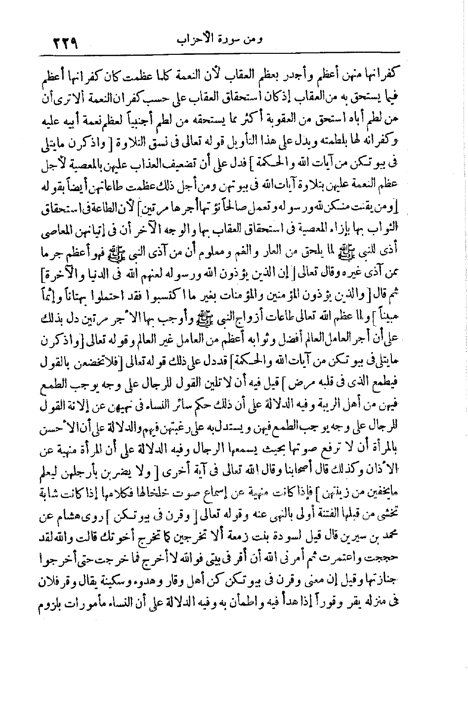 فَدَلَّ عَلَى أَنَّ تَضْعِيفَ الْعَذَابِ عَلَيْهِنَّ بِالْمَعْصِيَةِ لِأَجْلِ عِظَمِ النِّعْمَةِ عَلَيْهِنَّ بِتِلَاوَةِ آيَاتِ اللَّهِ فِي بُيُوتِهِنَّ وَمِنْ أَجْلِ ذَلِكَ عَظُمَتْ طَاعَاتُهُنَّ أَيْضًا بِقَوْلِهِ وَمَنْ يَقْنُتْ مِنْكُنَّ لِلَّهِ وَرَسُولِهِ وَتَعْمَلْ صالِحاً نُؤْتِها أَجْرَها مَرَّتَيْنِ لِأَنَّ الطَّاعَةَ فِي اسْتِحْقَاقِ الثَّوَابِ بِهَا بِإِزَاءِ الْمَعْصِيَةِ فِي اسْتِحْقَاقِ الْعِقَابِ بِهَا وَالْوَجْهُ الْآخَرُ أَنَّ فِي إتْيَانِهِنَّ الْمَعَاصِيَ أَذًى لِلنَّبِيِّ صَلَّى اللَّهُ عَلَيْهِ وَسَلَّمَ لِمَا يَلْحَقُ مِنْ الْعَارِ وَالْغَمِّ وَمَعْلُومٌ أَنَّ مَنْ آذَى النَّبِيَّ صَلَّى اللَّهُ عَلَيْهِ وَسَلَّمَ فَهُوَ أَعْظَمُ جُرْمًا مِمَّنْ آذَى غَيْرَهُ وَقَالَ تَعَالَى إِنَّ الَّذِينَ يُؤْذُونَ اللَّهَ وَرَسُولَهُ لَعَنَهُمُ اللَّهُ فِي الدُّنْيا وَالْآخِرَةِ ثُمَّ قَالَ وَالَّذِينَ يُؤْذُونَ الْمُؤْمِنِينَ وَالْمُؤْمِناتِ بِغَيْرِ مَا اكْتَسَبُوا فَقَدِ احْتَمَلُوا بُهْتاناً وَإِثْماً مُبِيناً وَلَمَّا عَظَّمَ اللَّهُ تَعَالَى طَاعَاتِ أَزْوَاجِ النَّبِيِّ صَلَّى اللَّهُ عَلَيْهِ وَسَلَّمَ وَأَوْجَبَ بِهَا الْأَجْرَ مَرَّتَيْنِ دَلَّ بِذَلِكَ عَلَى أَنَّ أَجْرَ الْعَامِلِ الْعَالِمِ أَفْضَلُ وَثَوَابُهُ أَعْظَمُ مِنْ الْعَامِلِ غَيْرِ الْعَالِمِ وقَوْله تَعَالَى وَاذْكُرْنَ مَا يُتْلى فِي بُيُوتِكُنَّ مِنْ آياتِ اللَّهِ وَالْحِكْمَةِ قَدْ دَلَّ عَلَى ذَلِكَ