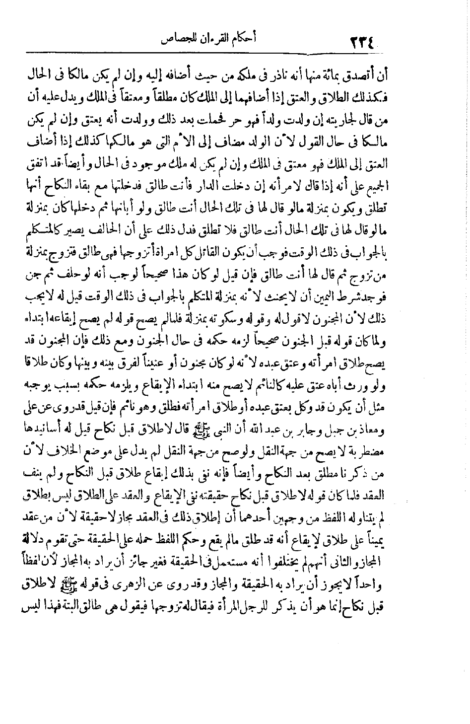 أَنْ أَتَصَدَّقَ بِمِائَةٍ مِنْهَا أَنَّهُ نَاذِرٌ فِي مِلْكِهِ مِنْ حَيْثُ أَضَافَهُ إلَيْهِ وَإِنْ لَمْ يَكُنْ مَالِكًا فِي الْحَالِ فَكَذَلِكَ الطَّلَاقُ وَالْعِتْقُ إذَا أَضَافَهُمَا إلَى الْمِلْكِ كَانَ مُطَلِّقًا وَمُعْتِقًا فِي الْمِلْكِ وَيَدُلُّ عَلَيْهِ أَنَّ مَنْ قَالَ لِجَارِيَتِهِ إنْ وَلَدْت وَلَدًا فَهُوَ حُرٌّ فَحَمَلَتْ بَعْدَ ذَلِكَ وَوَلَدَتْ أَنَّهُ يُعْتَقُ وَإِنْ لَمْ يَكُنْ مَالِكًا فِي حَالِ الْقَوْلِ لِأَنَّ الْوَلَدَ مُضَافٌ إلَى الْأُمِّ الَّتِي هُوَ مَالِكُهَا كَذَلِكَ إذَا أَضَافَ الْعِتْقَ إلَى الْمِلْكِ فَهُوَ مُعْتَقٌ فِي الْمِلْكِ وَإِنْ لَمْ يَكُنْ لَهُ مِلْكٌ مَوْجُودٌ فِي الْحَالِ وَأَيْضًا قَدْ اتَّفَقَ الْجَمِيعُ عَلَى أَنَّهُ إذَا قَالَ لِامْرَأَتِهِ إنْ دَخَلْت الدَّارَ فَأَنْتِ طَالِقٌ فَدَخَلَتْهَا مَعَ بَقَاءِ النِّكَاحِ أَنَّهَا تَطْلُقُ وَيَكُونُ بِمَنْزِلَةِ مَا لَوْ قَالَ لَهَا فِي تِلْكَ الْحَالِ أَنْتِ طَالِقٌ وَلَوْ أَبَانَهَا ثُمَّ دَخَلَهَا كَانَ بِمَنْزِلَةِ مَا لَوْ قَالَ لَهَا فِي تِلْكَ الْحَالِ أَنْتِ طَالِقٌ فَلَا تَطْلُقُ فَدَلَّ ذَلِكَ عَلَى أَنَّ الْحَالِفَ يَصِيرُ كَالْمُتَكَلِّمِ بِالْجَوَابِ فِي ذَلِكَ الْوَقْتِ فَوَجَبَ أَنْ يَكُونَ الْقَائِلُ كُلُّ امْرَأَةٍ أَتَزَوَّجُهَا فَهِيَ طَالِقٌ فَتَزَوَّجَ بِمَنْزِلَةِ مَنْ تَزَوَّجَ ثُمَّ قَالَ لَهَا أَنْتِ طَالِقٌ فَإِنْ قِيلَ لَوْ كَانَ هَذَا صَحِيحًا لَوَجَبَ أَنَّهُ لَوْ حَلَفَ ثُمَّ جُنَّ فَوُجِدَ شَرْطُ الْيَمِينِ أَنْ لَا يَحْنَثَ لِأَنَّهُ بِمَنْزِلَةِ الْمُتَكَلِّمِ بِالْجَوَابِ فِي ذَلِكَ الْوَقْتِ قِيلَ لَهُ لَا يَجِبُ ذَلِكَ لِأَنَّ الْمَجْنُونَ لَا قَوْلَ لَهُ وَقَوْلُهُ وَسُكُوتُهُ بِمَنْزِلَةٍ فَلَمَّا لَمْ يَصِحَّ قَوْلُهُ لَمْ يَصِحَّ إيقَاعُهُ ابْتِدَاءً وَلَمَّا كَانَ قَوْلُهُ قَبْلَ الْجُنُونِ صَحِيحًا لَزِمَهُ حُكْمُهُ فِي حَالِ الْجُنُونِ وَمَعَ ذَلِكَ فَإِنَّ الْمَجْنُونَ قَدْ يَصِحُّ طَلَاقُ امْرَأَتِهِ وَعِتْقُ عَبْدِهِ لأنه لو كان مجنون أَوْ عِنِّينًا لَفُرِّقَ بَيْنَهُ وَبَيْنَهَا وَكَانَ طَلَاقًا وَلَوْ وَرِثَ أَبَاهُ عَتَقَ عَلَيْهِ كَالنَّائِمِ لَا يَصِحُّ مِنْهُ ابْتِدَاءً الْإِيقَاعُ وَيَلْزَمُهُ حُكْمُهُ بِسَبَبٍ يُوجِبُهُ مِثْلَ أَنْ يَكُونَ قَدْ وَكَّلَ بِعِتْقِ عَبْدِهِ أَوْ طَلَاقِ امْرَأَتِهِ فَطَلَّقَ وَهُوَ نَائِمٌ فَإِنْ قِيلَ
