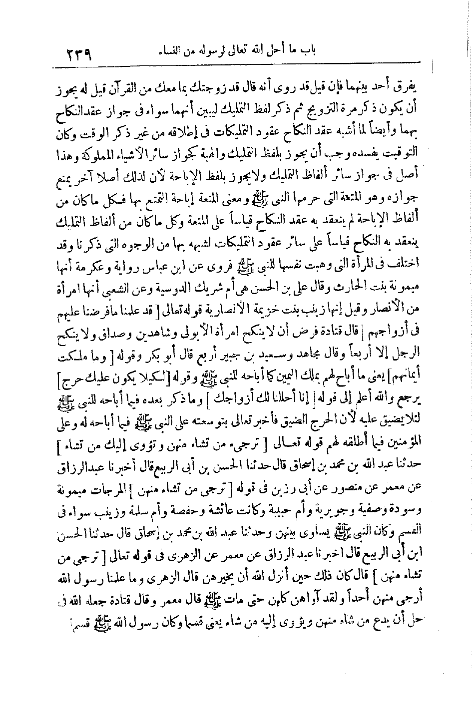يُفَرِّقْ أَحَدٌ بَيْنَهُمَا فَإِنْ قِيلَ قَدْ رُوِيَ أَنَّهُ قَالَ قَدْ زَوَّجْتُك بِمَا مَعَك مِنْ الْقُرْآنِ قِيلَ لَهُ يَجُوزُ أَنْ يَكُونَ ذَكَرَ مَرَّةً التَّزْوِيجَ ثُمَّ ذَكَرَ لَفْظَ التَّمْلِيكِ لِيُبَيِّنَ أَنَّهُمَا سَوَاءٌ فِي جَوَازِ عَقْدِ النِّكَاحِ بِهِمَا وَأَيْضًا لَمَّا أَشْبَهَ عَقْدُ النِّكَاحِ عُقُودَ التَّمْلِيكَاتِ فِي إطْلَاقِهِ مِنْ غَيْرِ ذِكْرِ الْوَقْتِ وَكَانَ التَّوْقِيتُ يُفْسِدُهُ وَجَبَ أَنْ يَجُوزَ بِلَفْظِ التَّمْلِيكِ وَالْهِبَةِ كَجَوَازِ سَائِرِ الْأَشْيَاءِ الْمَمْلُوكَةِ وَهَذَا أَصْلٌ فِي جَوَازِ سَائِرِ أَلْفَاظِ التَّمْلِيكِ وَلَا يَجُوزُ بِلَفْظِ الْإِبَاحَةِ لِأَنَّ لِذَلِكَ أَصْلًا آخَرَ يَمْنَعُ جَوَازَهُ وَهُوَ الْمُتْعَةُ الَّتِي حَرَّمَهَا النَّبِيُّ صَلَّى اللَّهُ عَلَيْهِ وَسَلَّمَ وَمَعْنَى الْمُتْعَةِ إبَاحَةُ التَّمَتُّعِ بِهَا فَكُلُّ مَا كَانَ مِنْ أَلْفَاظِ الْإِبَاحَةِ لَمْ يَنْعَقِدْ بِهِ عَقْدُ النِّكَاحِ قِيَاسًا عَلَى الْمُتْعَةِ وَكُلُّ مَا كَانَ مِنْ أَلْفَاظِ التَّمْلِيكِ يَنْعَقِدُ بِهِ النِّكَاحُ قِيَاسًا عَلَى سَائِرِ عُقُودِ التَّمْلِيكَاتِ لِشَبَهِهِ بِهَا مِنْ الْوُجُوهِ الَّتِي ذَكَرْنَا وَقَدْ اُخْتُلِفَ فِي الْمَرْأَةِ الَّتِي وَهَبَتْ نَفْسَهَا لِلنَّبِيِّ صَلَّى اللَّهُ عَلَيْهِ وَسَلَّمَ فَرُوِيَ عَنْ ابْنِ عَبَّاسٍ رِوَايَةٌ وَعِكْرِمَةَ أَنَّهَا مَيْمُونَةُ بِنْتُ الْحَارِثِ وَقَالَ عَلِيُّ بْنُ الْحَسَنِ هِيَ أُمُّ شَرِيكٍ الدوسية وَعَنْ الشَّعْبِيِّ أَنَّهَا امْرَأَةٌ مِنْ الْأَنْصَارِ وَقِيلَ إنَّهَا زَيْنَبُ بِنْتُ خُزَيْمَةَ الْأَنْصَارِيَّةُ قَوْله تَعَالَى قَدْ عَلِمْنا مَا فَرَضْنا عَلَيْهِمْ فِي أَزْواجِهِمْ قَالَ قَتَادَةُ فَرَضَ أَنْ لَا يَنْكِحَ امْرَأَةً إلَّا بِوَلِيٍّ وَشَاهِدَيْنِ وَصَدَاقٍ وَلَا يَنْكِحُ الرَّجُلُ إلَّا أَرْبَعًا وَقَالَ مُجَاهِدٌ وَسَعِيدُ بْنُ جُبَيْرٍ أَرْبَعٌ قَالَ أَبُو بَكْرٍ وَقَوْلُهُ وَما مَلَكَتْ أَيْمانُهُمْ يَعْنِي مَا أَبَاحَ لَهُمْ بِمَلْكِ الْيَمِينِ كَمَا أَبَاحَهُ لِلنَّبِيِّ صَلَّى اللَّهُ عَلَيْهِ وَسَلَّمَ وَقَوْلُهُ لِكَيْلا يَكُونَ عَلَيْكَ حَرَجٌ يَرْجِعُ وَاَللَّهُ أَعْلَمُ إلَى قَوْلِهِ إِنَّا أَحْلَلْنا لَكَ أَزْواجَكَ وما ذكر بَعْدَهُ فِيمَا أَبَاحَهُ لِلنَّبِيِّ صَلَّى اللَّهُ عَلَيْهِ وَسَلَّمَ لِئَلَّا يُضَيِّقَ عَلَيْهِ لِأَنَّ الْحَرَجَ الضِّيقُ فَأَخْبَرَ تَعَالَى بِتَوْسِعَتِهِ عَلَى النَّبِيِّ صَلَّى اللَّهُ عَلَيْهِ وَسَلَّمَ فِيمَا أَبَاحَهُ لَهُ وَعَلَى الْمُؤْمِنِينَ فِيمَا أَطْلَقَهُ لَهُمْ قَوْله تَعَالَى تُرْجِي مَنْ تَشاءُ مِنْهُنَّ وَتُؤْوِي إِلَيْكَ مَنْ تَشاءُ حدثنا عبد الله بن محمد بن إسحاق قَالَ حَدَّثَنَا الْحَسَنُ بْنُ أَبِي الرَّبِيعِ قَالَ أَخْبَرَنَا عَبْدُ الرَّزَّاقِ عَنْ مَعْمَرٍ عَنْ مَنْصُورٍ عن أبى رزين في قوله تُرْجِي مَنْ تَشاءُ مِنْهُنَّ الْمُرْجَاتُ مَيْمُونَةُ وَسَوْدَةُ وَصَفِيَّةُ وَجُوَيْرِيَةُ وَأُمُّ حَبِيبَةَ وَكَانَتْ عَائِشَةُ وَحَفْصَةُ وَأُمُّ سَلَمَةَ وَزَيْنَبُ سَوَاءً فِي الْقَسْمِ وَكَانَ النَّبِيُّ صَلَّى اللَّهُ عَلَيْهِ وَسَلَّمَ يُسَاوِي بَيْنَهُنَّ وَحَدَّثَنَا عَبْدُ اللَّهِ بْنُ محمد بن إسحاق قال حدثنا الحسن ابن أَبِي الرَّبِيعِ قَالَ أَخْبَرَنَا عَبْدُ الرَّزَّاقِ عَنْ مَعْمَرٍ عَنْ الزُّهْرِيِّ فِي قَوْله تَعَالَى تُرْجِي مَنْ تَشاءُ مِنْهُنَّ قَالَ كَانَ ذَلِكَ حِينَ أَنْزَلَ اللَّهُ أَنْ يُخَيِّرَهُنَّ قَالَ الزُّهْرِيُّ وَمَا عَلِمْنَا رَسُولَ اللَّهِ أَرْجَى مِنْهُنَّ أَحَدًا وَلَقَدْ آوَاهُنَّ كُلَّهُنَّ حَتَّى مَاتَ صَلَّى اللَ