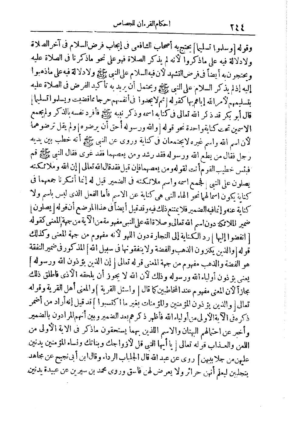 وقوله وَسَلِّمُوا تَسْلِيماً يَحْتَجُّ بِهِ أَصْحَابُ الشَّافِعِيِّ فِي إيجَابِ فَرْضِ السَّلَامِ فِي آخِرِ الصَّلَاةِ وَلَا دَلَالَةَ فِيهِ عَلَى مَا ذَكَرُوا لِأَنَّهُ لَمْ يَذْكُرْ الصَّلَاةَ فَهُوَ عَلَى نَحْوِ مَا ذَكَرْنَا فِي الصَّلَاةِ عَلَيْهِ وَيَحْتَجُّونَ بِهِ أَيْضًا فِي فَرْضِ التَّشَهُّدِ لِأَنَّ فِيهِ السَّلَامَ عَلَى النَّبِيِّ صَلَّى اللَّهُ عَلَيْهِ وَسَلَّمَ وَلَا دَلَالَةَ فِيهِ عَلَى مَا ذَهَبُوا إلَيْهِ إذْ لَمْ يَذْكُرْ السَّلَامَ عَلَى النَّبِيِّ صَلَّى اللَّهُ عَلَيْهِ وَسَلَّمَ وَيَحْتَمِلُ أَنْ يُرِيدَ بِهِ تَأْكِيدَ الْفَرْضِ فِي الصَّلَاةِ عَلَيْهِ بِتَسْلِيمِهِمْ لِأَمْرِ اللَّهِ إيَّاهُمْ بِهَا كَقَوْلِهِ ثُمَّ لا يَجِدُوا فِي أَنْفُسِهِمْ حَرَجاً مِمَّا قَضَيْتَ وَيُسَلِّمُوا تَسْلِيماً قَالَ أَبُو بَكْرٍ قَدْ ذَكَرَ اللَّهُ تَعَالَى فِي كِتَابِهِ اسْمَهُ وَذَكَرَ نَبِيَّهُ صَلَّى اللَّهُ عَلَيْهِ وَسَلَّمَ فَأَفْرَدَ نَفْسَهُ بِالذِّكْرِ وَلَمْ يَجْمَعْ الِاسْمَيْنِ تَحْتَ كِنَايَةٍ وَاحِدَةٍ نَحْوَ قَوْلِهِ وَاللَّهُ وَرَسُولُهُ أَحَقُّ أَنْ يُرْضُوهُ ولم يقل ترضوهما لِأَنَّ اسْمَ اللَّهِ وَاسْمَ غَيْرِهِ لَا يَجْتَمِعَانِ فِي كِنَايَةٍ