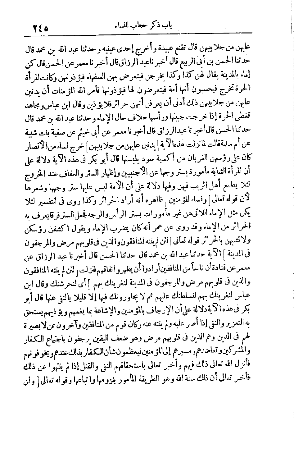 عليهن من جلابيبهن قَالَ تَقَنَّعَ عُبَيْدَةَ وَأَخْرَجَ إحْدَى عَيْنَيْهِ وَحَدَّثَنَا عَبْدُ اللَّهِ بْنُ مُحَمَّدٍ قَالَ حَدَّثَنَا الْحَسَنُ بْنُ أَبِي الرَّبِيعِ قَالَ أَخْبَرَنَا عَبْدُ الرَّزَّاقِ قَالَ أَخْبَرَنَا مَعْمَرٌ عَنْ الْحَسَنِ قَالَ كُنَّ إمَاءٌ بِالْمَدِينَةِ يُقَالُ لَهُنَّ كَذَا وَكَذَا يَخْرُجْنَ فيتعرض بهن السفهاء فيؤذونهن وَكَانَتْ الْمَرْأَةُ الْحُرَّةُ تَخْرُجُ فَيَحْسِبُونَ أَنَّهَا أَمَةٌ فَيَتَعَرَّضُونَ لَهَا فَيُؤْذُونَهَا فَأَمَرَ اللَّهُ الْمُؤْمِنَاتِ أَنْ يُدْنِينَ عَلَيْهِنَّ مِنْ جَلَابِيبِهِنَّ ذَلِكَ أَدْنَى أَنْ يُعْرَفْنَ أَنَّهُنَّ حَرَائِرُ فَلَا يُؤْذَيْنَ وَقَالَ ابْنُ عَبَّاسٍ وَمُجَاهِدٌ تُغَطِّي الْحُرَّةُ إذَا خَرَجَتْ جَبِينَهَا وَرَأْسَهَا خِلَافَ حَالِ الْإِمَاءِ وَحَدَّثَنَا عَبْدُ اللَّهِ بْنُ مُحَمَّدٍ قَالَ حَدَّثَنَا الْحَسَنُ قَالَ أَخْبَرَنَا عَبْدُ الرَّزَّاقِ قَالَ أَخْبَرَنَا مَعْمَرٌ عَنْ أَبِي خيثم عَنْ صَفِيَّةَ بِنْتِ شَيْبَةَ عَنْ أُمِّ سَلَمَةَ قَالَتْ لَمَا نَزَلَتْ هَذِهِ الْآيَةُ يُدْنِينَ عَلَيْهِنَّ مِنْ جَلَابِيبِهِنَّ خرج نساء من الأنصار كان على رؤسهن الْغِرْبَانُ مِنْ أَكْسِيَةٍ سُودٍ يَلْبَسْنَهَا قَالَ أَبُو بَكْرٍ فِي هَذِهِ الْآيَةِ دَلَالَةٌ عَلَى أَنَّ المرأة الشابة مأمورة بستر وجها عَنْ الْأَجْنَبِيِّينَ وَإِظْهَارِ السِّتْرِ وَالْعَفَافِ عِنْدَ الْخُرُوجِ لِئَلَّا يَطْمَعَ أَهْلُ الرِّيَبِ فِيهِنَّ وَفِيهَا دَلَالَةٌ عَلَى أَنَّ الْأَمَةَ لَيْسَ عَلَيْهَا سَتْرُ وَجْهِهَا وشعرها لأن قوله تعالى وَنِساءِ الْمُؤْمِنِينَ ظَاهِرُهُ أَنَّهُ أَرَادَ الْحَرَائِرَ وَكَذَا رُوِيَ فِي التَّفْسِيرِ لِئَلَّا يَكُنَّ مِثْلَ الْإِمَاءِ اللَّاتِي هُنَّ غَيْرُ مَأْمُورَاتٍ بِسَتْرِ الرَّأْسِ وَالْوَجْهِ فَجَعَلَ السِّتْرَ فَرْقًا يُعْرَفُ بِهِ الْحَرَائِرُ مِنْ الْإِمَاءِ وَقَدْ رُوِيَ عَنْ عُمَرَ أَنَّهُ كَانَ يَضْرِبُ الْإِمَاءَ ويقول اكشفن رؤسكن وَلَا تَشَبَّهْنَ بِالْحَرَائِرِ