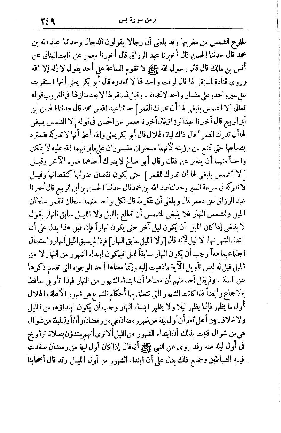 قَوْله تَعَالَى لَا الشَّمْسُ يَنْبَغِي لَها أَنْ تُدْرِكَ الْقَمَرَ حَدَّثَنَا عَبْدُ اللَّهِ بْنُ مُحَمَّدٍ قَالَ حَدَّثَنَا الْحَسَنُ بْنُ أَبِي الرَّبِيعِ قَالَ أَخْبَرَنَا عَبْدُ الرَّزَّاقِ قَالَ أَخْبَرَنَا مَعْمَرُ عَنْ الْحَسَنِ فِي قَوْلِهِ لَا الشَّمْسُ يَنْبَغِي لَها أَنْ تُدْرِكَ الْقَمَرَ قَالَ ذَاكَ لَيْلَةُ الْهِلَالِ قَالَ أَبُو بَكْرٍ يَعْنِي وَاَللَّهُ أَعْلَمُ أَنَّهَا لَا تُدْرِكُهُ فَتَسْتُرُهُ بِشُعَاعِهَا حَتَّى تَمْنَعَ مِنْ رُؤْيَتِهِ لِأَنَّهُمَا مُسَخَّرَانِ مَقْسُورَانِ عَلَى مَا رَتَّبَهُمَا اللَّهُ عَلَيْهِ لَا يُمْكِنُ وَاحِدًا مِنْهُمَا أَنْ يَتَغَيَّرَ عَنْ ذَلِكَ وَقَالَ أَبُو صَالِحٍ لَا يُدْرِكُ أَحَدُهُمَا ضَوْءَ الْآخَرِ وَقِيلَ لَا الشَّمْسُ يَنْبَغِي لَها أَنْ تُدْرِكَ الْقَمَرَ حتى يكون نقصان ضوئها كنقصانها وَقِيلَ لَا تُدْرِكُهُ فِي سُرْعَةِ السَّيْرِ وَحَدَّثَنَا عَبْدُ اللَّهِ بْنُ مُحَمَّدٍ قَالَ حَدَّثَنَا الْحَسَنُ بْنُ أَبِي الرَّبِيعِ قَالَ أَخْبَرَنَا عَبْدُ الرَّزَّاقِ عَنْ مَعْمَرٍ قَالَ وَبَلَغَنِي أَنَّ عِكْرِمَةَ قَالَ لِكُلِّ وَاحِدٍ مِنْهُمَا سُلْطَانٌ لِلْقَمَرِ سُلْطَانُ اللَّيْلِ وَلِلشَّمْسِ النَّهَارُ فَلَا يَنْبَغِي لِلشَّمْسِ أَنْ تَطْلُعَ بالليل ولا الليل سابق النهار يَقُولُ لَا يَنْبَغِي إذَا كَانَ اللَّيْلُ أَنْ يَكُونَ لَيْلٌ آخَرُ حَتَّى يَكُونَ نَهَارًا فَإِنْ قِيلَ هَذَا يَدُلُّ عَلَى أَنَّ ابْتِدَاءَ الشَّهْرِ نَهَارٌ لَا لَيْلٌ لِأَنَّهُ قَالَ وَلَا اللَّيْلُ سابِقُ النَّهارِ فَإِذَا لَمْ يَسْبِقْ اللَّيْلُ النَّهَارَ وَاسْتَحَالَ اجْتِمَاعُهُمَا مَعًا وَجَبَ أَنْ يَكُونَ النَّهَارُ سَابِقًا لِلَّيْلِ فَيَكُونُ ابْتِدَاءً الشُّهُورِ مِنْ النَّهَارِ لَا مِنْ اللَّيْلِ قِيلَ لَهُ لَيْسَ تَأْوِيلُ الْآيَةِ مَا ذَهَبْت إلَيْهِ وَإِنَّمَا مَعْنَاهَا أَحَدُ الْوُجُوهِ الَّتِي تَقَدَّمَ ذِكْرُهَا عَنْ السَّلَفِ وَلَمْ يَقُلْ أَحَدٌ مِنْهُمْ إنَّ مَعْنَاهَا أَنَّ ابْتِدَاءَ الشُّهُورِ مِنْ النَّهَارِ فَهَذَا تَأْوِيلٌ سَاقِطٌ بِالْإِجْمَاعِ وَأَيْضًا فَلَمَّا كَانَتْ الشُّهُورُ الَّتِي تَتَعَلَّقُ بِهَا أَحْكَامُ الشَّرْعِ هِيَ شُهُورُ الْأَهِلَّةِ وَالْهِلَالُ أَوَّلُ مَا يَظْهَرُ فَإِنَّمَا يَظْهَرُ لَيْلًا وَلَا يَظْهَرُ ابْتِدَاءَ النَّهَارِ وَجَبَ أَنْ يَكُونَ ابْتِدَاؤُهَا مِنْ اللَّيْلِ وَلَا خِلَافَ بَيْنَ أَهْلِ الْعِلْمِ أَنَّ أَوَّلَ لَيْلَةٍ مِنْ شَهْرِ رَمَضَانَ هِيَ مِنْ رَمَضَانَ وَأَنَّ أَوَّلَ لَيْلَةٍ مِنْ شَوَّالٍ هِيَ مِنْ شَوَّالٍ فَثَبَتَ بِذَلِكَ أَنَّ ابْتِدَاءَ الشُّهُورِ مِنْ اللَّيْلِ ألا ترى أنهم يبتدئون بصلاة تراويح فِي أَوَّلِ لَيْلَةٍ مِنْهُ