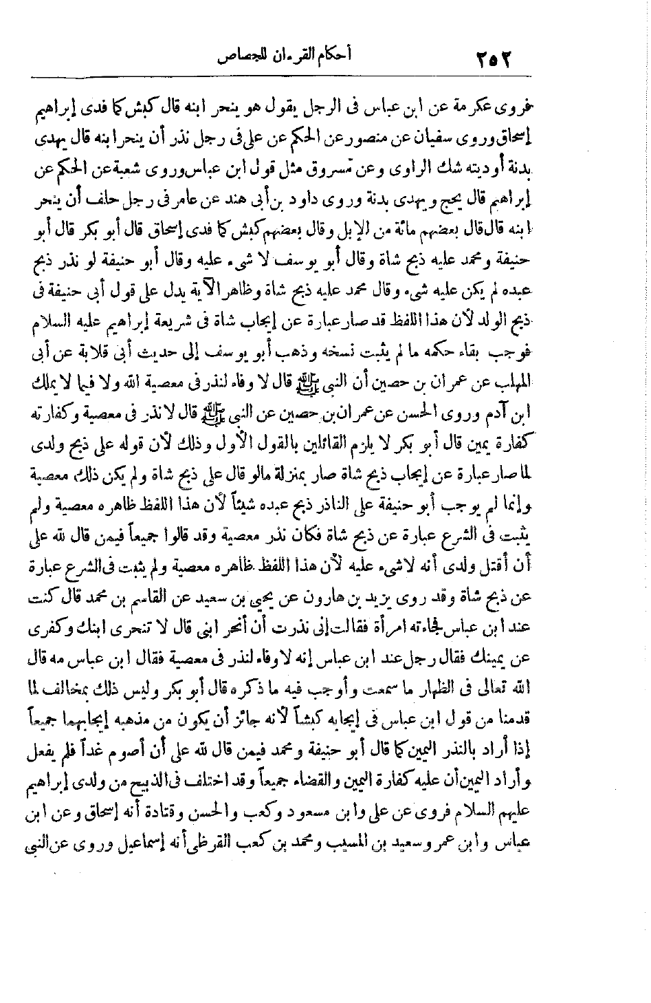 شَكَّ الرَّاوِي وَعَنْ مَسْرُوقٍ مِثْلُ قَوْلِ ابْنِ عَبَّاسٍ وَرَوَى شُعْبَةُ عَنْ الْحَكَمِ عَنْ إبْرَاهِيمَ قَالَ يَحُجُّ وَيُهْدِي بَدَنَةَ وَرَوَى دَاوُد بْنُ أَبِي هِنْدٍ عَنْ عَامِرٍ فِي رَجُلٍ حَلَفَ أَنْ يَنْحَرَ ابْنَهُ قَالَ قَالَ بَعْضُهُمْ مِائَةٌ مِنْ الْإِبِلِ وَقَالَ بَعْضُهُمْ كَبْشٌ كَمَا فُدِيَ إِسْحَاقُ قَالَ أَبُو بَكْرٍ قَالَ أَبُو حَنِيفَةَ وَمُحَمَّدٌ عَلَيْهِ ذَبْحُ شَاةٍ وَقَالَ أَبُو يُوسُفَ لَا شَيْءَ عَلَيْهِ وَقَالَ أَبُو حَنِيفَةَ لَوْ نَذَرَ ذَبْحَ عَبْدِهِ لَمْ يَكُنْ عَلَيْهِ شَيْءٌ وَقَالَ مُحَمَّدٌ عَلَيْهِ ذَبْحُ شَاةٍ وَظَاهِرُ الْآيَةِ يَدُلُّ عَلَى قَوْلِ أَبِي حَنِيفَةَ فِي ذَبْحِ الْوَلَدِ لِأَنَّ هَذَا اللَّفْظَ قَدْ صَارَ عِبَارَةً عَنْ إيجَابِ شَاةٍ فِي شَرِيعَةِ إبْرَاهِيمَ عَلَيْهِ السَّلَامُ فَوَجَبَ بَقَاءُ حُكْمِهِ مَا لَمْ يَثْبُتْ نَسْخُهُ وَذَهَبَ أَبُو يُوسُفَ إلَى