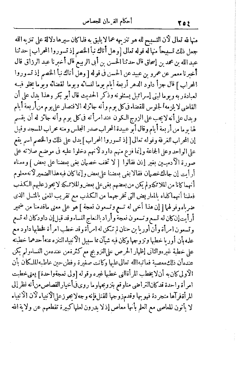 قَوْله تَعَالَى وَهَلْ أَتاكَ نَبَأُ الْخَصْمِ إِذْ تَسَوَّرُوا الْمِحْرابَ حدثنا عبد الله بن محمد بن إسحاق قَالَ حَدَّثَنَا الْحَسَنُ بْنُ أَبِي الرَّبِيعِ قَالَ أَخْبَرَنَا عَبْدُ الرَّزَّاقِ قَالَ أَخْبَرَنَا مَعْمَرٌ عَنْ عمر وبن عُبَيْدٍ عَنْ الْحَسَنِ فِي قَوْلِهِ وَهَلْ أَتاكَ نَبَأُ الْخَصْمِ إِذْ تَسَوَّرُوا الْمِحْرابَ قَالَ جَزَّأَ دَاوُد الدَّهْرَ أَرْبَعَةَ أَيَّامٍ يَوْمًا لِنِسَائِهِ وَيَوْمًا لِقَضَائِهِ وَيَوْمًا يَخْلُو فِيهِ لِعِبَادَةِ ربه ويوما لبنى إسرائيل يسئلونه وَذَكَرَ الْحَدِيثَ قَالَ أَبُو بَكْرٍ وَهَذَا يَدُلُّ عَلَى أَنَّ الْقَاضِيَ لَا يَلْزَمُهُ الْجُلُوسُ لِلْقَضَاءِ فِي كُلِّ يَوْمٍ وَأَنَّهُ جَائِزٌ لَهُ الِاقْتِصَارُ عَلَى يَوْمٍ مِنْ أَرْبَعَةِ أَيَّامٍ وَيَدُلُّ عَلَى أَنَّهُ لَا يَجِبُ عَلَى الزَّوْجِ الْكَوْنُ عِنْدَ امْرَأَتِهِ فِي كُلِّ يَوْمٍ وَأَنَّهُ جَائِزٌ لَهُ أَنْ يَقْسِمَ لَهَا يَوْمًا مِنْ أَرْبَعَةِ أَيَّامٍ وَقَالَ أَبُو عُبَيْدَةَ الْمِحْرَابُ صَدْرُ الْمَجْلِسِ وَمِنْهُ مِحْرَابُ الْمَسْجِدِ وَقِيلَ إنَّ الْمِحْرَابَ الْغُرْفَةُ وقَوْله تعالى إِذْ تَسَوَّرُوا الْمِحْرابَ يَدُلُّ عَلَى ذَلِكَ وَالْخَصْمُ اسْمٌ يَقَعُ عَلَى الْوَاحِدِ وَعَلَى الْجَمَاعَةِ