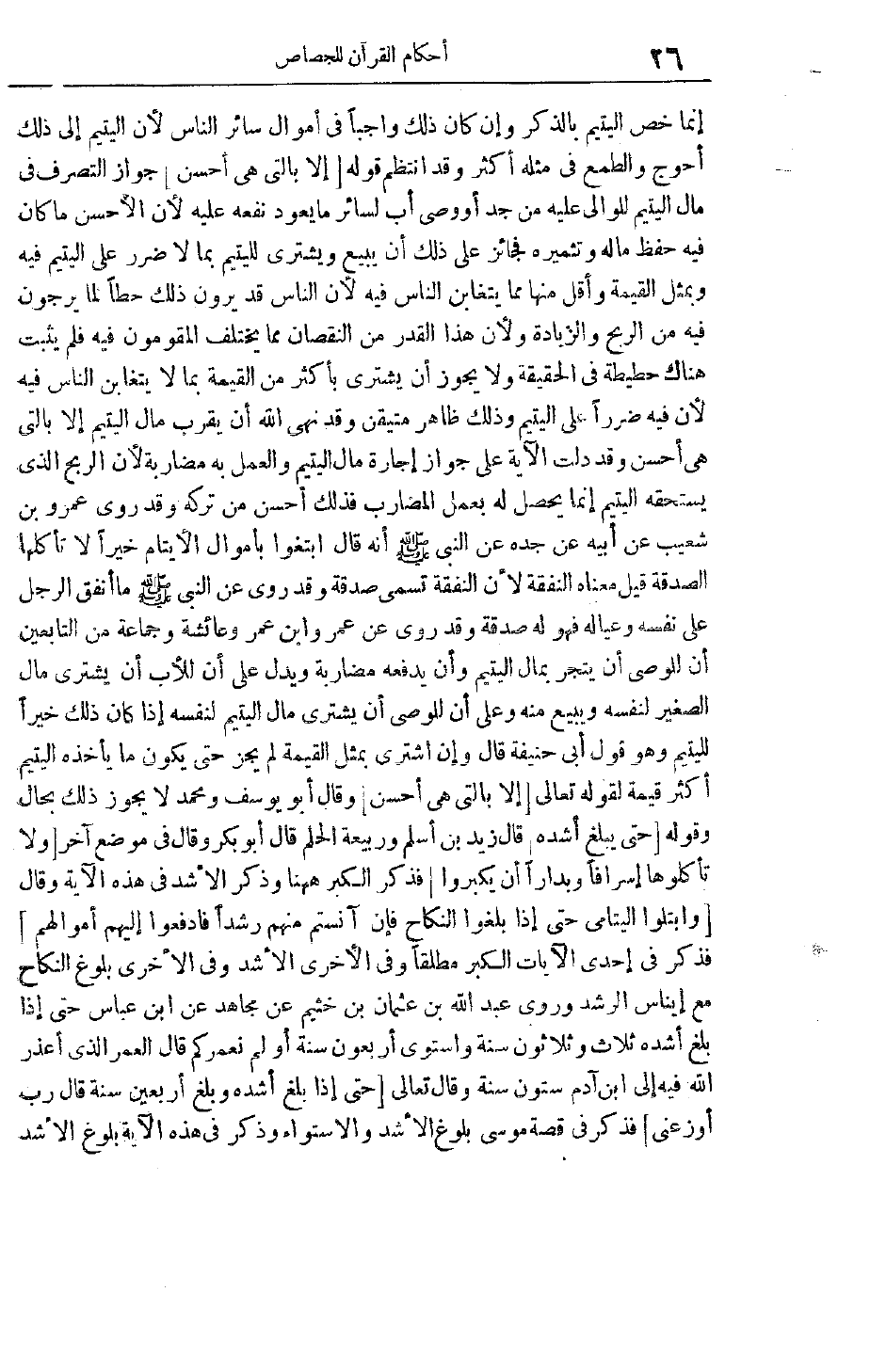 وَقَدْ رُوِيَ عَنْ عُمَرَ وَابْنِ عُمَرَ وَعَائِشَةَ وَجَمَاعَةٍ مِنْ التَّابِعِينَ أَنَّ لِلْوَصِيِّ أَنْ يَتَّجِرَ بِمَالِ الْيَتِيمِ وَأَنْ يَدْفَعَهُ مُضَارَبَةً وَيَدُلُّ عَلَى أَنَّ لِلْأَبِ أَنْ يَشْتَرِيَ مَالِ الصَّغِيرِ لِنَفْسِهِ وَيَبِيعُ مِنْهُ وَعَلَى أَنَّ لِلْوَصِيِّ أَنْ يَشْتَرِيَ مَالَ الْيَتِيمِ لِنَفْسِهِ إذَا كَانَ ذَلِكَ خَيْرًا لِلْيَتِيمِ وَهُوَ قَوْلُ أَبِي حَنِيفَةَ قَالَ وَإِنْ اشْتَرَى بِمِثْلِ الْقِيمَةِ لَمْ يَجُزْ حَتَّى يَكُونَ مَا يَأْخُذُهُ الْيَتِيمُ أَكْثَرَ قِيمَةً لقوله تعالى إِلَّا بِالَّتِي هِيَ أَحْسَنُ وَقَالَ أَبُو يُوسُفَ وَمُحَمَّدٌ لَا يَجُوزُ ذَلِكَ بحال وقوله حَتَّى يَبْلُغَ أَشُدَّهُ قَالَ زَيْدُ بْنُ أَسْلَمَ وَرَبِيعَةُ الْحُلُمَ قَالَ أَبُو بَكْرٍ وَقَالَ فِي مَوْضِعٍ آخَرَ وَلا تَأْكُلُوها إِسْرافاً وَبِداراً أَنْ يَكْبَرُوا فذكر الكبر هاهنا وَذَكَرَ الْأَشُدَّ فِي هَذِهِ الْآيَةِ وَقَالَ وَابْتَلُوا الْيَتامى حَتَّى إِذا بَلَغُوا النِّكاحَ فَإِنْ آنَسْتُمْ مِنْهُمْ رُشْداً فَادْفَعُوا إِلَيْهِمْ أَمْوالَهُمْ فَذَكَرَ فِي إحْدَى الْآيَاتِ الْكِبَرَ مُطْلَقًا وَفِي الْأُخْرَى الْأَشُدَّ وَفِي الْأُخْرَى بُلُوغَ النِّكَاحِ مَعَ إينَاسِ الرُّشْدِ وَرَوَى عَبْدُ اللَّهِ بْنُ عُثْمَانَ بْنِ خَثِيمٍ عَنْ مُجَاهِدٍ عَنْ ابْنِ عَبَّاسٍ حتى إذا بلغ أشده ثلاث وثلاثون سنة واستوى أربعون سنة أو لم نعمركم قَالَ الْعُمُرُ الَّذِي أَعْذَرَ اللَّهُ فِيهِ إلَى ابْنِ آدَمَ سِتُّونَ سَنَةً وَقَالَ تَعَالَى حَتَّى إِذا بَلَغَ أَشُدَّهُ وَبَلَغَ أَرْبَعِينَ سَنَةً قالَ رَبِّ أَوْزِعْنِي فَذَكَرَ فِي قِصَّةِ مُوسَى بُلُوغَ الْأَشُدِّ وَالِاسْتِوَاءِ وَذَكَرَ فِي هَذِهِ الْآيَةِ بُلُوغَ الْأَشُدِّ