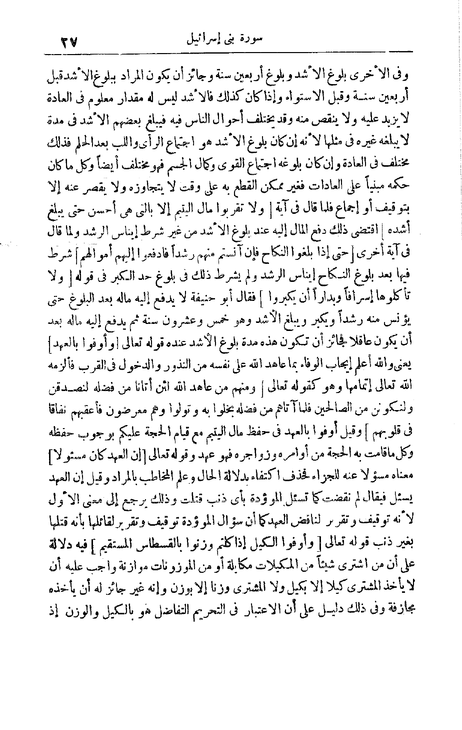 وَفِي الْأُخْرَى بُلُوغَ الْأَشُدِّ وَبُلُوغَ أَرْبَعِينَ سَنَةً وجائز أن يكون المراد ببلوغ الأشد قبل أربعين سنة وقبل الِاسْتِوَاءُ وَإِذَا كَانَ كَذَلِكَ فَالْأَشُدُّ لَيْسَ لَهُ مِقْدَارٌ مَعْلُومٌ فِي الْعَادَةِ لَا يَزِيدُ عَلَيْهِ وَلَا يُنْقَصُ مِنْهُ وَقَدْ يَخْتَلِفُ أَحْوَالُ النَّاسِ فِيهِ فَيَبْلُغُ بَعْضُهُمْ الْأَشُدَّ فِي مُدَّةٍ لَا يَبْلُغْهُ غَيْرُهُ فِي مِثْلِهَا لِأَنَّهُ إنْ كَانَ بُلُوغُ الْأَشُدِّ هُوَ اجْتِمَاعُ الرَّأْيِ وَاللُّبِّ بَعْدَ الْحُلُمِ فَذَلِكَ مُخْتَلِفٌ فِي الْعَادَةِ وَإِنْ كَانَ بُلُوغُهُ اجْتِمَاعَ الْقُوَى وَكَمَالِ الْجِسْمِ فَهُوَ مُخْتَلِفٌ أَيْضًا وَكُلُّ مَا كَانَ حُكْمُهُ مَبْنِيًّا عَلَى الْعَادَاتِ فَغَيْرُ مُمْكِنِ الْقَطْعِ بِهِ عَلَى وَقْتٍ لَا يَتَجَاوَزُهُ وَلَا يَقْصُرُ عَنْهُ إلَّا بِتَوْقِيفٍ أَوْ إجْمَاعٍ فَلَمَّا قَالَ فِي آيَةِ وَلا تَقْرَبُوا مالَ الْيَتِيمِ إِلَّا بِالَّتِي هِيَ أَحْسَنُ حَتَّى يَبْلُغَ أَشُدَّهُ اقْتَضَى ذَلِكَ دَفْعَ الْمَالِ إلَيْهِ عِنْدَ بُلُوغِ الْأَشُدِّ مِنْ غَيْرِ شَرْطِ إينَاسِ الرُّشْدِ وَلَمَّا قَالَ فِي آيَةٍ أُخْرَى حَتَّى إِذا بَلَغُوا النِّكاحَ فَإِنْ آنَسْتُمْ مِنْهُمْ رُشْداً فَادْفَعُوا إِلَيْهِمْ أَمْوالَهُمْ شَرَطَ فِيهَا بَعْدَ بُلُوغِ النِّكَاحِ إينَاسَ الرُّشْدِ ولم يشرط ذلك في بُلُوغِ حَدِّ الْكِبَرِ فِي قَوْلِهِ وَلا تَأْكُلُوها إِسْرافاً وَبِداراً أَنْ يَكْبَرُوا فَقَالَ أَبُو حَنِيفَةَ لَا يَدْفَعُ إلَيْهِ مَالَهُ بَعْدَ الْبُلُوغِ حَتَّى يُؤْنِسَ مِنْهُ رُشْدًا وَيَكْبُرَ وَيَبْلُغَ الْأَشُدَّ وَهُوَ خَمْسٌ وَعِشْرُونَ سَنَةً ثُمَّ يَدْفَعُ إلَيْهِ مَالَهُ بَعْدَ أَنْ يَكُونَ عَاقِلًا فَجَائِزٌ أَنْ تَكُونَ هَذِهِ مُدَّةَ بُلُوغِ الْأَشُدِّ عنده قوله تعالى وَأَوْفُوا بِالْعَهْدِ يَعْنِي وَاَللَّهُ أَعْلَمُ إيجَابَ الْوَفَاءِ بِمَا عَاهَدَ اللَّهَ عَلَى نَفْسِهِ مِنْ النُّذُورِ وَالدُّخُولِ فِي الْقُرَبِ فَأَلْزَمَهُ اللَّهُ تَعَالَى إتْمَامَهَا وَهُوَ كَقَوْلِهِ تَعَالَى وَمِنْهُمْ مَنْ عاهَدَ اللَّهَ لَئِنْ آتَانَا مِنْ فَضْلِهِ لَنَصَّدَّقَنَّ وَلَنَكُونَنَّ مِنَ الصَّالِحِينَ فَلَمَّا آتاهُمْ مِنْ فَضْلِهِ بَخِلُوا بِهِ وَتَوَلَّوْا وَهُمْ مُعْرِضُونَ فَأَعْقَبَهُمْ نِفاقاً فِي قُلُوبِهِمْ وَقِيلَ أَوْفُوا بِالْعَهْدِ فِي حِفْظِ مَالِ الْيَتِيمِ مَعَ قِيَامِ الْحُجَّةِ عَلَيْكُمْ بِوُجُوبِ حِفْظِهِ وَكُلُّ ما قامت به الحجة من أوامره وَزَوَاجِرِهِ فَهُوَ عَهْدٌ وقَوْله تَعَالَى إِنَّ الْعَهْدَ كانَ مَسْؤُلًا معناه مسؤلا عَنْهُ لِلْجَزَاءِ فَحُذِفَ اكْتِفَاءً بِدَلَالَةِ الْحَالِ وَعِلْمِ المخاطب بالمراد وقيل إن العهد يسئل فيقال لم نقضت كما تسئل الموؤدة بِأَيِّ ذَنْبٍ قُتِلَتْ وَذَلِكَ يَرْجِعُ إلَى مَعْنَى الْأَوَّلِ لِأَنَّهُ تَوْقِيفٌ وَتَقْرِيرٌ لِنَاقِضِ الْعَهْدِ كَمَا أن سؤال الموؤدة تَوْقِيفٌ وَتَقْرِيرٌ لِقَائِلِهَا بِأَنَّهُ قَتَلَهَا بِغَيْرِ ذَنْبٍ
