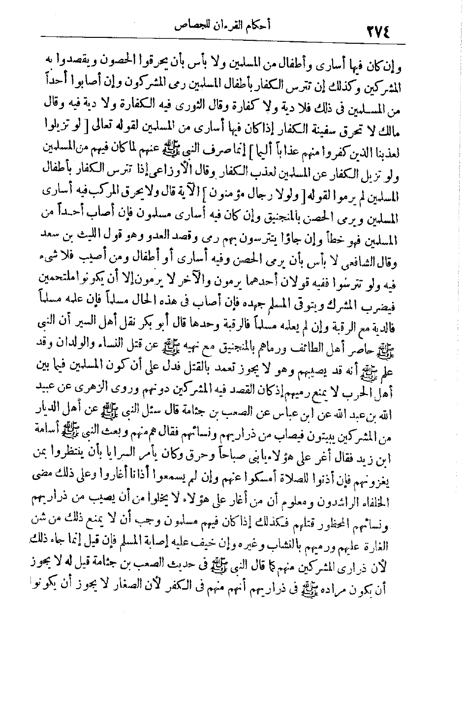 وَعَلَى ذَلِكَ مَضَى الْخُلَفَاءُ الرَّاشِدُونَ وَمَعْلُومٌ أَنَّ مَنْ أَغَارَ عَلَى هَؤُلَاءِ لا يخلوا مِنْ أَنْ يُصِيبَ مِنْ ذَرَارِيّهِمْ وَنِسَائِهِمْ الْمَحْظُورِ قَتْلُهُمْ فَكَذَلِكَ إذَا كَانَ فِيهِمْ مُسْلِمُونَ وَجَبَ أَنْ لَا يَمْنَعَ ذَلِكَ مِنْ شَنِّ الْغَارَةِ عَلَيْهِمْ وَرَمْيِهِمْ بِالنَّشَّابِ وَغَيْرِهِ وَإِنْ خِيفَ عَلَيْهِ إصَابَةُ الْمُسْلِمِ فَإِنْ قِيلَ إنَّمَا جَاءَ ذَلِكَ لِأَنَّ ذَرَارِيَ الْمُشْرِكِينَ مِنْهُمْ كَمَا قَالَ النَّبِيُّ صَلَّى اللَّهُ عَلَيْهِ وَسَلَّمَ فِي حَدِيثِ الصَّعْبِ بْنِ جَثَّامَةَ قِيلَ لَهُ لَا يَجُوزُ أَنْ يَكُونَ مُرَادُهُ صَلَّى اللَّهُ عَلَيْهِ وَسَلَّمَ فِي ذَرَارِيّهِمْ أَنَّهُمْ مِنْهُمْ فِي الْكُفْرِ لِأَنَّ الصِّغَارَ لَا يَجُوزُ أَنْ يَكُونُوا