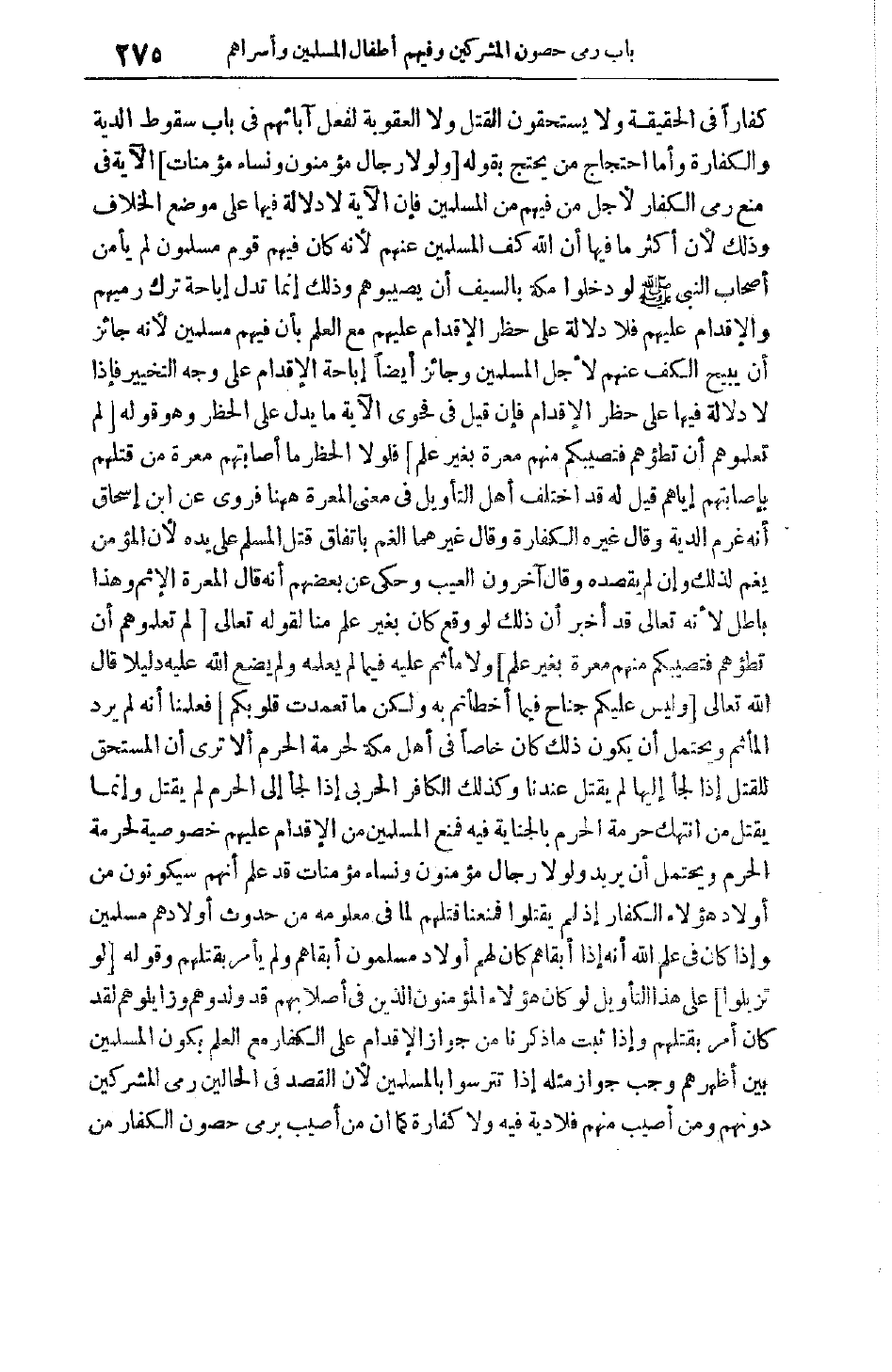 كُفَّارًا فِي الْحَقِيقَةِ وَلَا يَسْتَحِقُّونَ الْقَتْلَ وَلَا الْعُقُوبَةَ لِفِعْلِ آبَائِهِمْ فِي بَابِ سُقُوطِ الدِّيَةِ وَالْكَفَّارَةِ وَأَمَّا احْتِجَاجُ مِنْ يَحْتَجُّ بِقَوْلِهِ وَلَوْلا رِجالٌ مُؤْمِنُونَ وَنِساءٌ مُؤْمِناتٌ الْآيَةَ فِي مَنْعِ رَمْيِ الْكُفَّارِ لِأَجْلِ مَنْ فِيهِمْ مِنْ الْمُسْلِمِينَ فَإِنَّ الْآيَةَ لَا دَلَالَةَ فِيهَا عَلَى مَوْضِعِ الْخِلَافِ وَذَلِكَ لِأَنَّ أَكْثَرَ مَا فِيهَا أَنَّ اللَّهَ كَفَّ الْمُسْلِمِينَ عَنْهُمْ لِأَنَّهُ كَانَ فِيهِمْ قَوْمٌ مُسْلِمُونَ لَمْ يَأْمَنْ أَصْحَابُ النَّبِيِّ صَلَّى اللَّهُ عَلَيْهِ وَسَلَّمَ لَوْ دَخَلُوا مَكَّةَ بِالسَّيْفِ أَنْ يُصِيبُوهُمْ وَذَلِكَ إنَّمَا تدل إبَاحَةِ تَرْكِ رَمْيِهِمْ وَالْإِقْدَامِ عَلَيْهِمْ فَلَا دَلَالَةَ عَلَى حَظْرِ الْإِقْدَامِ عَلَيْهِمْ مَعَ الْعِلْمِ بِأَنَّ فِيهِمْ مُسْلِمِينَ لِأَنَّهُ جَائِزٌ أَنْ يُبِيحَ الْكَفَّ عَنْهُمْ لِأَجْلِ الْمُسْلِمِينَ وَجَائِزٌ أَيْضًا إبَاحَةُ الْإِقْدَامِ عَلَى وَجْهِ التَّخْيِيرِ فَإِذًا لَا دَلَالَةَ فِيهَا عَلَى حَظْرِ الْإِقْدَامِ فَإِنْ قِيلَ فِي فَحَوَى الْآيَةِ مَا يَدُلُّ عَلَى الْحَظْرِ وَهُوَ قَوْلُهُ لَمْ تَعْلَمُوهُمْ أَنْ تَطَؤُهُمْ فَتُصِيبَكُمْ مِنْهُمْ مَعَرَّةٌ بِغَيْرِ عِلْمٍ فَلَوْلَا الْحَظْرُ مَا أَصَابَتْهُمْ مَعَرَّةٌ مِنْ قَتْلِهِمْ بِإِصَابَتِهِمْ إيَّاهُمْ قِيلَ لَهُ قَدْ اخْتَلَفَ أَهْلُ التأويل في معنى المعرة هاهنا فَرُوِيَ عَنْ ابْنِ إِسْحَاقَ أَنَّهُ غُرْمُ الدِّيَةِ وَقَالَ غَيْرُهُ الْكَفَّارَةُ وَقَالَ غَيْرُهُمَا الْغَمُّ بِاتِّفَاقِ قتل المسلم على يده لأن المؤمن يغم لِذَلِكَ وَإِنْ لَمْ يَقْصِدْهُ وَقَالَ آخَرُونَ الْعَيْبُ وَحُكِيَ عَنْ بَعْضِهِمْ أَنَّهُ قَالَ الْمَعَرَّةُ الْإِثْمُ وَهَذَا بَاطِلٌ لِأَنَّهُ تَعَالَى قَدْ أَخْبَرَ أَنَّ ذَلِكَ لَوْ وَقَعَ كَانَ بِغَيْرِ عِلْمٍ مِنَّا لقوله تعالى لَمْ تَعْلَمُوهُمْ أَنْ تَطَؤُهُمْ فَتُصِيبَكُمْ مِنْهُمْ مَعَرَّةٌ بِغَيْرِ عِلْمٍ وَلَا مَأْثَمَ عَلَيْهِ فِيمَا لَمْ يَعْلَمْهُ وَلَمْ يَضَعْ اللَّهُ عَلَيْهِ دَلِيلًا قَالَ اللَّهُ تَعَالَى وَلَيْسَ عَلَيْكُمْ جُناحٌ فِيما أَخْطَأْتُمْ بِهِ وَلكِنْ ما تَعَمَّدَتْ قُلُوبُكُمْ فَعَلِمْنَا أَنَّهُ لَمْ يُرِدْ الْمَأْثَمَ وَيُحْتَمَلُ أَنْ يَكُونَ ذَلِكَ كَانَ خَاصًّا فِي أَهْلِ مَكَّةَ لِحُرْمَةِ الْحَرَمِ أَلَا تَرَى أَنَّ الْمُسْتَحِقَّ لِلْقَتْلِ إذَا لَجَأَ إلَيْهَا لَمْ يُقْتَلْ عِنْدَنَا وَكَذَلِكَ الْكَافِرُ الْحَرْبِيُّ إذَا لَجَأَ إلَى الْحَرَمِ لَمْ يُقْتَلْ وَإِنَّمَا يُقْتَلُ مَنْ انْتَهَكَ حُرْمَةَ الْحَرَمِ بِالْجِنَايَةِ فِيهِ فَمَنْعُ الْمُسْلِمِينَ مِنْ الْإِقْدَامِ عَلَيْهِمْ خُصُوصِيَّةٌ لِحُرْمَةِ الْحَرَمِ وَيُحْتَمَلُ أَنْ يُرِيدَ وَلَوْلَا رِجَالٌ مُؤْمِنُونَ وَنِسَاءٌ مُؤْمِنَاتٍ قَدْ عُلِمَ أَنَّهُمْ سيكونون من أولاد هؤلاء الكفار إذ لَمْ يُقْتَلُوا فَمَنَعَنَا قَتْلَهُمْ لِمَا فِي مَعْلُومِهِ مِنْ حُدُوثِ أَوْلَادِهِمْ مُسْلِمِينَ وَإِذَا كَانَ فِي عِلْمِ اللَّهِ أَنَّهُ إذَا أَبْقَاهُمْ كَانَ لَهُمْ أَوْلَادٌ مُسْلِمُونَ أَبْقَاهُمْ وَلَمْ يَأْمُرْ بِقَتْلِهِمْ وَقَوْلُهُ لَوْ تَزَيَّلُوا عَلَى هَذَا التَّأْوِيلِ لَوْ كَانَ هَؤُلَاءِ الْمُؤْمِنُونَ الَّذِينَ فِي أَصْلَابِهِمْ قَدْ وَلَدُوهُمْ وَزَايَلُوهُمْ لَقَدْ كَانَ أَمَرَ بِقَتْلِهِمْ وَإِذَا ثَبَتَ مَا ذَكَرْنَا مِنْ جَوَازِ الْإِقْدَامِ عَلَى الْكُفَّارِ مَعَ الْعِلْمِ بِكَوْنِ الْمُسْلِمِينَ بَيْنَ أَظْهُرِهِمْ وَجَبَ جَوَازُ مِثْلِهِ إذَا تَتَرَّسُوا بِالْمُسْلِمِينَ لِأَنَّ ال