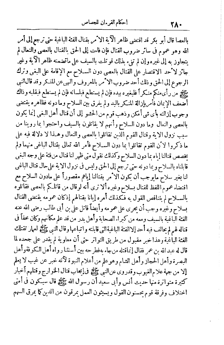 بالعصا قَالَ أَبُو بَكْرٍ قَدْ اقْتَضَى ظَاهِرُ الْآيَةِ الْأَمْرَ بِقِتَالِ الْفِئَةِ الْبَاغِيَةِ حَتَّى تَرْجِعَ إلَى أَمْرِ اللَّهِ وَهُوَ عُمُومٌ فِي سَائِرِ ضُرُوبِ الْقِتَالِ فَإِنْ فَاءَتْ إلَى الْحَقِّ بِالْقِتَالِ بِالْعِصِيِّ وَالنِّعَالِ لَمْ يُتَجَاوَزْ بِهِ إلَى غَيْرِهِ وَإِنْ لَمْ تَفِئْ بِذَلِكَ قُوتِلَتْ بِالسَّيْفِ عَلَى مَا تَضَمَّنَهُ ظَاهِرُ الْآيَةِ وَغَيْرُ جَائِزٍ لِأَحَدٍ الِاقْتِصَارُ عَلَى الْقِتَالِ بِالْعِصِيِّ دُونَ السِّلَاحِ مَعَ الْإِقَامَةِ عَلَى الْبَغْيِ وَتَرْكِ الرُّجُوعِ إلَى الْحَقِّ وَذَلِكَ أَحَدُ ضُرُوبِ الْأَمْرِ بِالْمَعْرُوفِ وَالنَّهْيِ عَنْ الْمُنْكَرِ