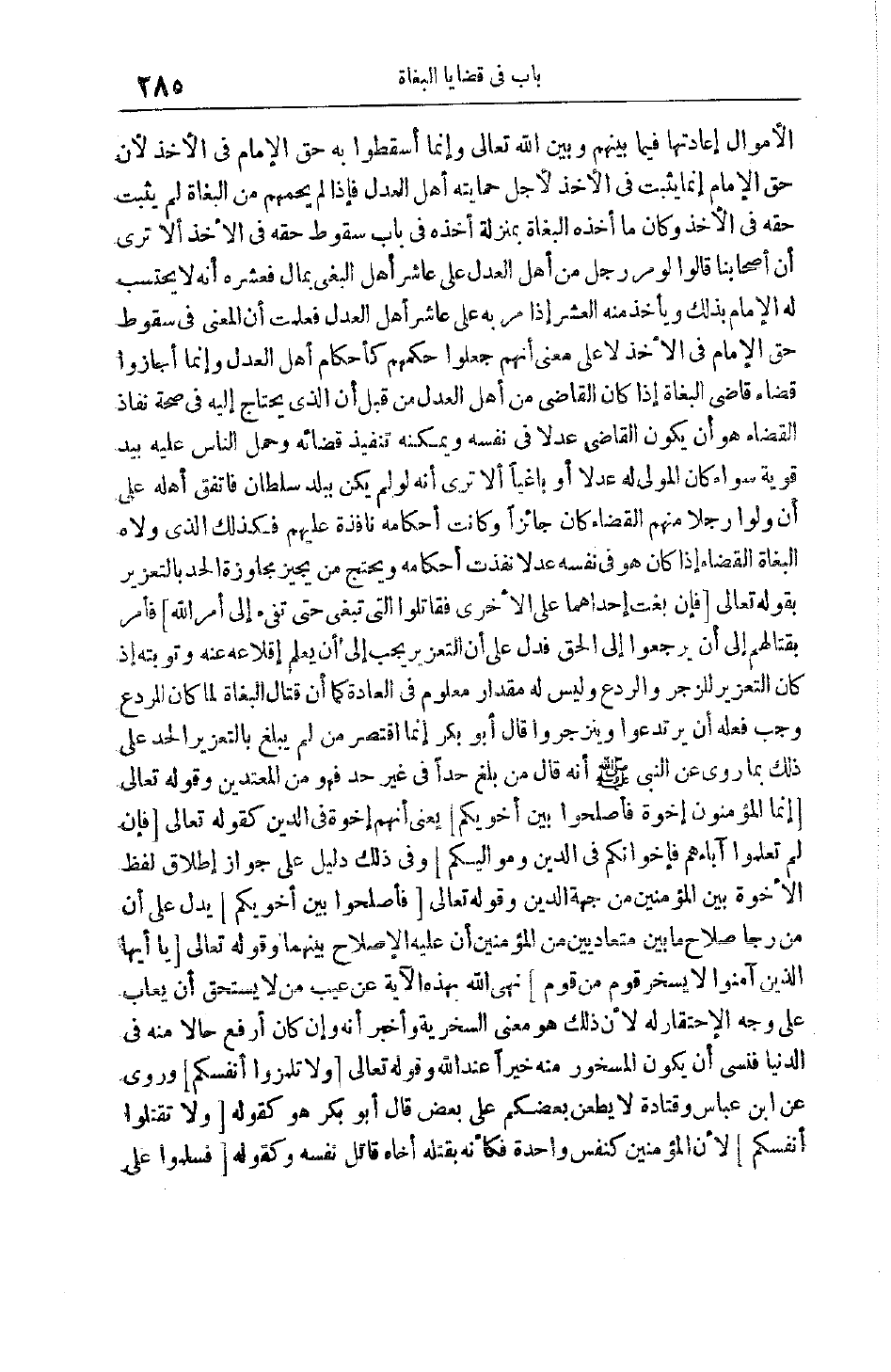 الْأَمْوَالِ إعَادَتَهَا فِيمَا بَيْنَهُمْ وَبَيْنَ اللَّهِ تَعَالَى وَإِنَّمَا أَسْقَطُوا بِهِ حَقَّ الْإِمَامِ فِي الْأَخْذِ لِأَنَّ حَقَّ الْإِمَامِ إنَّمَا يَثْبُتُ فِي الْأَخْذِ لِأَجْلِ حِمَايَتِهِ أَهْلَ الْعَدْلِ فَإِذَا لَمْ يَحْمِهِمْ مِنْ الْبُغَاةِ لَمْ يَثْبُتْ حَقُّهُ فِي الْأَخْذِ وَكَانَ مَا أَخَذَهُ الْبُغَاةُ بِمَنْزِلَةِ أَخْذِهِ فِي بَابِ سُقُوطِ حَقِّهِ فِي الْأَخْذِ أَلَا تَرَى أَنَّ أَصْحَابَنَا قَالُوا لَوْ مَرَّ رِجْلٌ مِنْ أَهْلِ الْعَدْلِ عَلَى عَاشِرِ أَهْلِ الْبَغْيِ بِمَالٍ فَعَشَرَهُ أَنَّهُ لَا يَحْتَسِبُ لَهُ الْإِمَامُ بِذَلِكَ وَيَأْخُذُ مِنْهُ الْعُشْرَ إذَا مَرَّ بِهِ عَلَى عَاشِرِ أَهْلِ الْعَدْلِ فَعَلِمْت أَنَّ الْمَعْنَى فِي سُقُوطِ حَقِّ الْإِمَامِ فِي الْأَخْذِ لَا عَلَى مَعْنَى أَنَّهُمْ جَعَلُوا حُكْمَهُمْ كَأَحْكَامِ أَهْلِ الْعَدْلِ وَإِنَّمَا أَجَازُوا قَضَاءَ قَاضِي الْبُغَاةِ إذَا كَانَ الْقَاضِي مِنْ أَهْلِ الْعَدْلِ مِنْ قِبَلِ أَنَّ الَّذِي يُحْتَاجُ إلَيْهِ فِي صِحَّةِ نَفَاذِ الْقَضَاءِ هُوَ أَنْ يَكُونَ الْقَاضِي عَدْلًا فِي نَفْسِهِ وَيُمْكِنُهُ تَنْفِيذُ قَضَائِهِ وَحَمْلُ النَّاسِ عَلَيْهِ بِيَدٍ قَوِيَّةٍ سَوَاءٌ كَانَ الْمُوَلِّي لَهُ عَدْلًا أَوْ بَاغِيًا أَلَا تَرَى أَنَّهُ لَوْ لَمْ يَكُنْ بِبَلَدِ سُلْطَانٍ فَاتَّفَقَ أَهْلُهُ عَلَى أَنْ وَلَّوْا رَجُلًا مِنْهُمْ الْقَضَاءَ كَانَ جَائِزًا وَكَانَتْ أَحْكَامُهُ نَافِذَةً عَلَيْهِمْ فَكَذَلِكَ الَّذِي وَلَّاهُ الْبُغَاةُ الْقَضَاءَ إذَا كَانَ هُوَ فِي نَفْسِهِ عَدْلًا نَفَذَتْ أَحْكَامُهُ وَيَحْتَجُّ مَنْ يُجِيزُ مُجَاوَزَةَ الْحَدِّ بِالتَّعْزِيرِ بِقَوْلِهِ تَعَالَى فَإِنْ بَغَتْ إِحْداهُما عَلَى الْأُخْرى فَقاتِلُوا الَّتِي تَبْغِي حَتَّى تَفِيءَ إِلى أَمْرِ اللَّهِ فَأَمَرَ بِقِتَالِهِمْ إلَى أَنْ يَرْجِعُوا إلَى الْحَقِّ فَدَلَّ عَلَى أَنَّ التَّعْزِيرَ يَجِبُ إلَى أَنْ يُعْلَمَ إقْلَاعُهُ عَنْهُ وَتَوْبَتُهُ إذْ كَانَ التَّعْزِيرُ لِلزَّجْرِ وَالرَّدْعِ وَلَيْسَ لَهُ مِقْدَارٌ مَعْلُومٌ فِي الْعَادَةِ كَمَا أَنَّ قِتَالَ الْبُغَاةِ لَمَّا كَانَ المردع وَجَبَ فِعْلُهُ أَنْ يَرْتَدِعُوا وَيَنْزَجِرُوا قَالَ أَبُو بَكْرٍ إنَّمَا اقْتَصَرَ مَنْ لَمْ يَبْلُغْ بِالتَّعْزِيرِ الْحَدَّ عَلَى ذَلِكَ بِمَا