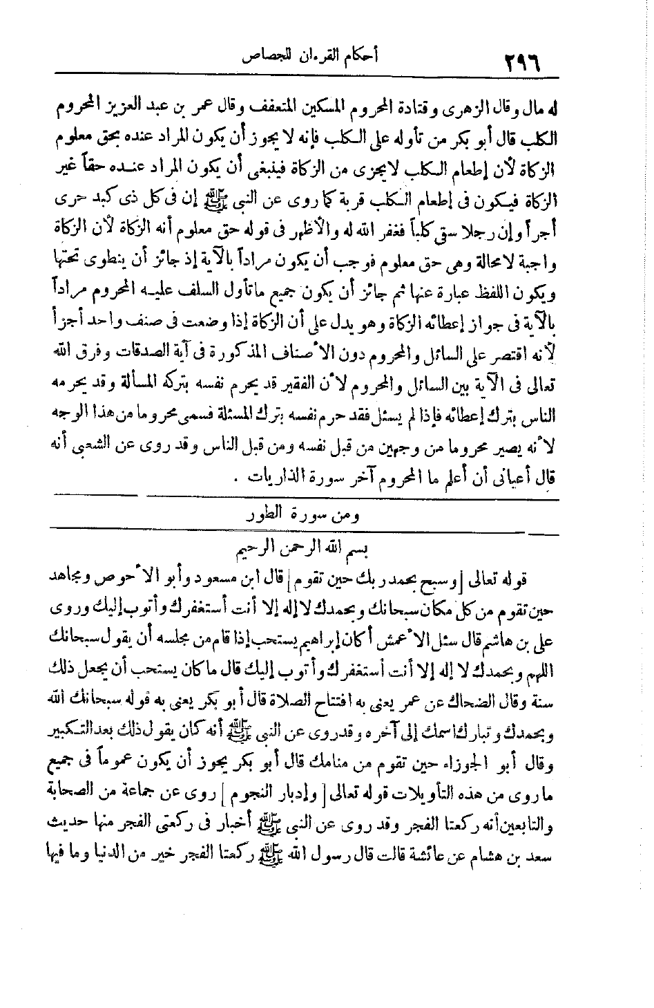 وَقَالَ أَبُو الْجَوْزَاءِ حِينَ تَقُومُ مِنْ مَنَامِك قَالَ أَبُو بَكْرٍ يَجُوزُ أَنْ يَكُونَ عُمُومًا فِي جَمِيعِ مَا رُوِيَ مِنْ هَذِهِ التَّأْوِيلَاتِ قَوْله تَعَالَى وَإِدْبارَ النُّجُومِ رُوِيَ عَنْ جَمَاعَةٍ مِنْ الصَّحَابَةِ وَالتَّابِعِينَ أَنَّهُ رَكْعَتَا الْفَجْرِ وَقَدْ رُوِيَ عَنْ النَّبِيِّ صَلَّى اللَّهُ عَلَيْهِ وَسَلَّمَ أَخْبَارٌ فِي رَكْعَتَيْ الْفَجْرِ مِنْهَا