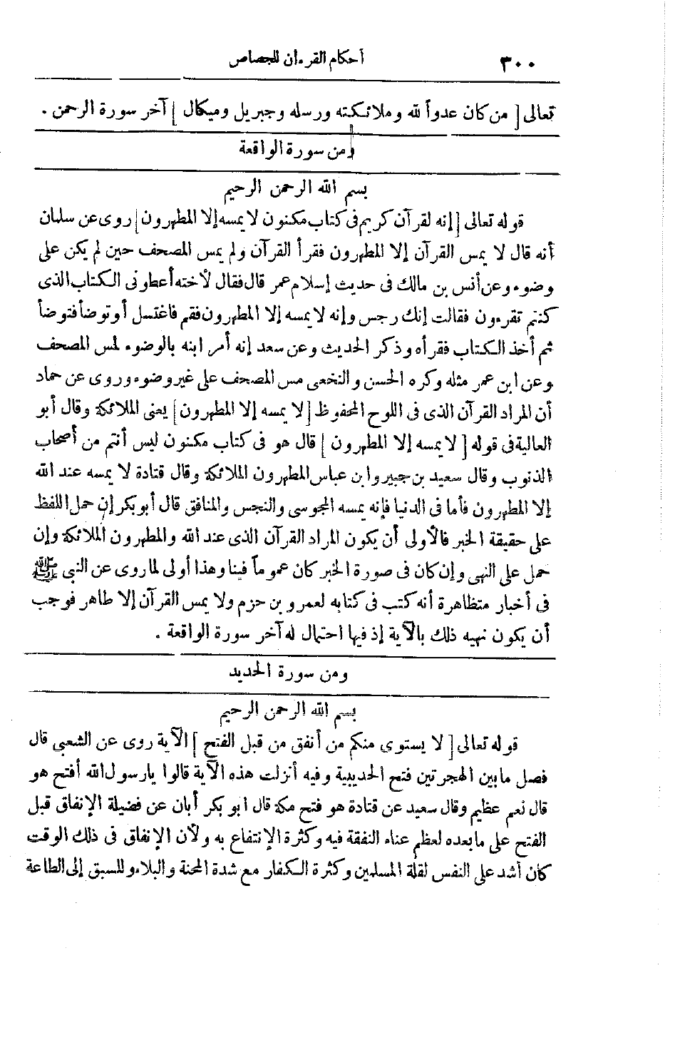 قَوْله تعالى إِنَّهُ لَقُرْآنٌ كَرِيمٌ فِي كِتابٍ مَكْنُونٍ لا يَمَسُّهُ إِلَّا الْمُطَهَّرُونَ رُوِيَ عَنْ سَلْمَانُ أَنَّهُ قَالَ لَا يَمَسُّ الْقُرْآنَ إلَّا الْمُطَهَّرُونَ فَقَرَأَ الْقُرْآنَ وَلَمْ يَمَسَّ الْمُصْحَفَ حِينَ لَمْ يَكُنْ عَلَى وُضُوءٍ وَعَنْ أَنَسِ بْنِ مَالِكٍ فِي حَدِيثِ إسْلَامِ عُمَرَ قَالَ فَقَالَ لِأُخْتِهِ أَعْطَوْنِي الْكِتَابَ الَّذِي كُنْتُمْ تَقْرَءُونَ فَقَالَتْ إنَّك رِجْسٌ وَإِنَّهُ لَا يَمَسُّهُ إلَّا الْمُطَهَّرُونَ فَقُمْ فَاغْتَسَلَ أَوْ تَوَضَّأَ فَتَوَضَّأَ ثُمَّ أَخَذَ الْكِتَابَ فَقَرَأَهُ وَذَكَرَ الْحَدِيثَ وَعَنْ سَعْدٍ أَنَّهُ أَمَرَ ابْنَهُ بِالْوُضُوءِ لِمَسِّ الْمُصْحَفِ وَعَنْ ابْنِ عُمَرَ مِثْلُهُ وَكَرِهَ الْحَسَنُ وَالنَّخَعِيُّ مَسَّ الْمُصْحَفِ عَلَى غَيْرِ وُضُوءٍ وَرُوِيَ عَنْ حَمَّادٍ أَنَّ الْمُرَادَ الْقُرْآنُ الَّذِي فِي اللَّوْحِ المحفوظ لا يَمَسُّهُ إِلَّا الْمُطَهَّرُونَ يَعْنِي الْمَلَائِكَةَ وَقَالَ أَبُو الْعَالِيَةِ فِي قَوْلِهِ لا يَمَسُّهُ إِلَّا الْمُطَهَّرُونَ قَالَ هُوَ فِي كِتَابِ مَكْنُونٍ لَيْسَ أَنْتُمْ مِنْ أَصْحَابِ الذُّنُوبِ وَقَالَ سَعِيدُ بْنُ جُبَيْرٍ وَابْنُ عَبَّاسٍ الْمُطَهَّرُونَ الْمَلَائِكَةُ وَقَالَ قَتَادَةُ لَا يَمَسُّهُ عِنْدَ اللَّهِ إلَّا الْمُطَهَّرُونَ فَأَمَّا فِي الدُّنْيَا فَإِنَّهُ يَمَسُّهُ الْمَجُوسِيُّ وَالنَّجِسُ وَالْمُنَافِقُ قَالَ أَبُو بَكْرٍ إنْ حُمِلَ اللَّفْظُ عَلَى حَقِيقَةِ الْخَبَرِ فَالْأَوْلَى أَنْ يَكُونَ الْمُرَادُ الْقُرْآنَ الَّذِي عِنْدَ اللَّهِ وَالْمُطَهَّرُونَ الْمَلَائِكَةُ وَإِنْ حُمِلَ عَلَى النَّهْيِ وَإِنْ كَانَ فِي صُورَةِ الْخَبَرِ كَانَ عُمُومًا فِينَا وَهَذَا أَوْلَى لِمَا