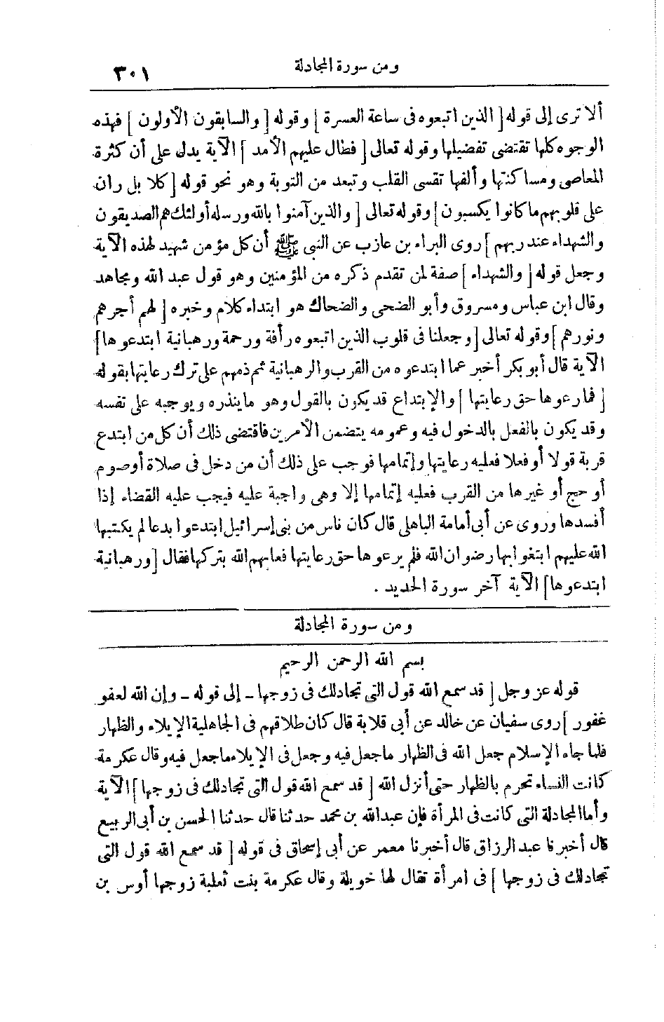 قَوْلُهُ عَزَّ وَجَلَّ قَدْ سَمِعَ اللَّهُ قَوْلَ الَّتِي تُجادِلُكَ فِي زَوْجِها- إلى قوله- وَإِنَّ اللَّهَ لَعَفُوٌّ غَفُورٌ رَوَى سُفْيَانُ عَنْ خَالِدٍ عَنْ أَبِي قلابة قَالَ كَانَ طَلَاقُهُمْ فِي الْجَاهِلِيَّةِ الْإِيلَاءَ وَالظِّهَارَ فَلَمَّا جَاءَ الْإِسْلَامُ جَعَلَ اللَّهُ فِي الظِّهَارِ مَا جَعَلَ فِيهِ وَجَعَلَ فِي الْإِيلَاءِ مَا جَعَلَ فِيهِ وَقَالَ عِكْرِمَةُ كَانَتْ النِّسَاءُ تُحَرَّمُ بِالظِّهَارِ حَتَّى أَنْزَلَ اللَّهُ قَدْ سَمِعَ اللَّهُ قَوْلَ الَّتِي تُجادِلُكَ فِي زَوْجِها الْآيَةَ وَأَمَّا الْمُجَادَلَةُ الَّتِي كَانَتْ فِي الْمَرْأَةِ فَإِنَّ