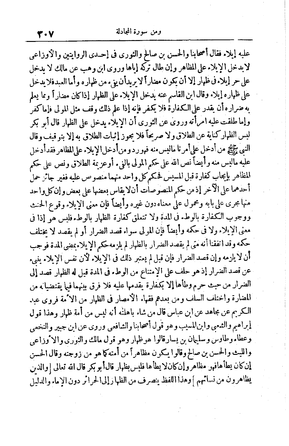 وَأَيْضًا نَصَّ اللَّهُ عَلَى حُكْمِ الْمُولِي بِالْفَيْءِ أَوْ عَزِيمَةِ الطَّلَاقِ وَنَصَّ عَلَى حُكْمِ الْمُظَاهِرِ بِإِيجَابِ كَفَّارَةٍ قَبْلَ الْمَسِيسِ فَحُكْمُ كُلِّ وَاحِدٍ مِنْهُمَا مَنْصُوصٌ عَلَيْهِ فَغَيْرُ جَائِزٍ حَمْلُ أَحَدِهِمَا عَلَى الْآخَرِ إذْ مِنْ حُكْمِ الْمَنْصُوصَاتِ أَنْ لَا يُقَاسَ بَعْضُهَا عَلَى بَعْضٍ وَأَنَّ كُلَّ وَاحِدٍ مِنْهَا مُجْرًى عَلَى بَابِهِ وَمَحْمُولٌ عَلَى مَعْنَاهُ دُونَ غَيْرِهِ وَأَيْضًا فَإِنَّ مَعْنَى الْإِيلَاءِ وُقُوعُ الْحِنْثِ وَوُجُوبُ الْكَفَّارَةِ بِالْوَطْءِ فِي الْمُدَّةِ وَلَا تَتَعَلَّقُ كَفَّارَةُ الظِّهَارِ بِالْوَطْءِ فَلَيْسَ هُوَ إذًا فِي مَعْنَى الْإِيلَاءِ وَلَا فِي حُكْمِهِ وَأَيْضًا فَإِنَّ الْمُولَى سَوَاءٌ قَصَدَ الضِّرَارَ أَوْ لَمْ يَقْصِدْ لَا يَخْتَلِفُ حُكْمُهُ وَقَدْ اتَّفَقْنَا أَنَّهُ مَتَى لَمْ يَقْصِدْ الضِّرَارَ بِالظِّهَارِ لَمْ يَلْزَمْهُ حُكْمُ الْإِيلَاءِ بِمُضِيِّ الْمُدَّةِ فَوَجَبَ أَنْ لَا يَلْزَمَهُ وَإِنْ قَصَدَ الضِّرَارَ فَإِنْ قِيلَ لَمْ يُعْتَبَرْ ذَلِكَ فِي الْإِيلَاءِ لِأَنَّ نَفْسَ الْإِيلَاءِ يُنْبِئُ عَنْ قَصْدِ الضِّرَارِ إذْ هُوَ حَلِفٌ عَلَى الِامْتِنَاعِ مِنْ الْوَطْءِ فِي الْمُدَّةِ قِيلَ لَهُ الظِّهَارُ قَصْدٌ إلى الضرار من حيث حرم وطؤها إلَّا بِكَفَّارَةٍ يُقَدِّمُهَا عَلَيْهِ فَلَا فَرْقَ بَيْنَهُمَا فِيمَا يَقْتَضِيَانِهِ مِنْ الْمُضَارَّةِ وَاخْتَلَفَ السَّلَفُ وَمَنْ بعدهم فقهاء الْأَمْصَارِ فِي الظِّهَارِ مِنْ الْأَمَةِ فَرَوَى عَبْدُ الْكَرِيمِ عَنْ مُجَاهِدٍ عَنْ ابْنِ عَبَّاسٍ قَالَ مَنْ شَاءَ بَاهَلْتُهُ أَنَّهُ لَيْسَ مِنْ أَمَةٍ ظِهَارٌ وَهَذَا قَوْلُ إبْرَاهِيمَ وَالشَّعْبِيِّ وَابْنِ الْمُسَيِّبِ وَهُوَ قَوْلُ أَصْحَابِنَا وَالشَّافِعِيِّ وَرُوِيَ عَنْ ابْنِ جُبَيْرٍ وَالنَّخَعِيُّ وَعَطَاءٍ وَطَاوُسٍ وَسُلَيْمَانَ بْنِ يَسَارٍ قَالُوا هُوَ ظِهَارٌ وَهُوَ قَوْلُ مَالِكٍ وَالثَّوْرِيُّ وَالْأَوْزَاعِيّ وَاللَّيْثُ وَالْحَسَنُ بْنُ صَالِحٍ وَقَالُوا يَكُونُ مُظَاهِرًا مِنْ أَمَتِهِ كَمَا هُوَ مِنْ زَوْجَتِهِ وَقَالَ الْحَسَنُ إنْ كَانَ يَطَأُهَا فَهُوَ مُظَاهِرٌ وَإِنْ كَانَ لَا يَطَأُهَا فَلَيْسَ بِظِهَارٍ قَالَ أَبُو بَكْرٍ قَالَ اللَّهُ تَعَالَى وَالَّذِينَ يُظاهِرُونَ مِنْ نِسائِهِمْ وَهَذَا اللَّفْظُ يَنْصَرِفُ مِنْ الظِّهَارِ إلَى الْحَرَائِرِ دُونَ الْإِمَاءِ وَالدَّلِيلُ