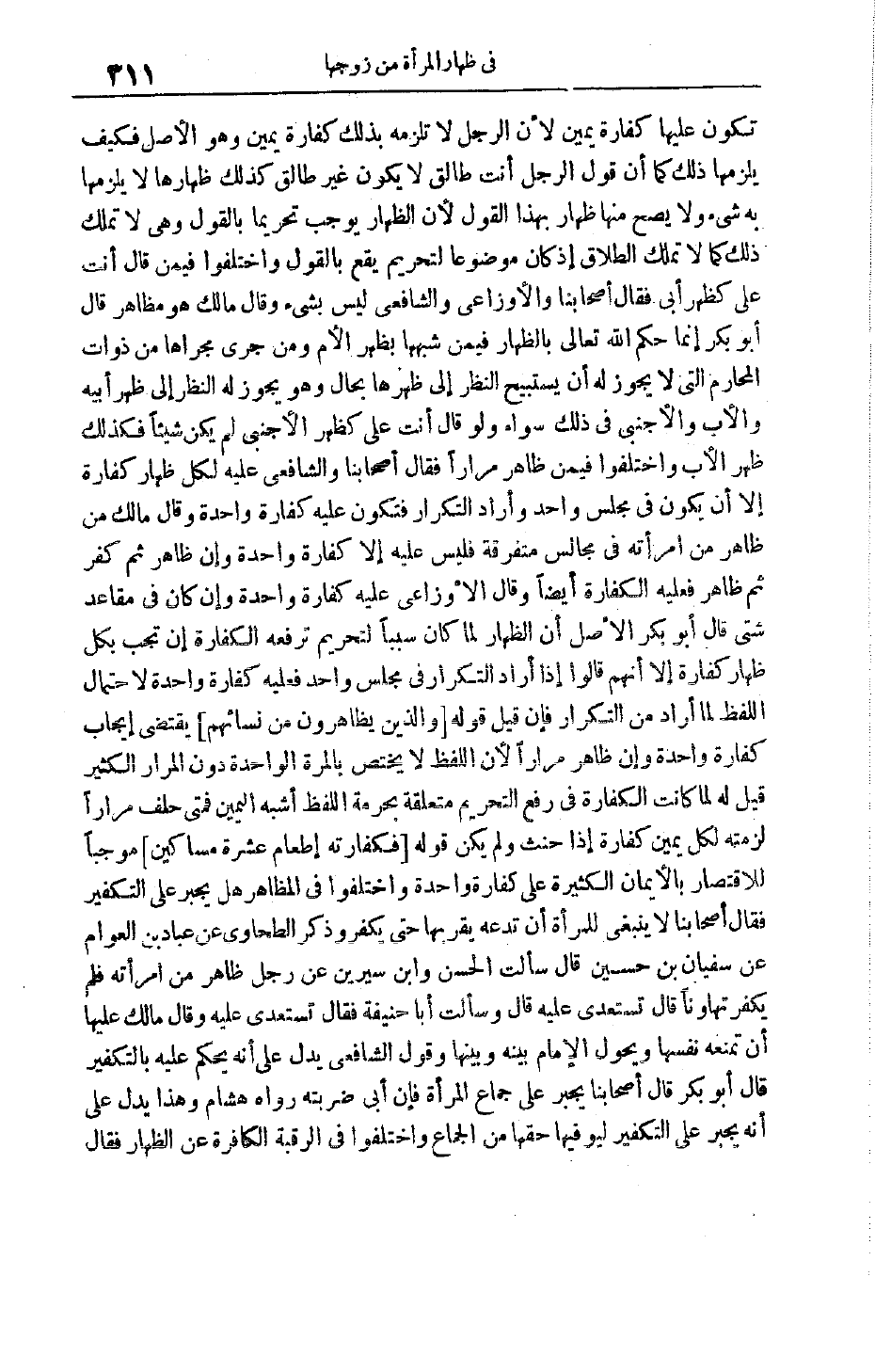 تَكُونَ عَلَيْهَا كَفَّارَةُ يَمِينٍ لِأَنَّ الرَّجُلَ لَا تَلْزَمُهُ بِذَلِكَ كَفَّارَةُ يَمِينٍ وَهُوَ الْأَصْلُ فَكَيْفَ يَلْزَمُهَا ذَلِكَ كَمَا أَنَّ قَوْلَ الرَّجُلِ أَنْتِ طَالِقٌ لَا يَكُونُ غَيْرَ طَالِقٍ كَذَلِكَ ظِهَارُهَا لَا يَلْزَمُهَا بِهِ شَيْءٌ وَلَا يَصِحُّ مِنْهَا ظِهَارٌ بِهَذَا الْقَوْلِ لِأَنَّ الظِّهَارَ يُوجِبُ تَحْرِيمًا بِالْقَوْلِ وَهِيَ لَا تَمْلِكُ ذَلِكَ كَمَا لَا تَمْلِكُ الطَّلَاقَ إذْ كَانَ مَوْضُوعًا لِتَحْرِيمٍ يَقَعُ بِالْقَوْلِ وَاخْتَلَفُوا فِيمَنْ قَالَ أَنْتِ عَلَيَّ كَظَهْرِ أَبِي فَقَالَ أَصْحَابُنَا وَالْأَوْزَاعِيّ وَالشَّافِعِيُّ لَيْسَ بِشَيْءٍ وَقَالَ مَالِكٌ هُوَ مُظَاهِرٌ قَالَ أَبُو بَكْرٍ إنَّمَا حَكَمَ اللَّهُ تَعَالَى بِالظِّهَارِ فِيمَنْ شَبَّهَهَا بِظَهْرِ الْأُمِّ وَمَنْ جَرَى مَجْرَاهَا مِنْ ذَوَاتِ الْمَحَارِمِ الَّتِي لَا يَجُوزُ لَهُ أَنْ يَسْتَبِيحَ النَّظَرَ إلَى ظَهْرِهَا بِحَالٍ وَهُوَ يَجُوزُ لَهُ النَّظَرُ إلَى ظَهْرِ أَبِيهِ وَالْأَبُ وَالْأَجْنَبِيُّ فِي ذَلِكَ سَوَاءٌ وَلَوْ قَالَ أَنْتِ عَلَيَّ كَظَهْرِ الْأَجْنَبِيِّ لَمْ يَكُنْ شَيْئًا فَكَذَلِكَ ظَهْرُ الْأَبِ وَاخْتَلَفُوا فِيمَنْ ظَاهَرَ مِرَارًا فَقَالَ أَصْحَابُنَا وَالشَّافِعِيُّ عَلَيْهِ لِكُلِّ ظِهَارٍ كَفَّارَةٌ إلَّا أَنْ يَكُونَ فِي مَجْلِسٍ وَاحِدٍ وَأَرَادَ التَّكْرَارَ فَتَكُونَ عَلَيْهِ كَفَّارَةٌ وَاحِدَةٌ وَقَالَ مَالِكٌ مَنْ ظَاهَرَ مِنْ امْرَأَتِهِ فِي مَجَالِسَ مُتَفَرِّقَةٍ فَلَيْسَ عَلَيْهِ إلَّا كَفَّارَةٌ وَاحِدَةٌ وَإِنْ ظَاهَرَ ثُمَّ كَفَّرَ ثُمَّ ظَاهَرَ فَعَلَيْهِ الْكَفَّارَةُ أَيْضًا وَقَالَ الْأَوْزَاعِيُّ عَلَيْهِ كَفَّارَةٌ وَاحِدَةٌ وَإِنْ كَانَ فِي مَقَاعِدَ شَتَّى قَالَ أَبُو بَكْرٍ الْأَصْلُ أَنَّ الظِّهَارَ لَمَّا كَانَ سَبَبًا لِتَحْرِيمٍ تَرْفَعُهُ الْكَفَّارَةُ أَنْ تَجِبَ بِكُلِّ ظِهَارٍ كَفَّارَةٌ إلَّا أَنَّهُمْ قَالُوا إذَا أَرَادَ التَّكْرَارَ فِي مَجْلِسٍ وَاحِدٍ فَعَلَيْهِ كَفَّارَةٌ وَاحِدَةٌ لِاحْتِمَالِ اللَّفْظِ لِمَا أَرَادَ مِنْ التَّكْرَارِ فَإِنْ قِيلَ قَوْلُهُ وَالَّذِينَ يُظاهِرُونَ مِنْ نِسائِهِمْ يَقْتَضِي إيجَابَ كَفَّارَةٍ وَاحِدَةٍ وَإِنْ ظَاهَرَ مِرَارًا لِأَنَّ اللَّفْظَ لَا يَخْتَصُّ بِالْمَرَّةِ الْوَاحِدَةِ دُونَ المرار الكثير قِيلَ لَهُ لَمَّا كَانَتْ الْكَفَّارَةُ فِي رَفْعِ التَّحْرِيمِ مُتَعَلِّقَةً بِحُرْمَةِ اللَّفْظِ أَشْبَهَ الْيَمِينَ فَمَتَى حَلَفَ مِرَارًا لَزِمَتْهُ لِكُلِّ يَمِينٍ كَفَّارَةٌ إذَا حَنِثَ وَلَمْ يَكُنْ قَوْلُهُ فَكَفَّارَتُهُ إِطْعامُ عَشَرَةِ مَساكِينَ مُوجِبًا لِلِاقْتِصَارِ بِالْأَيْمَانِ الْكَثِيرَةِ عَلَى كَفَّارَةٍ وَاحِدَةٍ وَاخْتَلَفُوا فِي الْمُظَاهِرِ هَلْ يُجْبَرُ عَلَى التَّكْفِيرِ فَقَالَ أَصْحَابُنَا لَا يَنْبَغِي لِلْمَرْأَةِ أَنْ تَدَعَهُ يَقْرَبُهَا حَتَّى يُكَفِّرَ وَذَكَرَ الطحاوي عَنْ عَبَّادُ بْنُ الْعَوَّامِ عَنْ سُفْيَانَ بْنِ حُسَيْنٍ قَالَ سَأَلْت الْحَسَنَ وَابْنَ سِيرِينَ عَنْ رِجْلٍ ظَاهَرَ مِنْ امْرَأَتِهِ فَلَمْ يُكَفِّرْ تَهَاوُنًا قَالَ تَسْتَعِدِّي عَلَيْهِ قَالَ وَسَأَلْت أَبَا حَنِيفَةَ فَقَالَ تَسْتَعِدِّي عَلَيْهِ وَقَالَ مَالِكٌ عَلَيْهَا أَنْ تَمْنَعَهُ نَفْسَهَا وَيَحُولُ الْإِمَامُ بَيْنَهُ وَبَيْنَهَا وَقَوْلُ الشَّافِعِيِّ يَدُلُّ عَلَى أَنَّهُ يَحْكُمُ عَلَيْهِ بِالتَّكْفِيرِ قَالَ أَبُو بَكْرٍ قَالَ أَصْحَابُنَا يُجْبَرُ عَلَى جِمَاعِ الْمَرْأَةِ فَإِنْ أَبَى ضَرَبَتْهُ رَوَاهُ هِشَامٌ وَهَذَا يَدُلُّ عَلَى أَنَّهُ يُجْبَرُ عَلَى التَّكْفِيرِ لِيُوَفِّيَهَا حَقَّهَا 