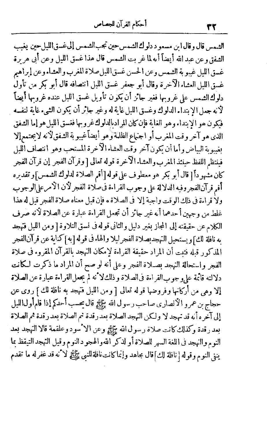 الشَّمْسُ قَالَ وَقَالَ ابْنُ مَسْعُودٍ دُلُوكُ الشَّمْسِ حِينَ تَجِبُ الشَّمْسُ إلَى غَسَقِ اللَّيْلِ حِينَ يَغِيبُ الشَّفَقُ وَعَنْ عَبْدِ اللَّهِ أَيْضًا أَنَّهُ لَمَّا غَرَبَتْ الشَّمْسُ قَالَ هَذَا غَسَقُ اللَّيْلِ وَعَنْ أَبِي هُرَيْرَةَ غَسَقُ اللَّيْلِ غَيْبُوبَةُ الشَّمْسِ وَعَنْ الْحَسَنِ غَسَقُ اللَّيْلِ صَلَاةُ الْمَغْرِبِ وَالْعِشَاءِ وَعَنْ إبْرَاهِيمَ غَسَقُ اللَّيْلِ الْعِشَاءُ الْآخِرَةُ وَقَالَ أَبُو جَعْفَرٍ غَسَقُ اللَّيْلِ انْتِصَافُهُ قَالَ أَبُو بَكْرٍ مَنْ تَأَوَّلَ دُلُوكَ الشَّمْسِ عَلَى غُرُوبِهَا فَغَيْرُ جَائِزٍ أَنْ يَكُونَ تَأْوِيلُ غَسَقِ اللَّيْلِ عِنْدَهُ غُرُوبَهَا أَيْضًا لِأَنَّهُ جَعَلَ الِابْتِدَاءَ الدُّلُوكَ وغسق الليل غاية له وغير جائر أَنْ يَكُونَ الشَّيْءُ غَايَةً لِنَفْسِهِ فَيَكُونُ هُوَ الِابْتِدَاءُ وَهُوَ الْغَايَةُ فَإِنْ كَانَ الْمُرَادُ بِالدُّلُوكِ غُرُوبَهَا فَغَسَقُ اللَّيْلِ هُوَ إمَّا الشَّفَقُ الَّذِي هُوَ آخِرُ وَقْتِ الْمَغْرِبِ أَوْ اجْتِمَاعُ الظُّلْمَةِ وَهُوَ أَيْضًا غَيْبُوبَةُ الشَّفَقِ لِأَنَّهُ لَا يَجْتَمِعُ إلَّا بِغَيْبُوبَةِ الْبَيَاضِ وَإِمَّا أَنْ يَكُونَ آخِرَ وَقْتِ الْعِشَاءِ الْآخِرَةِ الْمُسْتَحَبِّ وَهُوَ انْتِصَافُ اللَّيْلِ فَيَنْتَظِمُ اللَّفْظُ حِينَئِذٍ الْمَغْرِبَ وَالْعِشَاءَ الْآخِرَةَ قَوْله تَعَالَى وَقُرْآنَ الْفَجْرِ إِنَّ قُرْآنَ الْفَجْرِ كانَ مَشْهُوداً قَالَ أَبُو بَكْرٍ هُوَ مَعْطُوفٌ عَلَى قَوْلِهِ أَقِمِ الصَّلاةَ لِدُلُوكِ الشَّمْسِ وَتَقْدِيرُهُ أَقِمْ قُرْآنَ الْفَجْرِ وَفِيهِ الدَّلَالَةُ عَلَى وُجُوبِ الْقِرَاءَةِ فِي صَلَاةِ الْفَجْرِ لِأَنَّ الْأَمْرَ عَلَى الْوُجُوبِ وَلَا قِرَاءَةَ فِي ذَلِكَ الْوَقْتِ واجبة إلا في صلاة فَإِنْ قِيلَ مَعْنَاهُ صَلَاةُ الْفَجْرِ قِيلَ لَهُ هَذَا غَلَطٌ مِنْ وَجْهَيْنِ أَحَدُهُمَا أَنَّهُ غَيْرُ جَائِزٍ أَنْ تَجْعَلَ الْقِرَاءَةَ عِبَارَةً عَنْ الصَّلَاةِ لأنه صرف الكلام عَنْ حَقِيقَتِهِ إلَى الْمَجَازِ بِغَيْرِ دَلِيلٍ