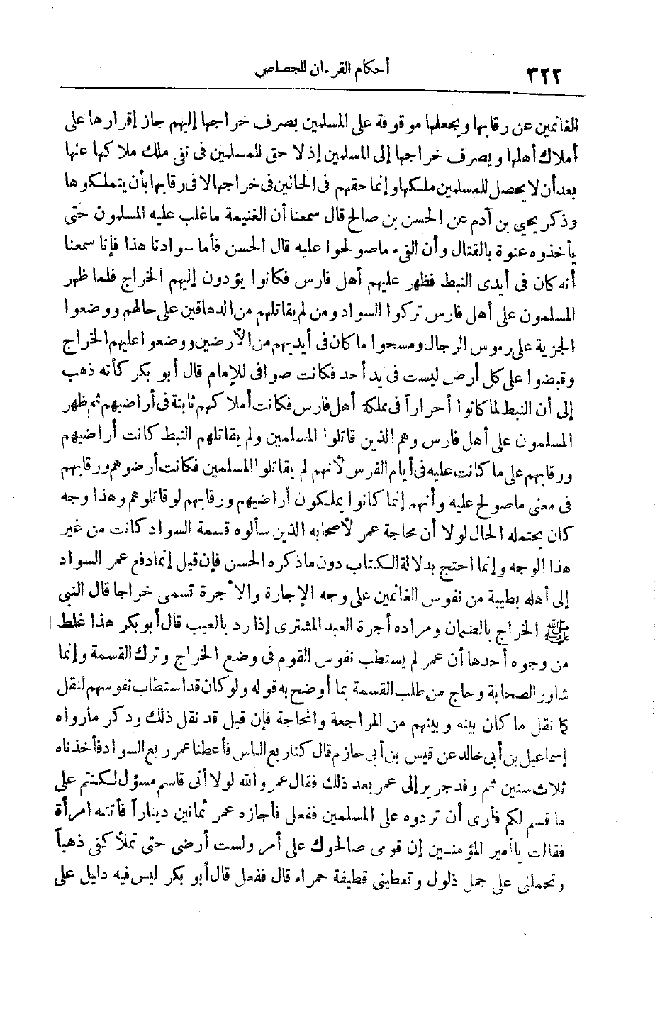 الْغَانِمِينَ عَنْ رِقَابِهَا وَيَجْعَلَهَا مَوْقُوفَةً عَلَى الْمُسْلِمِينَ بِصَرْفِ خَرَاجِهَا إلَيْهِمْ جَازَ إقْرَارُهَا عَلَى أَمْلَاكِ أَهْلهَا وَيُصْرَفُ خَرَاجُهَا إلَى الْمُسْلِمِينَ إذْ لَا حَقِّ لِلْمُسْلِمِينَ فِي نَفْيِ مِلْكِ مُلَّاكِهَا عَنْهَا بَعْدَ أَنْ لَا يَحْصُلَ لِلْمُسْلِمِينَ مِلْكُهَا وَإِنَّمَا حَقُّهُمْ فِي الْحَالَيْنِ فِي خَرَاجِهَا لَا فِي رِقَابِهَا بِأَنْ يَتَمَلَّكُوهَا وَذَكَرَ يَحْيَى بْنُ آدَمَ عَنْ الْحَسَنِ بْنِ صَالِحٍ قَالَ سَمِعْنَا أَنَّ الْغَنِيمَةَ مَا غَلَبَ عَلَيْهِ الْمُسْلِمُونَ حَتَّى يَأْخُذُوهُ عَنْوَةً بِالْقِتَالِ وَأَنَّ الْفَيْءَ مَا صُولِحُوا عَلَيْهِ قَالَ الْحَسَنُ فَأَمَّا سَوَادُنَا هَذَا فَإِنَّا سَمِعْنَا أَنَّهُ كَانَ فِي أَيْدِي النِّبْطِ فَظَهَرَ عَلَيْهِمْ أَهْلُ فَارِسٍ فَكَانُوا يُؤَدُّونَ إلَيْهِمْ الْخَرَاجَ فَلَمَّا ظَهَرَ الْمُسْلِمُونَ عَلَى أَهْلِ فَارِسٍ تَرَكُوا السَّوَادَ وَمَنْ لَمْ يُقَاتِلْهُمْ مِنْ الدَّهَاقِينِ عَلَى حَالِهِمْ ووضعوا الجزية على رموس الرِّجَالِ وَمَسَحُوا مَا كَانَ فِي أَيْدِيهمْ مِنْ الْأَرْضِينَ وَوَضَعُوا عَلَيْهِمْ الْخَرَاجَ وَقَبَضُوا عَلَى كُلِّ أَرْضٍ لَيْسَتْ فِي يَدِ أَحَدٍ فَكَانَتْ صَوَافِيَ لِلْإِمَامِ قَالَ أَبُو بَكْرٍ كَأَنَّهُ ذَهَبَ إلَى أَنَّ النِّبْطَ لَمَّا كَانُوا أَحْرَارًا فِي مَمْلَكَةِ أَهْلِ فَارِسٍ فَكَانَتْ أَمْلَاكُهُمْ ثَابِتَةً فِي أَرَاضِيِهِمْ ثُمَّ ظَهَرَ الْمُسْلِمُونَ عَلَى أَهْلِ فَارِسٍ وَهُمْ الَّذِينَ قَاتَلُوا الْمُسْلِمِينَ وَلَمْ يُقَاتِلْهُمْ النِّبْطُ كَانَتْ أَرَاضِيُهُمْ وَرِقَابُهُمْ عَلَى مَا كَانَتْ عَلَيْهِ فِي أَيَّامِ الْفُرْسِ لِأَنَّهُمْ لَمْ يُقَاتِلُوا الْمُسْلِمِينَ فَكَانَتْ أَرْضُوهُمْ وَرِقَابُهُمْ فِي مَعْنَى مَا صُولِحَ عَلَيْهِ وَأَنَّهُمْ إنَّمَا كَانُوا يَمْلِكُونَ أَرَاضِيَهُمْ وَرِقَابَهُمْ لَوْ قَاتَلُوهُمْ وَهَذَا وَجْهٌ كَانَ يَحْتَمِلُهُ الْحَالُ لَوْلَا أَنَّ مُحَاجَّةَ عُمَرَ لِأَصْحَابِهِ الَّذِينَ سَأَلُوهُ قِسْمَةَ السَّوَادِ كَانَتْ مِنْ غَيْرِ هَذَا الْوَجْهِ وَإِنَّمَا احْتَجَّ بِدَلَالَةِ الْكِتَابِ دُونَ مَا ذَكَرَهُ الْحَسَنُ فَإِنْ قِيلَ إنَّمَا دَفَعَ عُمَرُ السَّوَادَ إلَى أَهْلِهِ بِطِيبَةٍ مِنْ نُفُوسِ الْغَانِمِينَ عَلَى وَجْهِ الْإِجَارَةِ وَالْأُجْرَةُ تُسَمَّى خَرَاجًا