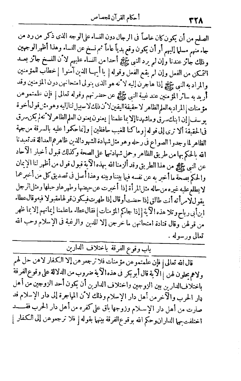 قَالَ اللَّهُ تَعَالَى فَإِنْ عَلِمْتُمُوهُنَّ مُؤْمِناتٍ فَلا تَرْجِعُوهُنَّ إِلَى الْكُفَّارِ لا هُنَّ حِلٌّ لَهُمْ وَلا هُمْ يَحِلُّونَ لَهُنَّ الْآيَةَ قَالَ أَبُو بَكْرٍ فِي هَذِهِ الْآيَةِ ضُرُوبٌ مِنْ الدَّلَالَةِ عَلَى وُقُوعِ الْفُرْقَةِ بِاخْتِلَافِ الدَّارَيْنِ بَيْنَ الزَّوْجَيْنِ وَاخْتِلَافُ الدَّارَيْنِ أَنْ يَكُونَ أَحَدُ الزَّوْجَيْنِ مِنْ أَهْلِ دَارِ الْحَرْبِ وَالْآخَرُ مِنْ أَهْلِ دَارِ الْإِسْلَامِ وَذَلِكَ لِأَنَّ الْمُهَاجِرَةَ إلَى دَارِ الْإِسْلَامِ قَدْ صَارَتْ مِنْ أَهْلِ دَارِ الْإِسْلَامِ وَزَوْجُهَا بَاقٍ عَلَى كُفْرِهِ مِنْ أَهْلِ دَارِ الْحَرْبِ فَقَدْ اخْتَلَفَتْ بِهِمَا الدَّارَانِ وَحَكَمَ اللَّهُ بِوُقُوعِ الْفُرْقَةِ بَيْنَهُمَا بِقَوْلِهِ فَلا تَرْجِعُوهُنَّ إِلَى الْكُفَّارِ