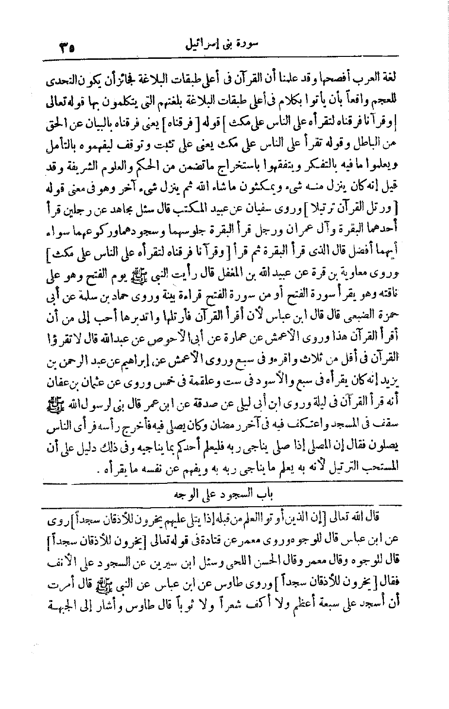 قَالَ اللَّهُ تَعَالَى إِنَّ الَّذِينَ أُوتُوا الْعِلْمَ مِنْ قَبْلِهِ إِذا يُتْلى عَلَيْهِمْ يَخِرُّونَ لِلْأَذْقانِ سُجَّداً رُوِيَ عَنْ ابْنِ عَبَّاسٍ قَالَ لِلْوُجُوهِ وَرَوَى مَعْمَرٌ عَنْ قَتَادَةَ فِي قَوْله تَعَالَى يَخِرُّونَ لِلْأَذْقانِ سُجَّداً قَالَ لِلْوُجُوهِ وَقَالَ مَعْمَرٌ وَقَالَ الْحَسَنُ اللِّحَى وَسُئِلَ ابْنُ سِيرِينَ عَنْ السُّجُودِ عَلَى الْأَنْفِ فقال يَخِرُّونَ لِلْأَذْقانِ سُجَّداً