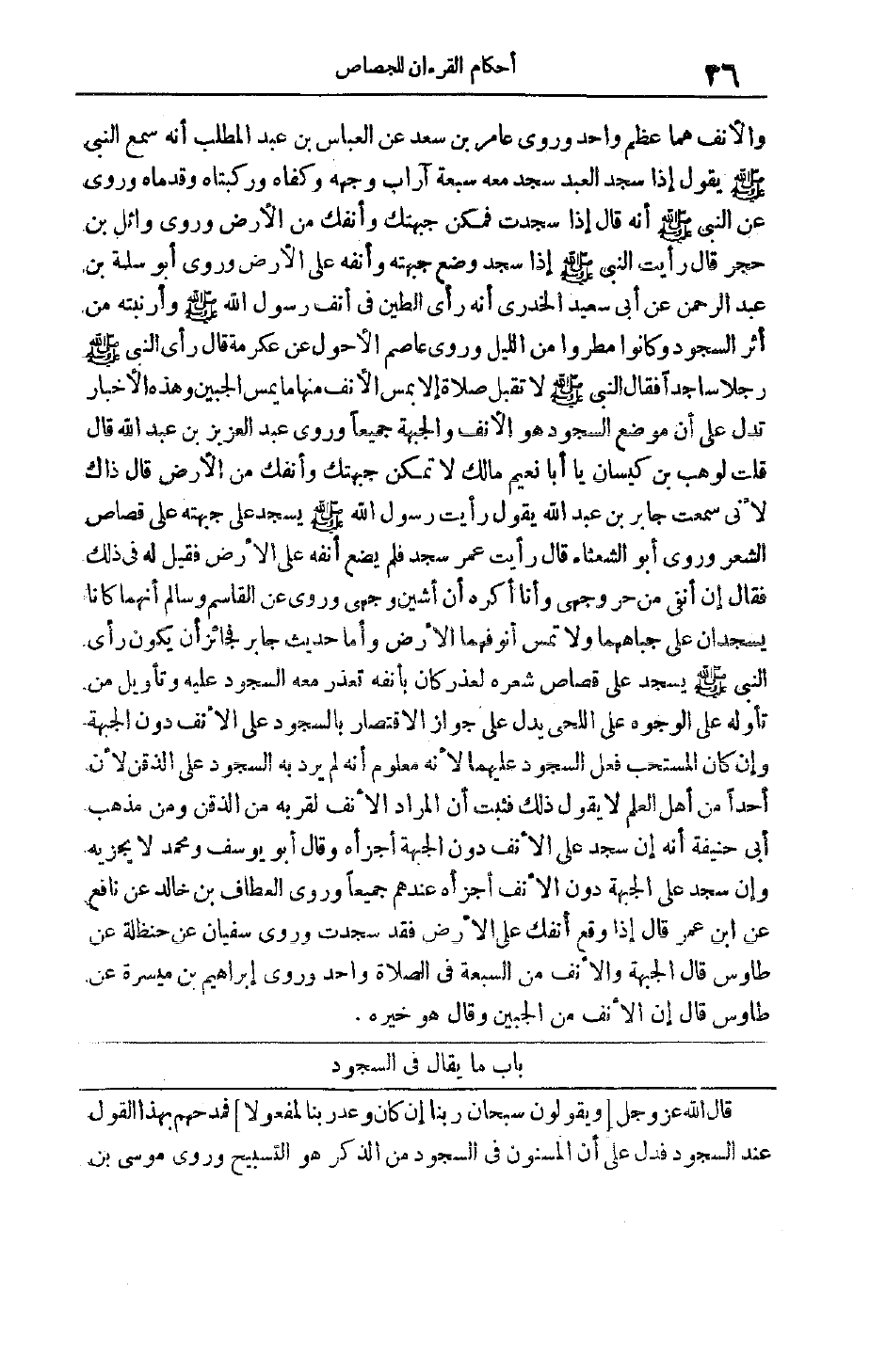 وروى أبو الشعثاء قال رأيت عُمَرَ سَجَدَ فَلَمْ يَضَعْ أَنْفَهُ عَلَى الْأَرْضِ فَقِيلَ لَهُ فِي ذَلِكَ فَقَالَ إنَّ أَنْفِي مِنْ حُرِّ وَجْهِي وَأَنَا أَكْرَهُ أَنْ أَشِينُ وَجْهِي وَرُوِيَ عَنْ الْقَاسِمِ وَسَالِمٍ أَنَّهُمَا كَانَا يَسْجُدَانِ عَلَى جِبَاهِهِمَا وَلَا تَمَسُّ أُنُوفُهُمَا الْأَرْضَ وَأَمَّا حَدِيثُ جَابِرٍ فَجَائِزٌ أَنْ يَكُونَ رَأَى النَّبِيَّ صَلَّى اللَّهُ عَلَيْهِ وَسَلَّمَ يَسْجُدُ عَلَى قِصَاصِ شَعَرِهِ لِعُذْرٍ كَانَ بِأَنْفِهِ تَعَذَّرَ مَعَهُ السُّجُودُ عَلَيْهِ وَتَأْوِيلُ مَنْ تَأَوَّلَهُ عَلَى الْوُجُوهِ عَلَى اللِّحَى يَدُلُّ عَلَى جَوَازِ الِاقْتِصَارِ بِالسُّجُودِ على الأنف دون الجهبة وَإِنْ كَانَ الْمُسْتَحَبُّ فِعْلُ السُّجُودِ عَلَيْهِمَا لِأَنَّهُ مَعْلُومٌ أَنَّهُ لَمْ يُرِدْ بِهِ السُّجُودَ عَلَى الذَّقَنِ لِأَنَّ أَحَدًا مِنْ أَهْلِ الْعِلْمِ لَا يَقُولُ ذَلِكَ فَثَبَتَ أَنَّ الْمُرَادَ الْأَنْفُ لِقُرْبِهِ مِنْ الذَّقَنِ وَمَنْ مَذْهَبِ أَبِي حَنِيفَةَ أَنَّهُ إنْ سَجَدَ عَلَى الْأَنْفِ دُونَ الْجَبْهَةِ أَجْزَأَهُ وقال أبو يوسف ومحمد لا يجزيه وَإِنْ سَجَدَ عَلَى الْجَبْهَةِ دُونَ الْأَنْفِ أَجْزَأَهُ عِنْدَهُمْ جَمِيعًا وَرَوَى الْعَطَّافُ بْنُ خَالِدٍ عَنْ نَافِعٍ عَنْ ابْنِ عُمَرَ قَالَ إذَا وَقَعَ أَنْفُك عَلَى الْأَرْضِ فَقَدْ سَجَدْت وَرَوَى سُفْيَانُ عَنْ حَنْظَلَةَ عَنْ طَاوُسٌ قَالَ الْجَبْهَةُ وَالْأَنْفُ مِنْ السَّبْعَةِ فِي الصَّلَاةِ وَاحِدٌ وَرَوَى إبْرَاهِيمُ بْنُ مَيْسَرَةَ عَنْ طَاوُسٌ قَالَ إنَّ الْأَنْفَ مِنْ الْجَبِينِ وَقَالَ هُوَ خَيْرُهُ.
