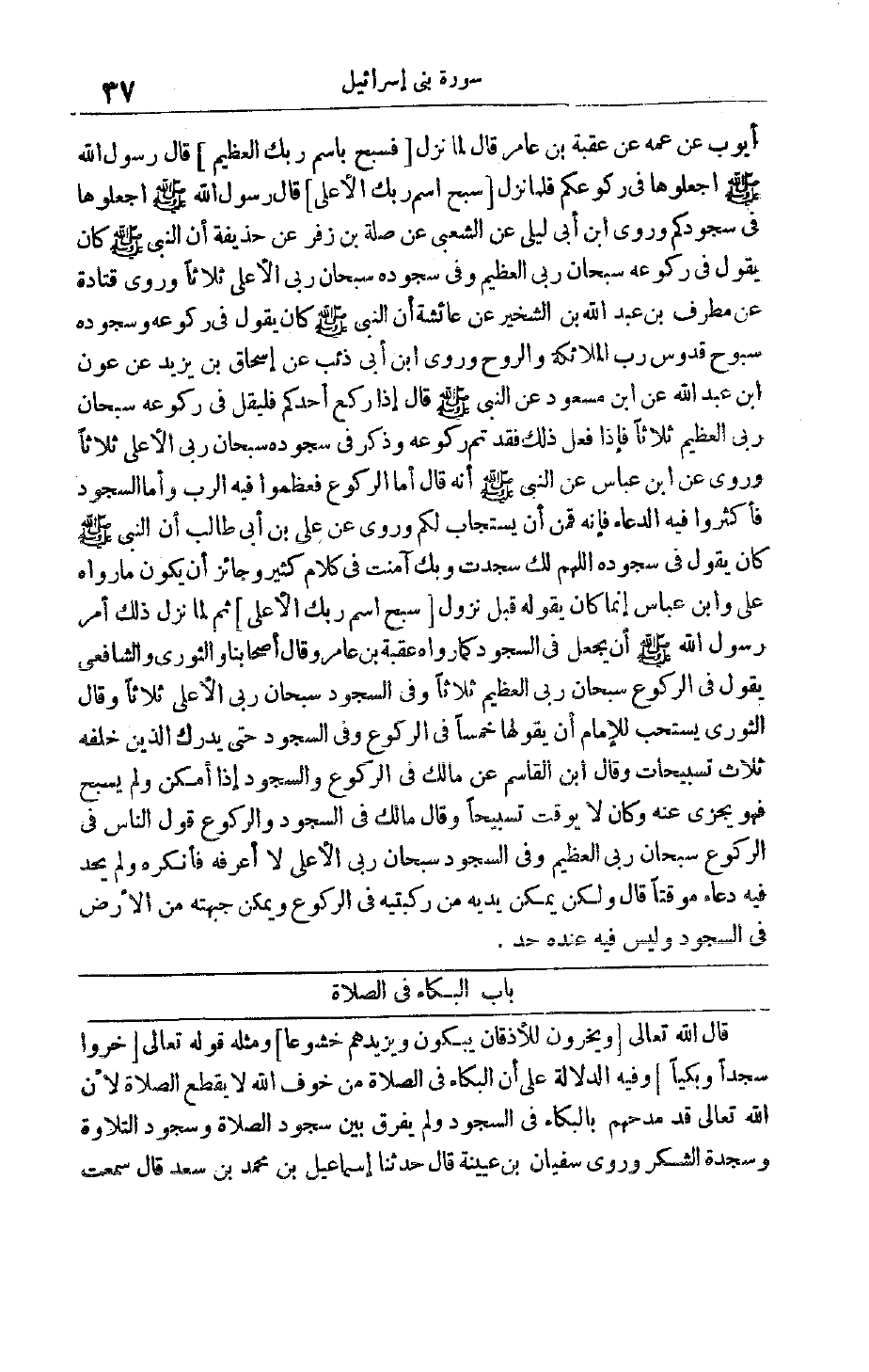 قَالَ اللَّهُ تَعَالَى وَيَخِرُّونَ لِلْأَذْقانِ يَبْكُونَ وَيَزِيدُهُمْ خُشُوعاً ومثله قوله تعالى خَرُّوا سُجَّداً وَبُكِيًّا وَفِيهِ الدَّلَالَةُ عَلَى أَنَّ الْبُكَاءَ فِي الصَّلَاةِ مِنْ خَوْفِ اللَّهِ لَا يَقْطَعُ الصَّلَاةَ لِأَنَّ اللَّهَ تَعَالَى قَدْ مَدَحَهُمْ بِالْبُكَاءِ فِي السُّجُودِ وَلَمْ يُفَرِّقْ بَيْنَ سُجُودِ الصَّلَاةِ وَسُجُودِ التِّلَاوَةِ وَسَجْدَةِ الشُّكْرِ وَرَوَى سُفْيَانُ بْنُ عُيَيْنَةَ قَالَ حَدَّثَنَا إسْمَاعِيلُ بْنُ مُحَمَّدِ بْنِ سَعْدٍ قَالَ سمعت