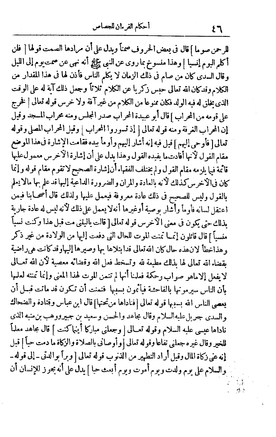 وَقَالَ السُّدِّيُّ كَانَ مَنْ صَامَ فِي ذَلِكَ الزَّمَانِ لَا يُكَلِّمُ النَّاسَ فَأَذِنَ لَهَا فِي هَذَا الْمِقْدَارَ مِنْ الْكَلَامِ وَقَدْ كَانَ اللَّهُ تَعَالَى حَبَسَ زَكَرِيَّا عَنْ الْكَلَامِ ثَلَاثًا وَجَعَلَ ذَلِكَ آيَةً لَهُ عَلَى الْوَقْتِ الَّذِي يُخْلَقُ لَهُ فِيهِ الْوَلَدُ فَكَانَ مَمْنُوعًا مِنْ الْكَلَامِ مِنْ غَيْرِ آفَةٍ وَلَا خَرَسٍ قَوْله تَعَالَى فَخَرَجَ عَلى قَوْمِهِ مِنَ الْمِحْرابِ قَالَ أَبُو عُبَيْدَةَ الْمِحْرَابُ صَدْرُ الْمَجْلِسِ وَمِنْهُ مِحْرَابُ الْمَسْجِدِ وَقِيلَ إنَّ الْمِحْرَابَ الْغُرْفَةُ وَمِنْهُ قوله تعالى إِذْ تَسَوَّرُوا الْمِحْرابَ وَقِيلَ الْمِحْرَابُ الْمُصَلَّى وقَوْله تَعَالَى فَأَوْحى إِلَيْهِمْ قِيلَ فِيهِ إنَّهُ أَشَارَ إلَيْهِمْ وَأَوْمَأَ بِيَدِهِ فَقَامَتْ الْإِشَارَةُ فِي هَذَا الْمَوْضِعِ مَقَامَ الْقَوْلِ لِأَنَّهَا أَفَادَتْ مَا يُفِيدُهُ الْقَوْلُ وَهَذَا يَدُلُّ على أن إشارة الأخرس معمول عَلَيْهَا قَائِمَةٌ فِيمَا يَلْزَمُهُ مَقَامَ الْقَوْلِ وَلَمْ يَخْتَلِفْ الْفُقَهَاءُ أَنَّ إشَارَةَ الصَّحِيحِ لَا تَقُومُ مَقَامَ قَوْلِهِ وَإِنَّمَا كَانَ فِي الْأَخْرَسِ كَذَلِكَ لِأَنَّهُ بِالْعَادَةِ وَالْمِرَانِ وَالضَّرُورَةِ الدَّاعِيَةِ إلَيْهَا قَدْ علم بها ما لا يُعْلَمُ بِالْقَوْلِ وَلَيْسَ لِلصَّحِيحِ فِي ذَلِكَ عَادَةٌ مَعْرُوفَةٌ فَيُعْمَلُ عَلَيْهَا وَلِذَلِكَ قَالَ أَصْحَابُنَا فِيمَنْ اُعْتُقِلَ لِسَانُهُ فَأَوْمَأَ وَأَشَارَ بِوَصِيَّةٍ أَوْ غَيْرِهَا أَنَّهُ لَا يُعْمَلُ عَلَى ذَلِكَ لِأَنَّهُ لَيْسَ لَهُ عَادَةٌ جَارِيَةٌ بِذَلِكَ حَتَّى يَكُونُ فِي مَعْنَى الْأَخْرَسِ قَوْله تَعَالَى قالَتْ يَا لَيْتَنِي مِتُّ قَبْلَ هذا وَكُنْتُ نَسْياً مَنْسِيًّا قَالَ قَائِلُونَ إنَّمَا تَمَنَّتْ الْمَوْتَ لِلْحَالِ الَّتِي دُفِعَتْ إلَيْهَا مِنْ الْوِلَادَةِ مِنْ غَيْرِ ذَكَرٍ وَهَذَا خَطَأٌ لِأَنَّ هَذِهِ حَالٌ كَانَ اللَّهُ تَعَالَى قَدْ ابْتَلَاهَا بِهَا وَصَيَّرَهَا إلَيْهَا وَقَدْ كَانَتْ هِيَ رَاضِيَةٌ بِقَضَاءِ اللَّهِ تَعَالَى لَهَا بِذَلِكَ مُطِيعَةً لِلَّهِ وَتَسَخُّطُ فِعْلِ اللَّهِ وَقَضَائِهِ مَعْصِيَةٌ لِأَنَّ اللَّهَ تَعَالَى لَا يَفْعَلُ إلَّا مَا هُوَ صَوَابٌ وَحِكْمَةٌ فَعَلِمْنَا أَنَّهَا لَمْ تَتَمَنَّ الْمَوْتَ لِهَذَا الْمَعْنَى وَإِنَّمَا تَمَنَّتْهُ لِعِلْمِهَا بِأَنَّ النَّاسَ سَيَرْمُونَهَا بِالْفَاحِشَةِ فَيَأْثَمُونَ بِسَبَبِهَا فَتَمَنَّتْ أَنْ تَكُونَ قَدْ مَاتَتْ قَبْلَ أَنْ يَعْصِيَ النَّاسُ اللَّهَ بِسَبَبِهَا قَوْله تَعَالَى فَناداها مِنْ تَحْتِها قَالَ ابْنُ عَبَّاسٍ وَقَتَادَةُ وَالضَّحَّاكُ وَالسُّدِّيُّ جِبْرِيلُ عَلَيْهِ السَّلَامُ وَقَالَ مُجَاهِدٌ وَالْحَسَنُ وَسَعِيدُ بْنُ جُبَيْرٍ وَوَهْبُ بْنُ مُنَبِّهٍ الَّذِي نَادَاهَا عِيسَى عَلَيْهِ السَّلَامُ وقَوْله تَعَالَى وَجَعَلَنِي مُبارَكاً أَيْنَ ما كُنْتُ قَالَ مُجَاهِدٌ مُعَلِّمًا لِلْخَيْرِ وَقَالَ غَيْرُهُ جَعَلَنِي نَفَّاعًا