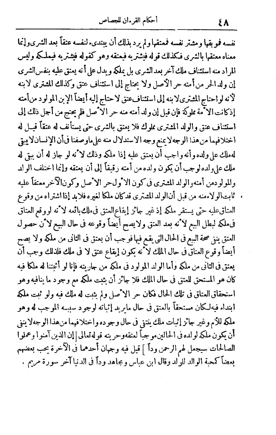 وَإِنَّمَا مَعْنَاهُ مُعْتِقُهَا بِالشِّرَى فَكَذَلِكَ قَوْلُهُ فَيَشْتَرِيَهُ فَيُعْتِقَهُ وَهُوَ كَقَوْلِهِ فَيَشْتَرِيَهُ فَيَمْلِكَهُ وَلَيْسَ الْمُرَادُ مِنْهُ اسْتِئْنَافَ مِلْكٍ آخَرَ بَعْدَ الشِّرَى بَلْ يملكه وَيَدُلُّ عَلَى أَنَّهُ يُعْتَقُ عَلَيْهِ بِنَفْسِ الشِّرَى أَنَّ وَلَدَ الْحُرِّ مِنْ أَمَتِهِ حُرُّ الْأَصْلِ وَلَا يَحْتَاجُ إلَى اسْتِئْنَافِ عِتْقٍ وَكَذَلِكَ الْمُشْتَرِي لِابْنِهِ لِأَنَّهُ لَوْ احْتَاجَ الْمُشْتَرِي لِابْنِهِ إلَى اسْتِئْنَافِ عِتْقٍ لَاحْتَاجَ إلَيْهِ أَيْضًا الِابْنُ الْمَوْلُودُ مِنْ أَمَتِهِ إذْ كَانَتْ الْأَمَةُ مَمْلُوكَةً فَإِنْ قِيلَ إنَّ وَلَدَ أَمَتِهِ مِنْهُ حُرُّ الْأَصْلِ فَلَمْ يَحْتَجْ مِنْ أَجْلِ ذَلِكَ إلَى اسْتِئْنَافِ عِتْقٍ وَالْوَلَدُ الْمُشْتَرَى مَمْلُوكٌ فَلَا يَعْتِقُ بِالشِّرَى حَتَّى يَسْتَأْنِفَ لَهُ عِتْقًا قِيلَ لَهُ اخْتِلَافُهُمَا مِنْ هَذَا الْوَجْهِ لَا يَمْنَعُ وَجْهَ الِاسْتِدْلَالِ مِنْهُ عَلَى مَا وَصَفْنَا فِي أَنَّ الْإِنْسَانَ لَا يَبْقَى لَهُ مِلْكٌ عَلَى وَلَدِهِ وَأَنَّهُ وَاجِبٌ أَنْ يَعْتِقَ عَلَيْهِ إذَا مَلَكَهُ وَذَلِكَ لِأَنَّهُ لَوْ جَازَ لَهُ أَنْ يَبْقَى لَهُ مِلْكٌ عَلَى وَلَدِهِ لَوَجَبَ أَنْ يَكُونَ وَلَدُهُ مِنْ أَمَتِهِ رَقِيقًا إلَى أَنْ يُعْتِقَهُ وَإِنَّمَا اختلف الولد والمولود مِنْ أَمَتِهِ وَالْوَلَدُ الْمُشْتَرَى فِي كَوْنِ الْأَوَّلِ حُرَّ الْأَصْلِ وَكَوْنِ الْآخَرِ مُعْتَقًا عَلَيْهِ ثَابِتَ الْوَلَاءِ مِنْهُ مِنْ قِبَلِ أَنَّ الْوَلَدَ الْمُشْتَرَى قَدْ كَانَ مِلْكًا لِغَيْرِهِ فَلَا بُدَّ إذَا اشْتَرَاهُ مِنْ وُقُوعِ الْعَتَاقِ عَلَيْهِ حَتَّى يَسْتَقِرَّ مِلْكُهُ إذْ غَيْرُ جَائِزٍ إيقَاعُ الْعِتْقِ فِي مِلْكِ بَائِعِهِ لِأَنَّهُ لَوْ وَقَعَ الْعَتَاقُ فِي مِلْكِهِ لَبَطَلَ الْبَيْعُ لِأَنَّهُ بَعْدَ الْعِتْقِ وَلَا يَصِحُّ أَيْضًا وُقُوعُهُ فِي حَالِ الْبَيْعِ لِأَنَّ حُصُولَ الْعِتْقِ يَنْفِي صِحَّةَ الْبَيْعِ فِي الْحَالِ الَّتِي يَقَعُ فِيهَا فَوَجَبَ أَنْ يَعْتِقَ فِي الثَّانِي مِنْ مِلْكِهِ وَلَا يَصِحُّ أَيْضًا وُقُوعُ الْعَتَاقِ فِي حَالِ الْمِلْكِ لِأَنَّهُ يَكُونُ إيقَاعُ عِتْقٍ لَا فِي مِلْكٍ فَلِذَلِكَ وَجَبَ أَنْ يَعْتِقَ فِي الثَّانِي مِنْ مِلْكِهِ وَأَمَّا الْوَلَدُ الْمَوْلُودُ فِي مِلْكِهِ مِنْ جَارِيَتِهِ فَإِنَّا لَوْ أَثْبَتْنَا لَهُ مِلْكًا فِيهِ كَانَ هُوَ الْمُسْتَحِقُّ لِلْعِتْقِ فِي حَالِ الْمِلْكِ فَلَا جَائِزَ أَنْ يَثْبُتَ مِلْكُهُ مَعَ وُجُودِ مَا يُنَافِيهِ وَهُوَ اسْتِحْقَاقُ الْعَتَاقِ فِي تِلْكَ الْحَالِ فَكَانَ حُرَّ الْأَصْلِ وَلَمْ يَثْبُتْ لَهُ مِلْكٌ فِيهِ وَلَوْ ثَبَتَ مِلْكُهُ ابْتِدَاءً فِيهِ لَكَانَ مُسْتَحَقَّا بِالْعِتْقِ فِي حَالِ مَا يُرِيدُ إثْبَاتَهُ لِوُجُودِ سَبَبِهِ الْمُوجِبِ لَهُ وَهُوَ مِلْكُهُ لِلْأُمِّ وَغَيْرُ جَائِزٍ إثْبَاتُ مِلْكِ يَنْتَفِي فِي حَالِ وُجُودِهِ وَاخْتِلَافُهُمَا مِنْ هَذَا الْوَجْهِ لَا يَنْفِي أَنْ يَكُونَ مِلْكُهُ لِوَلَدِهِ فِي الْحَالَيْنِ مُوجِبًا لِعِتْقِهِ وَحُرِّيَّتِهِ