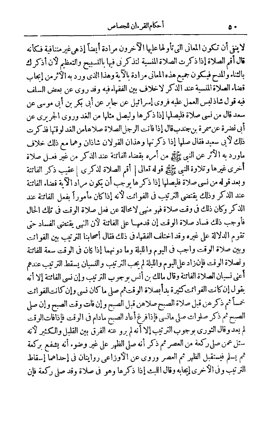 يُوجِبُ أَنْ يَكُونَ مُرَادُ الْآيَةِ قَضَاءَ الْفَائِتَةِ عِنْدَ الذِّكْرِ وَذَلِكَ يَقْتَضِي التَّرْتِيبَ فِي الْفَوَائِتِ لِأَنَّهُ إذَا كَانَ مَأْمُورًا بِفِعْلِ الْفَائِتَةِ عِنْدَ الذِّكْرِ وَكَانَ ذَلِكَ فِي وَقْتِ صَلَاةٍ فَهُوَ مَنْهِيٌّ لَا مَحَالَةَ عَنْ فِعْلِ صَلَاةِ الْوَقْتِ فِي تِلْكَ الْحَالِ فَأَوْجَبَ ذَلِكَ فَسَادَ صَلَاةِ الْوَقْتِ إنْ قَدَّمَهَا عَلَى الْفَائِتَةِ لِأَنَّ النَّهْيَ يَقْتَضِي الْفَسَادَ حَتَّى تَقُومَ الدَّلَالَةُ عَلَى غَيْرِهِ وَقَدْ اخْتَلَفَ الْفُقَهَاءُ فِي ذَلِكَ فَقَالَ أَصْحَابُنَا التَّرْتِيبُ بَيْنَ الْفَوَائِتِ وَبَيْنَ صَلَاةِ الْوَقْتِ وَاجِبٌ فِي الْيَوْمِ وَاللَّيْلَةِ وَمَا دُونَهُمَا إذَا كَانَ فِي الْوَقْتِ سَعَةٌ لِلْفَائِتَةِ وَلِصَلَاةِ الْوَقْتِ فَإِنْ زَادَ عَلَى الْيَوْمِ وَاللَّيْلَةِ لَمْ يَجِبْ التَّرْتِيبُ وَالنِّسْيَانُ يُسْقِطُ التَّرْتِيبَ عِنْدَهُمْ أَعْنِي نِسْيَانَ الصَّلَاةِ الْفَائِتَةِ وَقَالَ مَالِكُ بْنُ أَنَسٍ بِوُجُوبِ التَّرْتِيبِ وَإِنْ نَسِيَ الْفَائِتَةَ إلَّا أَنَّهُ يَقُولُ إنْ كَانَتْ الْفَوَائِتُ كَثِيرَةً بَدَأَ بِصَلَاةِ الْوَقْتِ ثُمَّ صَلَّى مَا كَانَ نَسِيَ وَإِنْ كَانَتْ الْفَوَائِتُ خَمْسًا ثُمَّ ذَكَرَهُنَّ قَبْلَ صَلَاةِ الصُّبْحِ صَلَّاهُنَّ قَبْلَ الصُّبْحِ وَإِنْ فَاتَ وَقْتُ الصُّبْحِ وَإِنْ صَلَّى الصُّبْحَ ثُمَّ ذَكَرَ صَلَوَاتٍ صَلَّى مَا نَسِيَ فَإِذَا فَرَغَ أعاد الصبح مادام فِي الْوَقْتِ فَإِذَا فَاتَ الْوَقْتُ لَمْ يُعِدْ وَقَالَ الثَّوْرِيُّ بِوُجُوبِ التَّرْتِيبِ إلَّا أَنَّهُ لَمْ يُرْوَ عَنْهُ الْفَرْقُ بَيْنَ الْقَلِيلِ وَالْكَثِيرِ لِأَنَّهُ سُئِلَ عَمَّنْ صَلَّى رَكْعَةً مِنْ الْعَصْرِ ثُمَّ ذَكَرَ أَنَّهُ صَلَّى الظُّهْرَ عَلَى غَيْرِ وُضُوءٍ أَنَّهُ يَشْفَعُ بِرَكْعَةٍ ثُمَّ يُسَلِّمُ فَيَسْتَقْبِلُ الظُّهْرَ ثُمَّ الْعَصْرَ وَرُوِيَ عَنْ الْأَوْزَاعِيِّ رِوَايَتَانِ فِي إحْدَاهُمَا إسْقَاطُ التَّرْتِيبِ وَفِي الْأُخْرَى إيجَابُهُ وَقَالَ اللَّيْثُ إذَا ذَكَرَهَا وَهُوَ فِي صَلَاةٍ وَقَدْ صَلَّى رَكْعَةً فَإِنْ