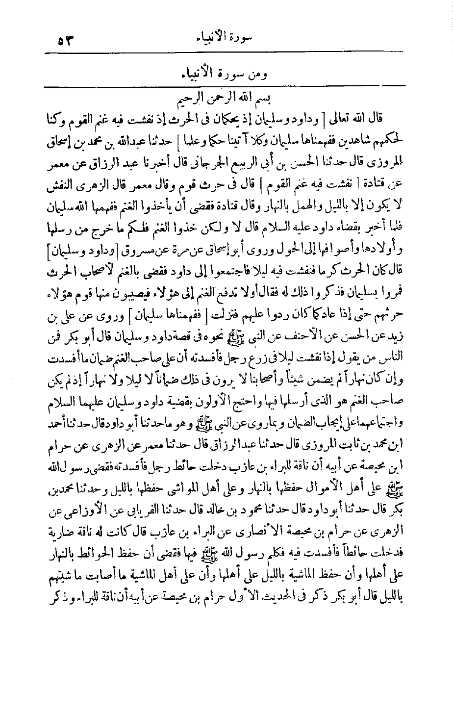 قَالَ اللَّهُ تَعَالَى وَداوُدَ وَسُلَيْمانَ إِذْ يَحْكُمانِ فِي الْحَرْثِ إِذْ نَفَشَتْ فِيهِ غَنَمُ الْقَوْمِ وَكُنَّا لِحُكْمِهِمْ شاهِدِينَ فَفَهَّمْناها سُلَيْمانَ وَكُلًّا آتَيْنا حُكْماً وَعِلْماً حدثنا عبد الله بن محمد بن إسحاق الْمَرْوَزِيِّ قَالَ حَدَّثَنَا الْحَسَنُ بْنُ أَبِي الرَّبِيعِ الجرجاني قَالَ أَخْبَرَنَا عَبْدُ الرَّزَّاقِ عَنْ مَعْمَرٍ عن قتادة نَفَشَتْ فِيهِ غَنَمُ الْقَوْمِ قَالَ فِي حَرْثِ قَوْمٍ وَقَالَ مَعْمَرٌ قَالَ الزُّهْرِيُّ النَّفْشُ لَا يَكُونُ إلَّا بِاللَّيْلِ وَالْهَمْلُ بِالنَّهَارِ وَقَالَ قَتَادَةُ فَقَضَى أَنْ يَأْخُذُوا الْغَنَمَ فَفَهَّمَهَا اللَّهُ سُلَيْمَانَ فَلَمَّا أُخْبِرَ بِقَضَاءِ دَاوُد عَلَيْهِ السَّلَامُ قَالَ لَا وَلَكِنْ خُذُوا الْغَنَمَ فَلَكُمْ مَا خَرَجَ مِنْ رَسْلِهَا وَأَوْلَادِهَا وَأَصْوَافِهَا إلَى الْحَوْلِ وَرَوَى أَبُو إِسْحَاقَ عَنْ مُرَّةَ عن مسروق وَداوُدَ وَسُلَيْمانَ قَالَ كَانَ الْحَرْثُ كَرْمًا فَنَفَشَتْ فِيهِ لَيْلًا فَاجْتَمَعُوا إلَى دَاوُد فَقَضَى بِالْغَنَمِ لِأَصْحَابِ الْحَرْثِ فَمَرُّوا بِسُلَيْمَانَ فَذَكَرُوا ذَلِكَ لَهُ فَقَالَ أَوَّلًا تدفع الغنم إلى هؤلاء فيصيبون منها قوم هؤلاء حَرْثِهِمْ حَتَّى إذَا عَادَ كَمَا كَانَ رَدُّوا عليهم فنزلت فَفَهَّمْناها سُلَيْمانَ وَرُوِيَ عَنْ عَلِيِّ بْنِ زَيْدٍ عَنْ الْحَسَنِ عَنْ الْأَحْنَفِ عَنْ النَّبِيِّ صَلَّى اللَّهُ عَلَيْهِ وَسَلَّمَ نَحْوَهُ فِي قِصَّةِ دَاوُد وَسُلَيْمَانَ قَالَ أَبُو بَكْرٍ فَمِنْ النَّاسِ مَنْ يَقُولُ إذَا نَفَشَتْ لَيْلًا فِي زَرْعِ رِجْلٍ فَأَفْسَدَتْهُ أَنَّ عَلَى صَاحِبِ الْغَنَمِ ضَمَانَ مَا أَفْسَدَتْ وَإِنْ كَانَ نَهَارًا لَمْ يَضْمَنْ شَيْئًا وَأَصْحَابُنَا لَا يَرَوْنَ فِي ذَلِكَ ضَمَانًا لَا لَيْلًا وَلَا نهارا إذ لَمْ يَكُنْ صَاحِبُ الْغَنَمِ هُوَ الَّذِي أَرْسَلَهَا فِيهَا وَاحْتَجَّ الْأَوَّلُونَ بِقَضِيَّةِ دَاوُد وَسُلَيْمَانَ عَلَيْهِمَا السَّلَامُ وَاجْتِمَاعِهِمَا عَلَى إيجَابِ الضَّمَانِ وَبِمَا