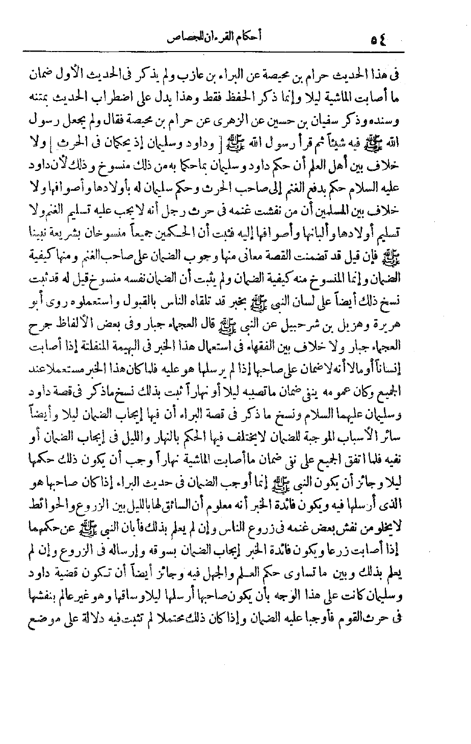 وَلَا خِلَافَ بَيْنَ الْفُقَهَاءِ فِي اسْتِعْمَالِ هَذَا الْخَبَرِ فِي الْبَهِيمَةِ الْمُنْفَلِتَةِ إذَا أَصَابَتْ إنْسَانًا أَوْ مَالًا أَنَّهُ لَا ضَمَانَ عَلَى صَاحِبِهَا إذَا لَمْ يُرْسِلْهَا هُوَ عَلَيْهِ فَلَمَّا كَانَ هَذَا الْخَبَرُ مُسْتَعْمَلًا عِنْدَ الْجَمِيعِ وَكَانَ عُمُومُهُ يَنْفِي ضَمَانَ مَا تُصِيبُهُ لَيْلًا أَوْ نَهَارًا ثَبَتَ بِذَلِكَ نَسْخُ مَا ذُكِرَ فِي قِصَّةِ دَاوُد وَسُلَيْمَانَ عَلَيْهِمَا السَّلَامُ وَنُسِخَ مَا ذُكِرَ فِي قِصَّةِ الْبَرَاءِ أَنَّ فِيهَا إيجَابَ الضَّمَانِ لَيْلًا وَأَيْضًا سَائِرُ الْأَسْبَابِ الْمُوجِبَةِ لِلضَّمَانِ لَا يَخْتَلِفُ فِيهَا الْحُكْمُ بِالنَّهَارِ وَاللَّيْلِ فِي إيجَابِ الضَّمَانِ أَوْ نَفْيِهِ فَلَمَّا اتَّفَقَ الْجَمِيعُ عَلَى نَفْيِ ضَمَانِ مَا أَصَابَتْ الْمَاشِيَةُ نَهَارًا وَجَبَ أَنْ يَكُونَ ذَلِكَ حُكْمَهَا لَيْلًا وَجَائِزٌ أَنْ يَكُونَ النَّبِيُّ صَلَّى اللَّهُ عَلَيْهِ وَسَلَّمَ إنَّمَا أَوْجَبَ الضَّمَانَ فِي حَدِيثِ الْبَرَاءِ إذَا كَانَ صَاحِبُهَا هُوَ الَّذِي أَرْسَلَهَا فِيهِ وَيَكُونُ فَائِدَةُ الْخَبَرِ أَنَّهُ مَعْلُومٌ أَنَّ السَّائِقَ لَهَا بِاللَّيْلِ بَيْنَ الزُّرُوعِ وَالْحَوَائِطِ لَا يَخْلُو مِنْ نَفْشِ بَعْضِ غَنَمِهِ فِي زُرُوعِ النَّاسِ وَإِنْ لَمْ يَعْلَمْ بِذَلِكَ فَأَبَانَ النَّبِيُّ صَلَّى اللَّهُ عَلَيْهِ وَسَلَّمَ عَنْ حكمهما إذَا أَصَابَتْ زَرْعًا وَيَكُونُ فَائِدَةُ الْخَبَرِ إيجَابَ الضَّمَانِ بِسَوْقِهِ وَإِرْسَالِهِ فِي الزُّرُوعِ وَإِنْ لَمْ يعلم بذلك وبين ما تَسَاوِي حُكْمِ الْعِلْمِ وَالْجَهْلِ فِيهِ وَجَائِزٌ أَيْضًا أَنْ تَكُونَ قَضِيَّةُ دَاوُد وَسُلَيْمَانَ كَانَتْ عَلَى هَذَا الْوَجْهِ بِأَنْ يَكُونَ صَاحِبُهَا أَرْسَلَهَا لَيْلًا وَسَاقَهَا وَهُوَ غَيْرُ عَالِمٍ بِنَفْشِهَا فِي حَرْثِ الْقَوْمِ فَأَوْجَبَا عَلَيْهِ الضَّمَانَ وَإِذَا كَانَ ذَلِكَ مُحْتَمَلًا لَمْ تَثْبُتْ فِيهِ دَلَالَةٌ عَلَى مَوْضِعِ