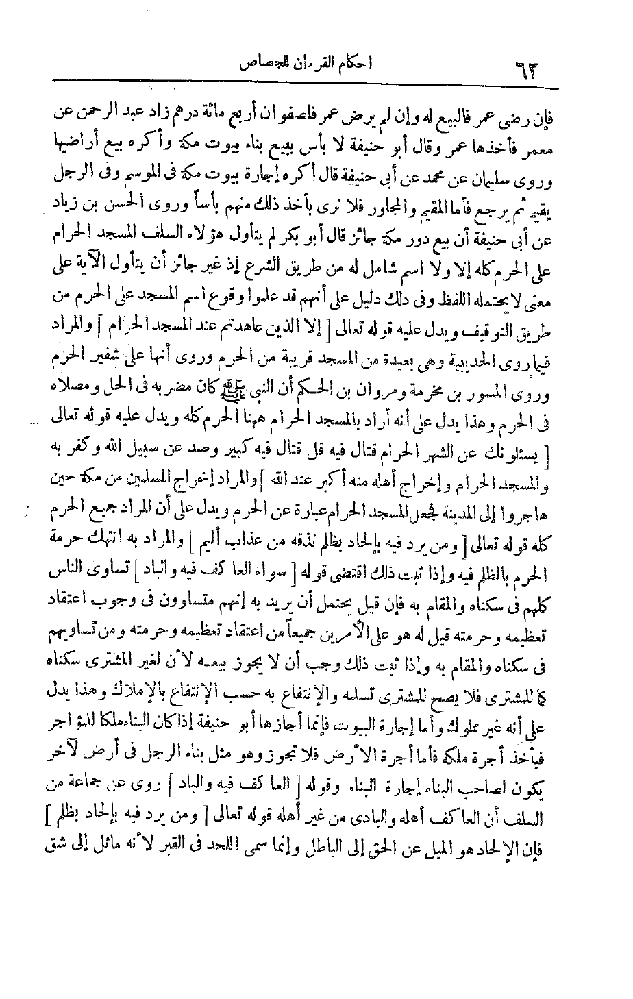 وَهَذَا يَدُلُّ عَلَى أَنَّهُ أَرَادَ بِالْمَسْجِدِ الحرام هاهنا الحرم كله ويدل عليه قوله تعالى يَسْئَلُونَكَ عَنِ الشَّهْرِ الْحَرامِ قِتالٍ فِيهِ قُلْ قِتالٌ فِيهِ كَبِيرٌ وَصَدٌّ عَنْ سَبِيلِ اللَّهِ وَكُفْرٌ بِهِ وَالْمَسْجِدِ الْحَرامِ وَإِخْراجُ أَهْلِهِ مِنْهُ أَكْبَرُ عِنْدَ اللَّهِ وَالْمُرَادُ إخْرَاجُ الْمُسْلِمِينَ مِنْ مَكَّةَ حِينَ هَاجَرُوا إلَى الْمَدِينَةِ فَجَعَلَ الْمَسْجِدَ الْحَرَامَ عِبَارَةً عَنْ الْحَرَمِ وَيَدُلُّ عَلَى أَنَّ الْمُرَادَ جَمِيعُ الْحَرَمِ كُلِّهِ قَوْله تَعَالَى وَمَنْ يُرِدْ فِيهِ بِإِلْحادٍ بِظُلْمٍ نُذِقْهُ مِنْ عَذابٍ أَلِيمٍ والمراد به انْتَهَكَ حُرْمَةَ الْحَرَمِ بِالظُّلْمِ فِيهِ وَإِذَا ثَبَتَ ذَلِكَ اقْتَضَى قَوْلُهُ سَواءً الْعاكِفُ فِيهِ وَالْبادِ تَسَاوِيَ النَّاسِ كُلِّهِمْ فِي سُكْنَاهُ وَالْمُقَامِ بِهِ فَإِنْ قِيلَ يُحْتَمَلُ أَنْ يُرِيدَ بِهِ أَنَّهُمْ مُتَسَاوُونَ فِي وُجُوبِ اعْتِقَادِ تَعْظِيمِهِ وَحُرْمَتِهِ قِيلَ لَهُ هُوَ عَلَى الْأَمْرَيْنِ جَمِيعًا مِنْ اعْتِقَادِ تَعْظِيمِهِ وَحُرْمَتِهِ وَمِنْ تَسَاوِيهِمْ فِي سُكْنَاهُ وَالْمُقَامِ بِهِ وَإِذَا ثَبَتَ ذَلِكَ وَجَبَ أَنْ لَا يَجُوزَ بَيْعُهُ لِأَنَّ لِغَيْرِ الْمُشْتَرِي سُكْنَاهُ كَمَا لِلْمُشْتَرِي فَلَا يَصِحُّ لِلْمُشْتَرِي تَسَلُّمُهُ وَالِانْتِفَاعُ بِهِ حَسَبَ الِانْتِفَاعِ بِالْأَمْلَاكِ وَهَذَا يَدُلُّ عَلَى أَنَّهُ غَيْرُ مَمْلُوكٍ وَأَمَّا إجَارَةُ الْبُيُوتِ فَإِنَّمَا أَجَازَهَا أَبُو حَنِيفَةَ إذَا كَانَ الْبِنَاءُ مِلْكًا لِلْمُؤَاجِرِ فَيَأْخُذُ أُجْرَةَ مِلْكِهِ فَأَمَّا أُجْرَةُ الْأَرْضِ فَلَا تَجُوزُ وَهُوَ مِثْلُ بِنَاءِ الرَّجُلِ فِي أَرْضٍ لِآخَرَ يَكُونُ لِصَاحِبِ الْبِنَاءِ إجَارَةُ الْبِنَاءِ وَقَوْلُهُ الْعاكِفُ فِيهِ وَالْبادِ رُوِيَ عَنْ جَمَاعَةٍ مِنْ السَّلَفِ أَنَّ الْعَاكِفَ أَهْلُهُ وَالْبَادِيَ مِنْ غَيْرِ أَهْلِهِ قَوْله تَعَالَى وَمَنْ يُرِدْ فِيهِ بِإِلْحادٍ بِظُلْمٍ فَإِنَّ الْإِلْحَادَ هُوَ الْمَيْلُ عَنْ الْحَقِّ إلَى الْبَاطِلِ وَإِنَّمَا سُمِّيَ اللَّحْدُ فِي الْقَبْرِ لِأَنَّهُ مَائِلٌ إلَى شِقِّ