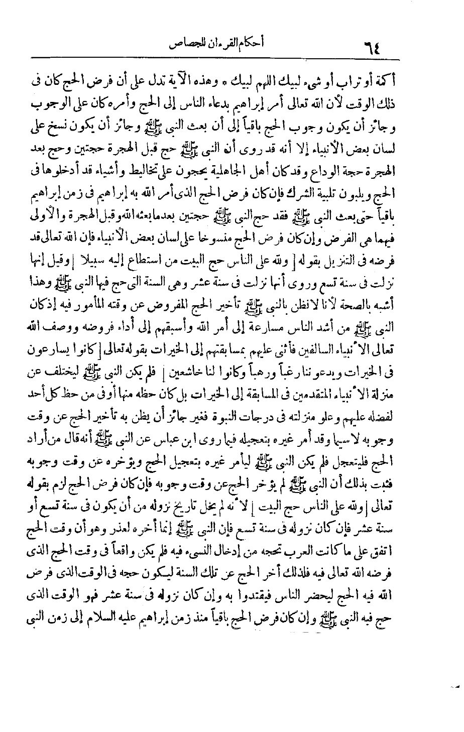 وَقَدْ كَانَ أَهْلُ الْجَاهِلِيَّةِ يَحُجُّونَ عَلَى تَخَالِيطَ وَأَشْيَاءَ قَدْ أَدْخَلُوهَا فِي الْحَجِّ وَيُلَبُّونَ تَلْبِيَةَ الشِّرْكِ فَإِنْ كَانَ فَرْضُ الْحَجِّ الَّذِي أَمَرَ اللَّهُ بِهِ إبْرَاهِيمَ فِي زمن إبراهيم بَاقِيًا حَتَّى بُعِثَ النَّبِيُّ صَلَّى اللَّهُ عَلَيْهِ وَسَلَّمَ فَقَدْ حَجَّ النَّبِيُّ صَلَّى اللَّهُ عَلَيْهِ وسلّم حجتين بعد ما بعثه الله وقبل الْهِجْرَةِ وَالْأُولَى فِيهِمَا هِيَ الْفَرْضُ وَإِنْ كَانَ فَرْضُ الْحَجِّ مَنْسُوخًا عَلَى لِسَانِ بَعْضِ الْأَنْبِيَاءِ فَإِنَّ اللَّهَ تَعَالَى قَدْ فَرَضَهُ فِي التَّنْزِيلِ بِقَوْلِهِ وَلِلَّهِ عَلَى النَّاسِ حِجُّ الْبَيْتِ مَنِ اسْتَطاعَ إِلَيْهِ سَبِيلًا وَقِيلَ إنَّهَا نَزَلَتْ فِي سَنَةِ تِسْعٍ وَرُوِيَ أَنَّهَا نَزَلَتْ فِي سَنَةِ عَشْرٍ وَهِيَ السَّنَةُ الَّتِي حَجَّ فِيهَا النَّبِيُّ صَلَّى اللَّهُ عَلَيْهِ وَسَلَّمَ وَهَذَا أَشْبَهُ بِالصِّحَّةِ لِأَنَّا لَا نَظُنُّ بِالنَّبِيِّ صَلَّى اللَّهُ عَلَيْهِ وَسَلَّمَ تَأْخِيرَ الْحَجِّ الْمَفْرُوضِ عَنْ وَقْتِهِ الْمَأْمُورِ فِيهِ إذْ كَانَ النَّبِيُّ صَلَّى اللَّهُ عَلَيْهِ وَسَلَّمَ مِنْ أَشَدِّ النَّاسِ مُسَارَعَةً إلَى أَمْرِ اللَّهِ وَأَسْبَقِهِمْ إلَى أَدَاءِ فُرُوضِهِ وَوَصَفَ اللَّهُ تَعَالَى الْأَنْبِيَاءَ السَّالِفِينَ فَأَثْنَى عَلَيْهِمْ بِمُسَابِقَتِهِمْ إلَى الْخَيْرَاتِ بِقَوْلِهِ تَعَالَى كانُوا يُسارِعُونَ فِي الْخَيْراتِ وَيَدْعُونَنا رَغَباً وَرَهَباً وَكانُوا لَنا خاشِعِينَ فَلَمْ يَكُنْ النَّبِيُّ صَلَّى اللَّهُ عَلَيْهِ وَسَلَّمَ ليختلف عَنْ مَنْزِلَةِ الْأَنْبِيَاءِ الْمُتَقَدِّمِينَ فِي الْمُسَابَقَةِ إلَى الخيرات بل كان حظه منها أو في مِنْ حَظِّ كُلِّ أَحَدٍ لِفَضْلِهِ عَلَيْهِمْ وَعُلُوِّ مَنْزِلَتِهِ فِي دَرَجَاتِ النُّبُوَّةِ فَغَيْرُ جَائِزٍ أَنْ يُظَنَّ بِهِ تَأْخِيرُ الْحَجِّ عَنْ وَقْتِ وُجُوبِهِ لَا سِيَّمَا وَقَدْ أَمَرَ غَيْرَهُ بِتَعْجِيلِهِ فِيمَا