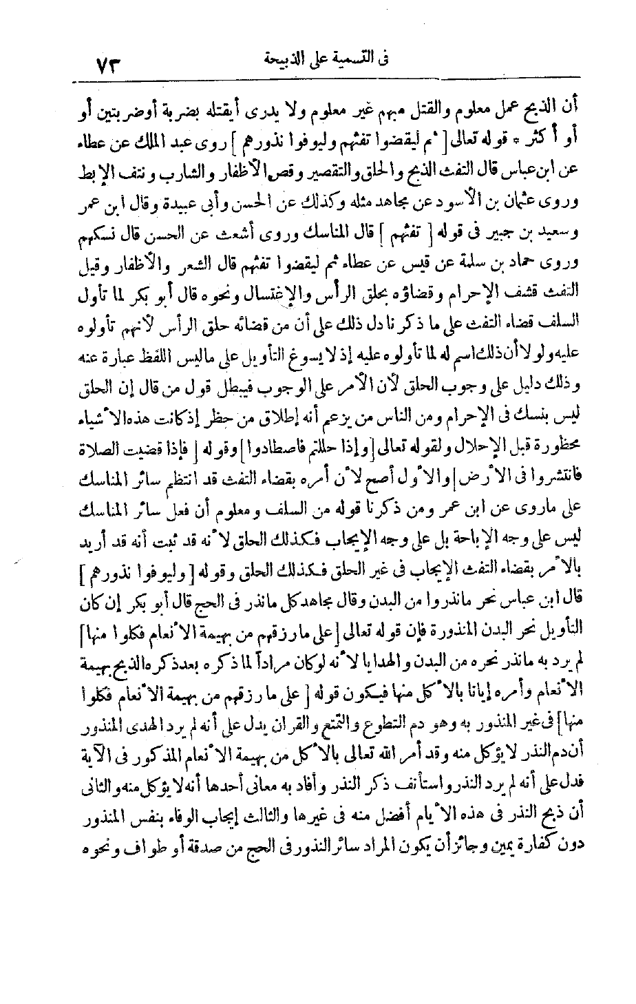 أَنَّ الذَّبْحَ عَمَلٌ مَعْلُومٌ وَالْقَتْلُ مُبْهَمٌ غَيْرُ معلوم ولا يدرى أيقتله بضربة أو ضربتين أو أَوْ أَكْثَرَ قَوْله تَعَالَى ثُمَّ لْيَقْضُوا تَفَثَهُمْ وَلْيُوفُوا نُذُورَهُمْ رَوَى عَبْدُ الْمَلِكِ عَنْ عَطَاءٍ عَنْ ابْنِ عَبَّاسٍ قَالَ التَّفَثُ الذَّبْحُ وَالْحَلْقُ وَالتَّقْصِيرُ وَقَصُّ الْأَظْفَارِ وَالشَّارِبِ وَنَتْفُ الْإِبِطِ وَرَوَى عُثْمَانُ بْنُ الْأَسْوَدِ عَنْ مُجَاهِدٍ مِثْلَهُ وَكَذَلِكَ عَنْ الْحَسَنِ وَأَبِي عُبَيْدَةَ وَقَالَ ابْنُ عُمَرَ وَسَعِيدُ بْنُ جبير في قوله تَفَثَهُمْ قَالَ الْمَنَاسِكُ وَرَوَى أَشْعَثُ عَنْ الْحَسَنِ قَالَ نُسُكُهُمْ وَرَوَى حَمَّادُ بْنُ سَلَمَةَ عَنْ قَيْسٍ عن عطاء ثم ليقضوا تفثهم قَالَ الشَّعْرُ وَالْأَظْفَارُ وَقِيلَ التَّفَثُ قَشَفُ الْإِحْرَامِ وَقَضَاؤُهُ بِحَلْقِ الرَّأْسِ وَالِاغْتِسَالِ وَنَحْوِهِ قَالَ أَبُو بَكْرٍ لَمَّا تَأَوَّلَ السَّلَفُ قَضَاءَ التَّفَثِ عَلَى مَا ذَكَرْنَا دَلَّ ذَلِكَ عَلَى أَنَّ مِنْ قَضَائِهِ حَلْقَ الرَّأْسِ لِأَنَّهُمْ تَأَوَّلُوهُ عَلَيْهِ وَلَوْلَا أَنَّ ذَلِكَ اسْمٌ لَهُ لَمَا تَأَوَّلُوهُ عَلَيْهِ إذْ لَا يُسَوَّغُ التَّأْوِيلُ عَلَى مَا لَيْسَ اللَّفْظُ عِبَارَةً عَنْهُ وَذَلِكَ دَلِيلٌ عَلَى وُجُوبِ الْحَلْقِ لِأَنَّ الْأَمْرَ عَلَى الْوُجُوبِ فَيَبْطُلُ قَوْلُ مَنْ قَالَ إنَّ الْحَلْقَ لَيْسَ بِنُسُكٍ فِي الْإِحْرَامِ وَمِنْ النَّاسِ مَنْ يَزْعُمُ أَنَّهُ إطْلَاقٌ مِنْ حَظْرٍ إذْ كَانَتْ هَذِهِ الْأَشْيَاءُ مَحْظُورَةً قبل الإحلال ولقوله تعالى وَإِذا حَلَلْتُمْ فَاصْطادُوا وَقَوْلِهِ فَإِذا قُضِيَتِ الصَّلاةُ فَانْتَشِرُوا فِي الْأَرْضِ وَالْأَوَّلُ أَصَحُّ لِأَنَّ أَمْرَهُ بِقَضَاءِ التَّفَثِ قَدْ انْتَظَمَ سَائِرَ الْمَنَاسِكِ عَلَى مَا رُوِيَ عَنْ ابْنِ عُمَرَ وَمَنْ ذَكَرْنَا قَوْلَهُ مِنْ السَّلَفِ وَمَعْلُومٌ أَنَّ فِعْلَ سَائِرِ الْمَنَاسِكِ لَيْسَ عَلَى وَجْهِ الْإِبَاحَةِ بَلْ عَلَى وَجْهِ الْإِيجَابِ فَكَذَلِكَ الْحَلْقُ لِأَنَّهُ قَدْ ثَبَتَ أَنَّهُ قَدْ أُرِيدَ بِالْأَمْرِ بِقَضَاءِ التَّفَثِ الْإِيجَابُ فِي غَيْرِ الْحَلْقِ فكذلك الحلق وقوله وَلْيُوفُوا نُذُورَهُمْ قَالَ ابْنُ عَبَّاسٍ نَحْرُ مَا نَذَرُوا مِنْ الْبُدْنِ وَقَالَ مُجَاهِدٌ كُلُّ مَا نُذِرَ فِي الْحَجِّ قَالَ أَبُو بَكْرٍ إنْ كَانَ التَّأْوِيلُ نَحْرَ الْبُدْنِ الْمَنْذُورَةِ فَإِنَّ قَوْله تَعَالَى عَلى مَا رَزَقَهُمْ مِنْ بَهِيمَةِ الْأَنْعامِ فَكُلُوا مِنْها لَمْ يُرِدْ بِهِ مَا نُذِرَ نَحْرُهُ مِنْ الْبُدْنِ وَالْهَدَايَا لِأَنَّهُ لَوْ كَانَ مُرَادًا لَمَا ذَكَرَهُ بَعْدَ ذِكْرِهِ الذَّبْحَ بَهِيمَةِ الْأَنْعَامِ وَأَمْرِهِ إيَّانَا بِالْأَكْلِ مِنْهَا فَيَكُونُ قَوْلُهُ عَلى مَا رَزَقَهُمْ مِنْ بَهِيمَةِ الْأَنْعامِ فَكُلُوا مِنْها فِي غَيْرِ الْمَنْذُورِ بِهِ وَهُوَ دَمُ التَّطَوُّعِ والتمتع والقران يدل عَلَى أَنَّهُ لَمْ يُرِدْ الْهَدْيَ الْمَنْذُورَ أَنَّ دَمَ النَّذْرِ لَا يُؤْكَلُ مِنْهُ وَقَدْ أَمَرَ اللَّهُ تَعَالَى بِالْأَكْلِ مِنْ بَهِيمَةِ الْأَنْعَامِ الْمَذْكُورِ فِي الْآيَةِ فَدَلَّ عَلَى أَنَّهُ لَمْ يُرِدْ النذر واستأنف ذكر النذر وأفاد به معاني أَحَدُهَا أَنَّهُ لَا يُؤْكَلُ مِنْهُ وَالثَّانِي أَنَّ ذَبْحَ النَّذْرِ فِي هَذِهِ الْأَيَّامِ أَفْضَلُ مِنْهُ فِي غَيْرِهَا وَالثَّالِثُ إيجَابُ الْوَفَاءِ بِنَفْسِ الْمَنْذُورِ دُونَ كَفَّارَةِ يَمِينٍ وَجَائِزٌ أَنْ يَكُونَ الْمُرَادُ سَائِرَ النُّذُورِ فِي الْحَجِّ مِنْ صَدَقَةٍ أَوْ طواف ونحوه