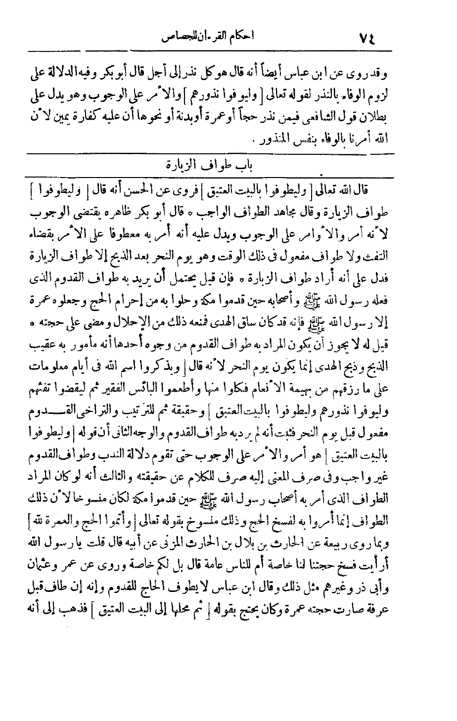 قَالَ اللَّهُ تَعَالَى وَلْيَطَّوَّفُوا بِالْبَيْتِ الْعَتِيقِ فروى عن الحسن أنه قال وَلْيَطَّوَّفُوا طَوَافَ الزِّيَارَةِ وَقَالَ مُجَاهِدٌ الطَّوَافُ الْوَاجِبُ قَالَ أَبُو بَكْرٍ ظَاهِرُهُ يَقْتَضِي الْوُجُوبَ لِأَنَّهُ أَمْرٌ وَالْأَوَامِرُ عَلَى الْوُجُوبِ وَيَدُلُّ عَلَيْهِ أَنَّهُ أَمَرَ بِهِ مَعْطُوفًا عَلَى الْأَمْرِ بِقَضَاءِ التَّفَثِ وَلَا طَوَافَ مَفْعُولٌ فِي ذَلِكَ الْوَقْتِ وَهُوَ يَوْمُ النَّحْرِ بَعْدَ الذَّبْحِ إلَّا طَوَافُ الزِّيَارَةِ فَدَلَّ عَلَى أَنَّهُ أَرَادَ طَوَافَ الزِّيَارَةِ فَإِنْ قِيلَ يُحْتَمَلُ أَنْ يُرِيدَ بِهِ طَوَافَ الْقُدُومِ الَّذِي فَعَلَهُ رَسُولُ اللَّهِ صَلَّى اللَّهُ عَلَيْهِ وَسَلَّمَ وَأَصْحَابُهُ حِينَ قَدِمُوا مَكَّةَ وَحَلُّوا بِهِ مِنْ إحْرَامِ الْحَجِّ وَجَعَلُوهُ عُمْرَةً إلَّا رَسُولِ اللَّهِ صَلَّى اللَّهُ عَلَيْهِ وَسَلَّمَ