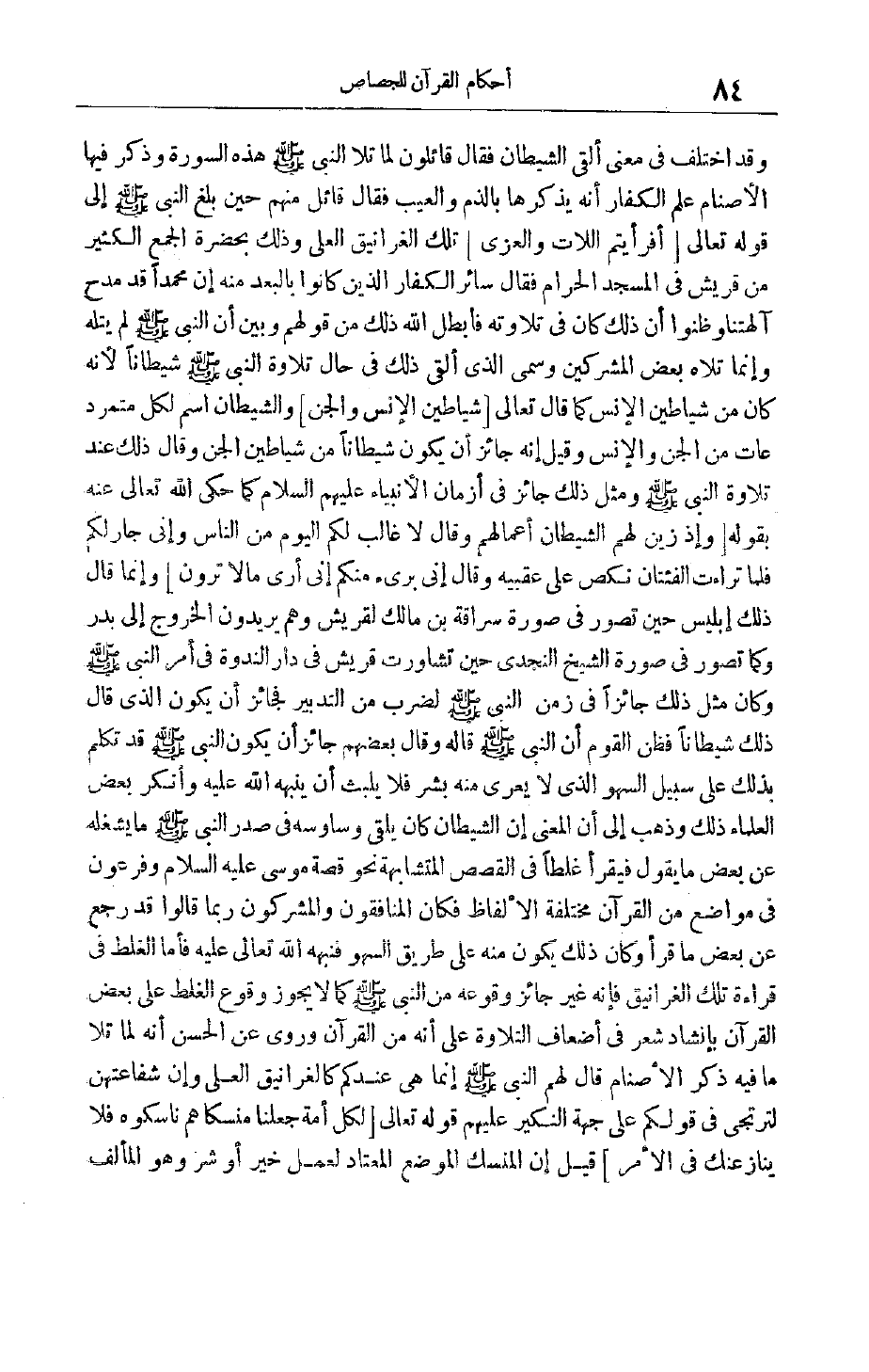 وَقَدْ اُخْتُلِفَ فِي مَعْنَى أَلْقَى الشَّيْطَانُ فَقَالَ قَائِلُونَ لَمَّا تَلَا النَّبِيُّ صَلَّى اللَّهُ عَلَيْهِ وَسَلَّمَ هَذِهِ السُّورَةَ وَذَكَرَ فِيهَا الْأَصْنَامَ عَلِمَ الْكُفَّارُ أَنَّهُ يَذْكُرُهَا بِالذَّمِّ وَالْعَيْبِ فَقَالَ قَائِلٌ مِنْهُمْ حِينَ بَلَغَ النَّبِيِّ صَلَّى اللَّهُ عَلَيْهِ وَسَلَّمَ إلَى قَوْلِهِ تَعَالَى أَفَرَأَيْتُمُ اللَّاتَ وَالْعُزَّى تِلْكَ الْغَرَانِيقُ الْعُلَى وَذَلِكَ بِحَضْرَةِ الْجَمْعِ الْكَثِيرِ مِنْ قُرَيْشٍ فِي الْمَسْجِدِ الْحَرَامِ فَقَالَ سَائِرُ الْكُفَّارِ الَّذِينَ كَانُوا بِالْبُعْدِ مِنْهُ إنَّ مُحَمَّدًا قَدْ مَدَحَ آلِهَتَنَا وَظَنُّوا أَنَّ ذَلِكَ كَانَ فِي تِلَاوَتِهِ فَأَبْطَلَ اللَّهُ ذَلِكَ مِنْ قَوْلِهِمْ وَبَيَّنَ أَنَّ النَّبِيَّ صَلَّى اللَّهُ عَلَيْهِ وَسَلَّمَ لَمْ يَتْلُهُ وَإِنَّمَا تَلَاهُ بَعْضُ الْمُشْرِكِينَ وَسَمَّى الَّذِي أَلْقَى ذَلِكَ فِي حَالِ تِلَاوَةِ النَّبِيِّ صَلَّى اللَّهُ عَلَيْهِ وَسَلَّمَ شَيْطَانًا لِأَنَّهُ كَانَ مِنْ شَيَاطِينِ الْإِنْسِ كَمَا قَالَ تَعَالَى شَياطِينَ الْإِنْسِ وَالْجِنِّ وَالشَّيْطَانُ اسْمٌ لِكُلِّ مُتَمَرِّدٍ عَاتٍ مِنْ الْجِنِّ وَالْإِنْسِ وَقِيلَ إنَّهُ جَائِزٌ أَنْ يَكُونَ شَيْطَانًا مِنْ شَيَاطِينِ الْجِنِّ وَقَالَ ذَلِكَ عِنْدَ تِلَاوَةِ النَّبِيِّ صَلَّى اللَّهُ عَلَيْهِ وَسَلَّمَ وَمِثْلُ ذَلِكَ جَائِزٌ فِي أَزْمَانِ الْأَنْبِيَاءِ عَلَيْهِمْ السَّلَامُ كَمَا حَكَى اللَّهُ تَعَالَى عَنْهُ بِقَوْلِهِ وَإِذْ زَيَّنَ لَهُمُ الشَّيْطانُ أَعْمالَهُمْ وَقالَ لا غالِبَ لَكُمُ الْيَوْمَ مِنَ النَّاسِ وَإِنِّي جارٌ لَكُمْ فَلَمَّا تَراءَتِ الْفِئَتانِ نَكَصَ عَلى عَقِبَيْهِ وَقالَ إِنِّي بَرِيءٌ مِنْكُمْ إِنِّي أَرى مَا لا تَرَوْنَ وَإِنَّمَا قَالَ ذَلِكَ إبْلِيسُ حِينَ تَصَوَّرَ فِي صُورَةِ سُرَاقَةَ بْنِ مَالِكٍ لِقُرَيْشٍ وَهُمْ يُرِيدُونَ الْخُرُوجَ إلَى بَدْرٍ وَكَمَا تَصَوَّرَ فِي صُورَةِ الشَّيْخِ النَّجْدِيِّ حِينَ تَشَاوَرَتْ قُرَيْشٌ فِي دَارِ النَّدْوَةِ فِي أَمْرِ النَّبِيِّ صَلَّى اللَّهُ عَلَيْهِ وَسَلَّمَ وَكَانَ مِثْلُ ذَلِكَ جَائِزًا فِي زَمَنِ النَّبِيِّ صَلَّى اللَّهُ عَلَيْهِ وَسَلَّمَ لِضَرْبٍ مِنْ التَّدْبِيرِ فَجَائِزٌ أَنْ يَكُونَ الَّذِي قَالَ ذَلِكَ شَيْطَانًا فَظَنَّ الْقَوْمُ أَنَّ النَّبِيَّ صَلَّى اللَّهُ عَلَيْهِ وَسَلَّمَ قَالَهُ وَقَالَ بَعْضُهُمْ جَائِزٌ أَنْ يَكُونَ النَّبِيُّ صَلَّى اللَّهُ عَلَيْهِ وَسَلَّمَ قَدْ تَكَلَّمَ بِذَلِكَ عَلَى سَبِيلِ السَّهْوِ الَّذِي لَا يَعْرَى مِنْهُ بَشَرٌ فَلَا يَلْبَثُ أَنْ يُنَبِّهَهُ اللَّهُ عَلَيْهِ وَأَنْكَرَ بَعْضُ الْعُلَمَاءِ ذَلِكَ وَذَهَبَ إلَى أَنَّ الْمَعْنَى أَنَّ الشَّيْطَانَ كَانَ يُلْقِي وَسَاوِسَهُ فِي صَدْرِ النَّبِيِّ صَلَّى اللَّهُ عَلَيْهِ وَسَلَّمَ مَا يُشْغِلُهُ عَنْ بَعْضِ مَا يَقُولُ فَيَقْرَأُ غَلَطًا فِي الْقَصَصِ الْمُتَشَابِهَةِ نَحْوَ قِصَّةِ مُوسَى عَلَيْهِ السَّلَامُ وَفِرْعَوْنَ فِي مَوَاضِعَ مِنْ الْقُرْآنِ مُخْتَلِفَةَ الْأَلْفَاظِ فَكَانَ الْمُنَافِقُونَ وَالْمُشْرِكُونَ رُبَّمَا قَالُوا قَدْ رَجَعَ عَنْ بَعْضِ مَا قَرَأَ وَكَانَ ذَلِكَ يَكُونُ مِنْهُ عَلَى طَرِيقِ السَّهْوِ فَنَبَّهَهُ اللَّهُ تَعَالَى عَلَيْهِ فَأَمَّا الْغَلَطُ فِي قِرَاءَةِ تِلْكَ الْغَرَانِيقُ فَإِنَّهُ غَيْرُ جَائِزٍ وُقُوعُهُ مِنْ النَّبِيِّ صَلَّى اللَّهُ عَلَيْهِ وَسَلَّمَ كَمَا لَا يَجُوزُ وُقُوعُ الْغَلَطِ عَلَى بَعْضِ الْقُرْآنِ بِإِنْشَادِ شِعْرٍ فِي أَضْعَافِ التِّلَاوَةِ عَلَى أَنَّهُ مِنْ الْقُرْآنِ