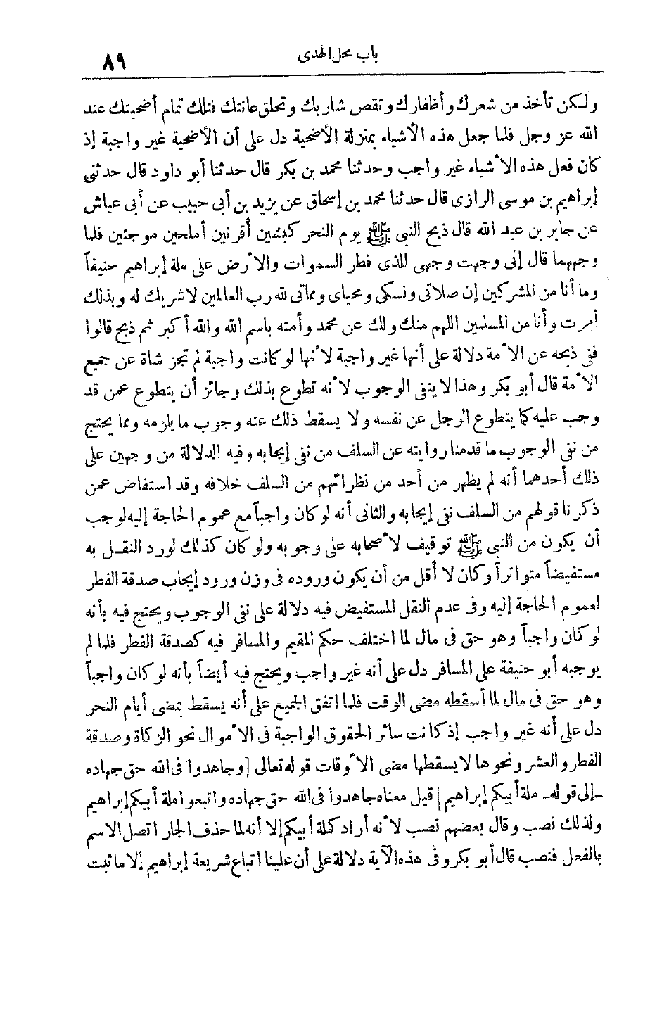 قَوْله تَعَالَى وَجاهِدُوا فِي اللَّهِ حَقَّ جِهادِهِ- إلى قوله- مِلَّةَ أَبِيكُمْ إِبْراهِيمَ قِيلَ مَعْنَاهُ جَاهِدُوا فِي اللَّهِ حَقَّ جِهَادِهِ واتبعوا ملة أبيكم إبراهيم ولذلك نصب وقال بَعْضُهُمْ نُصِبَ لِأَنَّهُ أَرَادَ كَمِلَّةِ أَبِيكُمْ إلَّا أَنَّهُ لَمَّا حُذِفَ الْجَارُّ اتَّصَلَ الِاسْمُ بِالْفِعْلِ فَنُصِبَ قَالَ أَبُو بَكْرٍ وَفِي هَذِهِ الْآيَةِ دَلَالَةٌ عَلَى أَنَّ عَلَيْنَا اتِّبَاعَ شَرِيعَةِ إبْرَاهِيمَ إلَّا مَا ثَبَتَ
