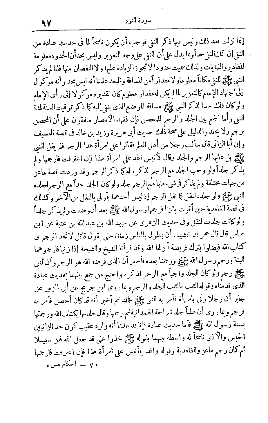 إنَّمَا نَزَلَتْ بَعْدَ ذَلِكَ وَلَيْسَ فِيهَا ذِكْرُ النَّفْيِ فَوَجَبَ أَنْ يَكُونَ نَاسِخًا لِمَا فِي حَدِيثِ عُبَادَةَ مِنْ النَّفْيِ إنْ كَانَ النَّفْيُ حَدًّا وَمِمَّا يَدُلُّ عَلَى أَنَّ النَّفْيَ عَلَى وَجْهِ التَّعْزِيرِ وَلَيْسَ بِحَدٍّ أَنَّ الْحُدُودَ مَعْلُومَةُ الْمَقَادِيرِ وَالنِّهَايَاتِ وَلِذَلِكَ سُمِّيَتْ حُدُودًا لَا تَجُوزُ الزِّيَادَةُ عَلَيْهَا وَلَا النُّقْصَانُ مِنْهَا فَلَمَّا لَمْ يَذْكُرْ النَّبِيُّ صَلَّى اللَّهُ عَلَيْهِ وَسَلَّمَ لِلنَّفْيِ مَكَانًا مَعْلُومًا وَلَا مِقْدَارًا مِنْ الْمَسَافَةِ وَالْبُعْدِ عَلِمْنَا أَنَّهُ لَيْسَ بِحَدٍّ وَأَنَّهُ مَوْكُولٌ إلَى اجْتِهَادِ الْإِمَامِ كَالتَّعْزِيرِ لَمَّا لَمْ يَكُنْ لَهُ مِقْدَارٌ مَعْلُومٌ كَانَ تَقْدِيرُهُ مَوْكُولًا إلَى رَأْيِ الْإِمَامِ وَلَوْ كَانَ ذَلِكَ حَدًّا لَذَكَرَ النَّبِيُّ صَلَّى اللَّهُ عَلَيْهِ وَسَلَّمَ مَسَافَةَ الْمَوْضِعِ الَّذِي يُنْفَى إلَيْهِ كَمَا ذَكَرَ تَوْقِيتَ السَّنَةِ لِمُدَّةِ النَّفْيِ وَأَمَّا الْجَمْعُ بَيْنَ الْجَلْدِ وَالرَّجْمِ لِلْمُحْصَنِ فَإِنَّ فُقَهَاءَ الْأَمْصَارِ مُتَّفِقُونَ عَلَى أَنَّ الْمُحْصَنَ يُرْجَمُ وَلَا يُجْلَدُ وَالدَّلِيلُ عَلَى صِحَّةِ ذَلِكَ حَدِيثُ أَبِي هُرَيْرَة وَزَيْدِ بْنِ خَالِدٍ فِي قِصَّةِ الْعَسِيفِ وَأَنَّ أَبَا الزَّانِي قَالَ سَأَلْت رَجُلًا مِنْ أَهْلِ الْعِلْمِ فَقَالُوا عَلَى امْرَأَةِ هَذَا الرَّجْمُ فَلَمْ يَقُلْ النَّبِيُّ صَلَّى اللَّهُ عَلَيْهِ وَسَلَّمَ بَلْ عَلَيْهَا الرَّجْمُ وَالْجَلْدُ وَقَالَ لِأُنَيْسٍ اُغْدُ عَلَى امْرَأَةِ هَذَا فَإِنْ اعْتَرَفَتْ فَارْجُمْهَا وَلَمْ يَذْكُرْ جَلْدًا وَلَوْ وَجَبَ الْجَلْدُ مَعَ الرَّجْمِ لَذَكَرَهُ لَهُ كَمَا ذَكَرَ الرَّجْمَ وقد وردت قصة ما عز مِنْ جِهَاتٍ مُخْتَلِفَةٍ وَلَمْ يُذْكَرْ فِي شَيْءٍ مِنْهَا مَعَ الرَّجْمِ جَلْدٌ وَلَوْ كَانَ الْجَلْدُ حَدًّا مَعَ الرَّجْمِ لَجَلَدَهُ النَّبِيُّ صَلَّى اللَّهُ عَلَيْهِ وَسَلَّمَ وَلَوْ جَلَدَهُ لَنُقِلَ كَمَا نُقِلَ الرَّجْمُ إذْ لَيْسَ أَحَدُهُمَا بِأَوْلَى بِالنَّقْلِ مِنْ الْآخَرِ وَكَذَلِكَ
