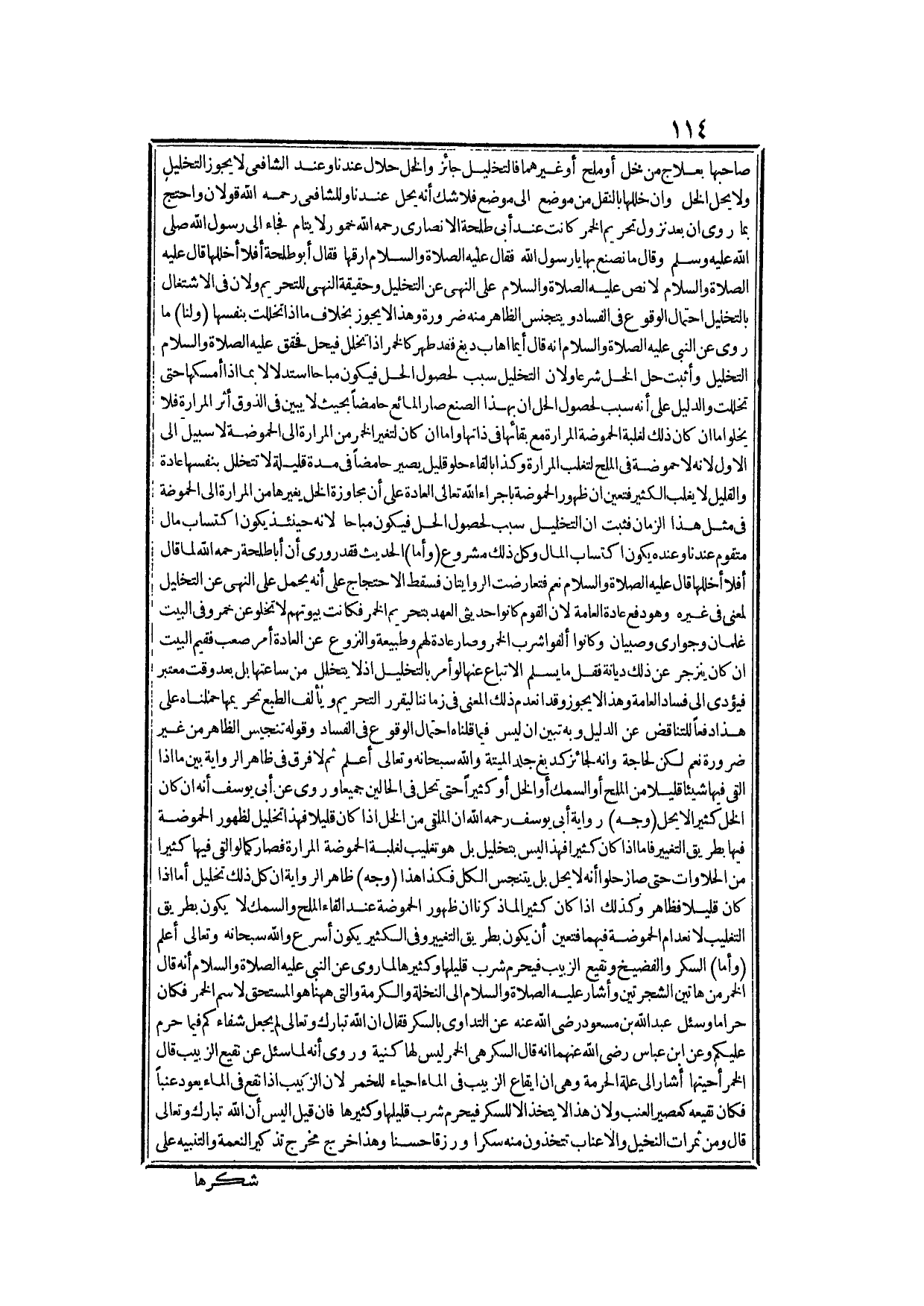 (وَأَمَّا) الْحَدِيثُ فَقَدْ رُوِيَ «أَنَّ أَبَا طَلْحَةَ - رَحِمَهُ اللَّهُ - لَمَّا قَالَ: أَفَلَا أُخَلِّلُهَا؟ قَالَ: - عَلَيْهِ الصَّلَاةُ وَالسَّلَامُ - نَعَمْ» فَتَعَارَضَتْ الرِّوَايَتَانِ فَسَقَطَ الِاحْتِجَاجُ عَلَى أَنَّهُ يُحْمَلُ عَلَى النَّهْيِ عَنْ التَّخْلِيلِ لِمَعْنًى فِي غَيْرِهِ وَهُوَ دَفْعُ عَادَةِ الْعَامَّةِ، لِأَنَّ الْقَوْمَ كَانُوا حَدِيثِي الْعَهْدِ بِتَحْرِيمِ الْخَمْرِ فَكَانَتْ بُيُوتُهُمْ لَا تَخْلُو عَنْ خَمْرٍ وَفِي الْبَيْتِ غِلْمَانٌ وَجَوَارٍ وَصِبْيَانٌ، وَكَانُوا أَلِفُوا شُرْبَ الْخَمْرِ وَصَارَ عَادَةً لَهُمْ وَطَبِيعَةً، وَالنُّزُوعُ عَنْ الْعَادَةِ أَمْرٌ صَعْبٌ فَقَيِّمُ الْبَيْتِ إنْ كَانَ يَنْزَجِرُ عَنْ ذَلِكَ دِيَانَةً فَقَلَّ مَا يَسْلَمُ الْأَتْبَاعُ عَنْهَا لَوْ أَمَرَ بِالتَّخْلِيلِ إذْ لَا يَتَخَلَّلُ مِنْ سَاعَتِهَا بَلْ بَعْدَ وَقْتٍ مُعْتَبَرٍ فَيُؤَدِّي إلَى فَسَادِ الْعَامَّةِ وَهَذَا لَا يَجُوزُ، وَقَدْ انْعَدَمَ ذَلِكَ الْمَعْنَى فِي زَمَانِنَا لِيُقَرَّرَ التَّحْرِيمُ وَيَأْلَفَ الطَّبْعُ تَحْرِيمَهَا؛ حَمَلْنَاهُ عَلَى هَذَا دَفْعًا لِلتَّنَاقُضِ عَنْ الدَّلِيلِ، وَبِهِ تَبَيَّنَ أَنْ لَيْسَ فِيمَا قُلْنَاهُ احْتِمَالُ الْوُقُوعِ فِي الْفَسَادِ.