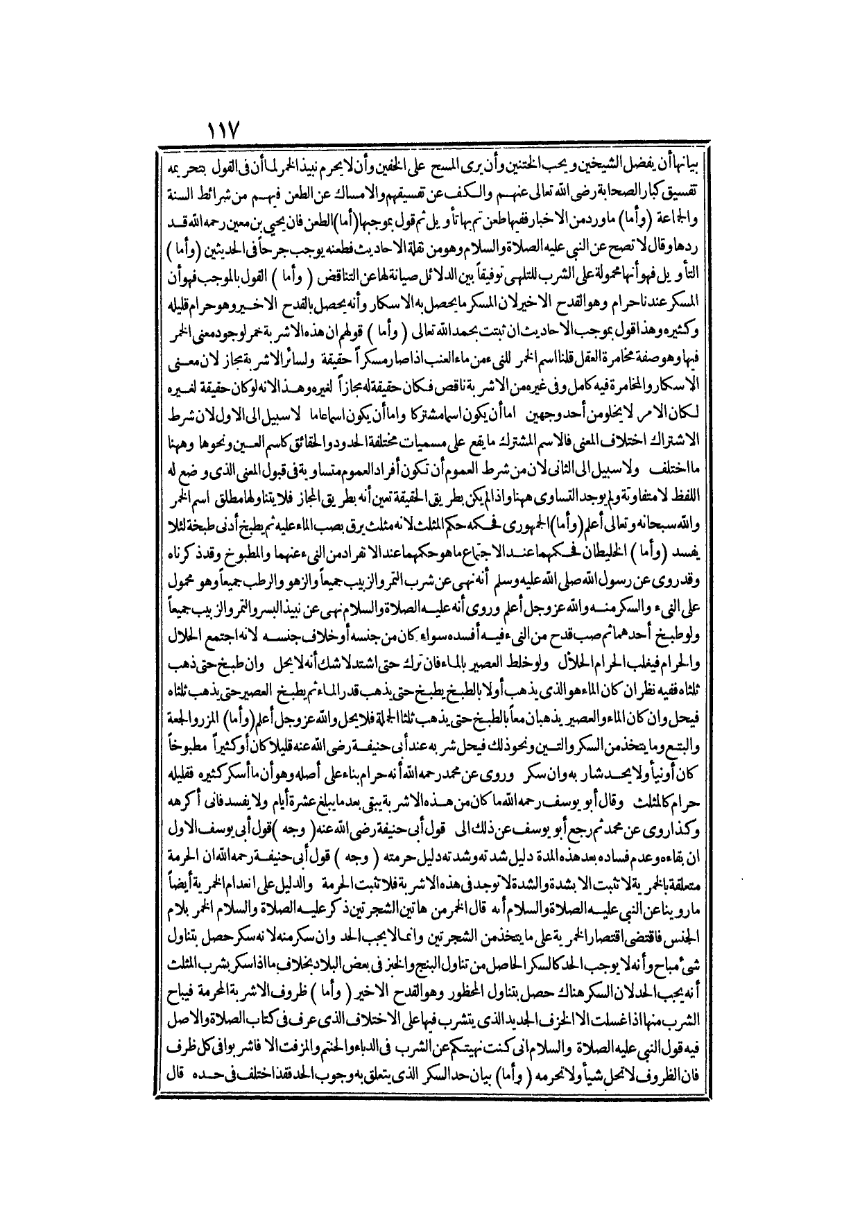 بَيَانِهَا: " أَنْ يُفَضِّلَ الشَّيْخَيْنِ، وَيُحِبَّ الْخَتَنَيْنِ، وَأَنْ يَرَى الْمَسْحَ عَلَى الْخُفَّيْنِ، وَأَنْ لَا يَحْرُمَ نَبِيذَ الْخَمْرِ " لِمَا أَنَّ فِي الْقَوْلِ بِتَحْرِيمِهِ تَفْسِيقَ كِبَارِ الصَّحَابَةِ - رَضِيَ اللَّهُ تَعَالَى عَنْهُمْ -، وَالْكَفُّ عَنْ تَفْسِيقِهِمْ، وَالْإِمْسَاكُ عَنْ الطَّعْنِ فِيهِمْ مِنْ شَرَائِطِ السُّنَّةِ وَالْجَمَاعَةِ.