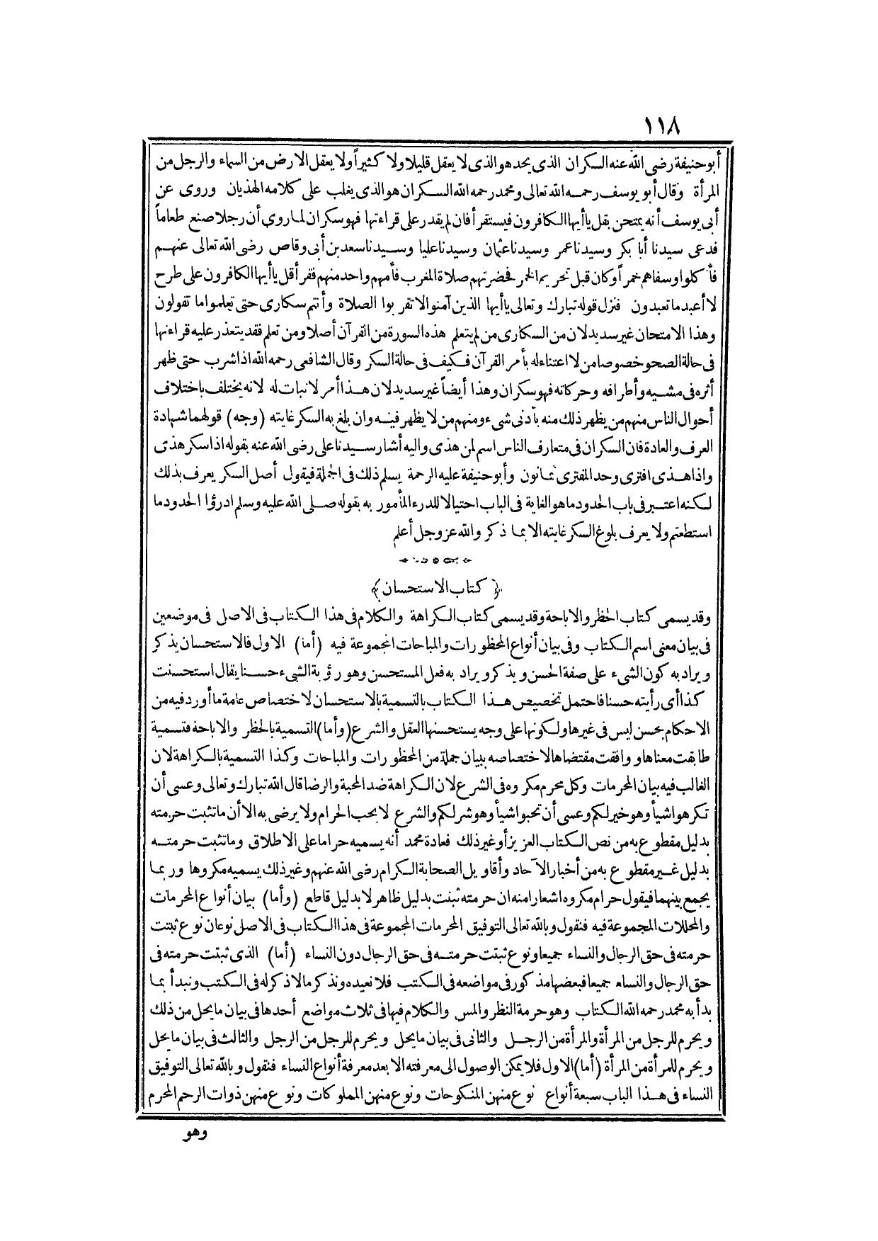 (وَأَمَّا) بَيَانُ أَنْوَاعِ الْمُحَرَّمَاتِ وَالْمُحَلَّلَاتِ الْمَجْمُوعَةِ فِيهِ فَنَقُولُ وَبِاَللَّهِ تَعَالَى التَّوْفِيقُ الْمُحَرَّمَاتُ الْمَجْمُوعَةُ فِي هَذَا الْكِتَابِ فِي الْأَصْلِ نَوْعَانِ نَوْعٌ ثَبَتَتْ حُرْمَتُهُ فِي حَقِّ الرِّجَالِ وَالنِّسَاءِ جَمِيعًا وَنَوْعٌ ثَبَتَتْ حُرْمَتُهُ فِي حَقِّ الرِّجَالِ دُونَ النِّسَاءِ (أَمَّا) الَّذِي ثَبَتَتْ حُرْمَتُهُ فِي حَقِّ الرِّجَالِ وَالنِّسَاءِ جَمِيعًا فَبَعْضُهَا مَذْكُورٌ فِي مَوَاضِعِهِ فِي الْكُتُبِ فَلَا نُعِيدُهُ وَنَذْكُرُ مَا لَا ذِكْرَ لَهُ فِي الْكُتُبِ وَنَبْدَأُ بِمَا بَدَأَ بِهِ مُحَمَّدٌ - رَحِمَهُ اللَّهُ - الْكِتَابَ وَهُوَ حُرْمَةُ النَّظَرِ وَالْمَسِّ وَالْكَلَامُ فِيهَا فِي ثَلَاثِ مَوَاضِعَ أَحَدُهَا فِي بَيَانِ مَا يَحِلُّ مِنْ ذَلِكَ وَيَحْرُمُ لِلرَّجُلِ مِنْ الْمَرْأَةِ وَالْمَرْأَةِ مِنْ الرَّجُلِ وَالثَّانِي فِي بَيَانِ مَا يَحِلُّ وَيَحْرُمُ لِلرَّجُلِ مِنْ الرَّجُلِ وَالثَّالِثُ فِي بَيَانِ مَا يَحِلُّ وَيَحْرُمُ لِلْمَرْأَةِ مِنْ الْمَرْأَةِ.