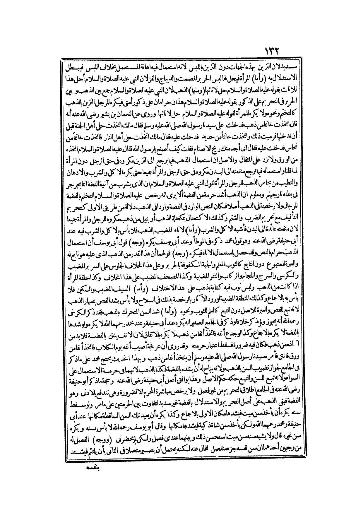 (وَمِنْهَا) الذَّهَبُ لِأَنَّ النَّبِيَّ - عَلَيْهِ الصَّلَاةُ وَالسَّلَامُ - جَمَعَ بَيْنَ الذَّهَبِ وَبَيْنَ الْحَرِيرِ فِي التَّحْرِيمِ عَلَى الذُّكُورِ بِقَوْلِهِ - عَلَيْهِ الصَّلَاةُ وَالسَّلَامُ - «هَذَانِ حَرَامَانِ عَلَى ذُكُورِ أُمَّتِي» فَيُكْرَهُ لِلرَّجُلِ التَّزَيُّنُ بِالذَّهَبِ كَالتَّخَتُّمِ وَنَحْوِهِ وَلَا يُكْرَهُ لِلْمَرْأَةِ لِقَوْلِهِ - عَلَيْهِ الصَّلَاةُ وَالسَّلَامُ - «حِلٌّ لِإِنَاثِهَا» وَرُوِيَ عَنْ «النُّعْمَانِ بْنِ بَشِيرٍ - رَضِيَ اللَّهُ عَنْهُ - أَنَّهُ قَالَ اتَّخَذْت خَاتَمًا مِنْ ذَهَبٍ فَدَخَلْت عَلَى سَيِّدِنَا رَسُولِ اللَّهِ - صَلَّى اللَّهُ عَلَيْهِ وَسَلَّمَ - فَقَالَ مَالَك اتَّخَذْت حُلِيَّ أَهْلِ الْجَنَّةِ قَبْلَ أَنْ تَدْخُلَهَا؟ فَرَمَيْت ذَلِكَ وَاِتَّخَذْت خَاتَمًا مِنْ حَدِيدٍ فَدَخَلْت عَلَيْهِ فَقَالَ مَالَك اتَّخَذَتْ حُلِيَّ أَهْلِ النَّارِ؟ فَاِتَّخَذْت خَاتَمًا مِنْ نُحَاسٍ فَدَخَلْت عَلَيْهِ فَقَالَ إنِّي أَجِدُ مِنْك رِيحَ الْأَصْنَامِ فَقُلْت كَيْفَ أَصْنَعُ يَا رَسُولَ اللَّهِ؟ فَقَالَ - عَلَيْهِ الصَّلَاةُ وَالسَّلَامُ - اتَّخِذْهُ مِنْ الْوَرِقِ وَلَا تَزِدْ عَلَى الْمِثْقَالِ» .