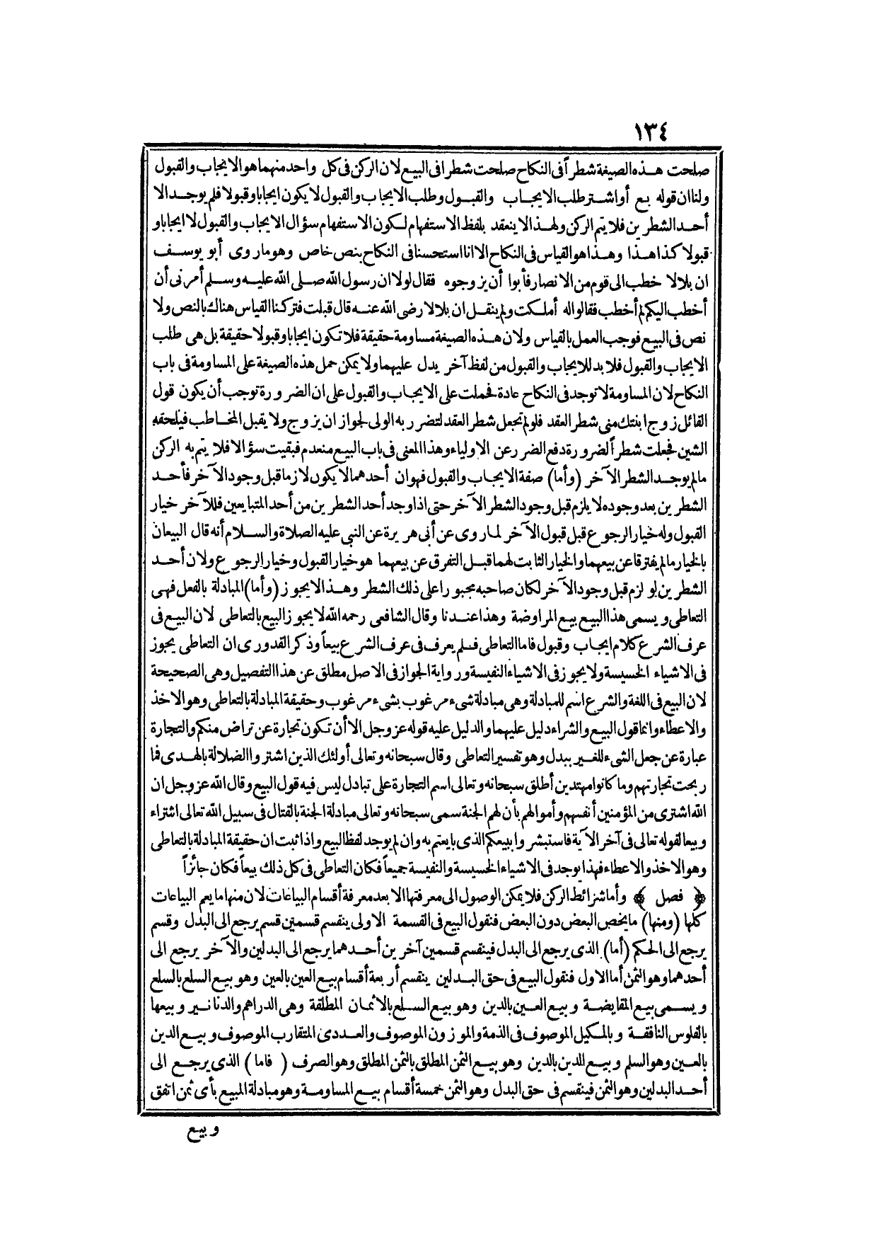 (وَأَمَّا) صِفَةُ الْإِيجَابِ وَالْقَبُولِ فَهُوَ أَنَّ أَحَدَهُمَا لَا يَكُونُ لَازِمًا قَبْلَ وُجُودِ الْآخَرِ، فَأَحَدُ الشَّطْرَيْنِ بَعْدَ وُجُودِهِ لَا يَلْزَمُ قَبْلَ وُجُودِ الشَّطْرِ الْآخَرِ حَتَّى إذَا وُجِدَ أَحَدُ الشَّطْرَيْنِ مِنْ أَحَدِ الْمُتَبَايِعَيْنِ، فَلِلْآخَرِ خِيَارُ الْقَبُولِ، وَلَهُ خِيَارُ الرُّجُوعِ قَبْلَ قَبُولِ الْآخَرِ؛ لِمَا رُوِيَ عَنْ أَبِي هُرَيْرَةَ عَنْ النَّبِيِّ - عَلَيْهِ الصَّلَاةُ وَالسَّلَامُ - أَنَّهُ قَالَ: «الْبَيِّعَانِ بِالْخِيَارِ مَا لَمْ يَفْتَرِقَا عَنْ بَيْعِهِمَا» ، وَالْخِيَارُ الثَّابِتُ لَهُمَا قَبْلَ التَّفَرُّقِ عَنْ بَيْعِهِمَا هُوَ خِيَارُ الْقَبُولِ، وَخِيَارُ الرُّجُوعِ؛ وَلِأَنَّ أَحَدَ الشَّطْرَيْنِ لَوْ لَزِمَ قَبْلَ وُجُودِ الْآخَرِ لَكَانَ صَاحِبُهُ مَجْبُورًا عَلَى ذَلِكَ الشَّطْرِ، وَهَذَا لَا يَجُوزُ.