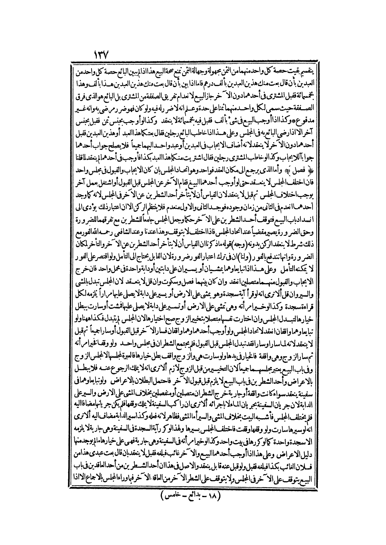 وَفِي بَابِ الْبَيْعِ يُعْتَبَرُ مَجْلِسُهُمَا جَمِيعًا؛ لِأَنَّ التَّخْيِيرَ مِنْ قِبَلِ الزَّوْجِ لَازِمٌ، أَلَا تَرَى: أَنَّهُ لَا يَمْلِكُ الرُّجُوعَ عَنْهُ، فَلَا يَبْطُلُ بِالْإِعْرَاضِ وَأَحَدُ الشَّطْرَيْنِ فِي بَابِ الْبَيْعِ لَا يَلْزَمُ قَبْلَ قَبُولِ الْآخَرِ، فَاحْتُمِلَ الْبُطْلَانُ بِالْإِعْرَاضِ، وَلَوْ تَبَايَعَا وَهُمَا فِي سَفِينَةٍ؛ يَنْعَقِدُ سَوَاءٌ كَانَتْ وَاقِفَةً أَوْ جَارِيَةً، خَرَجَ الشَّطْرَانِ مُتَّصِلَيْنِ أَوْ مُنْفَصِلَيْنِ، بِخِلَافِ الْمَشْيِ عَلَى الْأَرْضِ وَالسَّيْرِ عَلَى الدَّابَّةِ؛ لِأَنَّ جَرَيَانَ السَّفِينَةِ بِجَرَيَانِ الْمَاءِ لَا بِإِجْرَائِهِ أَلَا تَرَى: أَنَّ رَاكِبَ السَّفِينَةِ لَا يَمْلِكُ، وَقْفَهَا، فَلَمْ يَكُنْ جَرَيَانُهَا مُضَافًا إلَيْهِ، فَلَمْ يَخْتَلِفْ الْمَجْلِسُ فَأَشْبَهَ الْبَيْتَ، بِخِلَافِ الْمَشْيِ، وَالسَّيْرِ، أَمَّا الْمَشْيُ فَظَاهِرٌ؛ لِأَنَّهُ فَعَلَهُ، وَكَذَا سَيْرُ الدَّابَّةِ مُضَافٌ إلَيْهِ أَلَا تَرَى: أَنَّهُ لَوْ سَيَّرَهَا سَارَتْ، وَلَوْ، وَقَفَهَا، وَقَفَتْ فَاخْتَلَفَ الْمَجْلِسُ بِسَيْرِهَا، وَلِهَذَا لَوْ كَرَّرَ آيَةَ السَّجْدَةِ فِي السَّفِينَةِ، وَهِيَ جَارِيَةٌ لَا يَلْزَمُهُ إلَّا سَجْدَةٌ، وَاحِدَةٌ كَمَا لَوْ كَرَّرَهَا فِي بَيْتٍ، وَاحِدٍ.